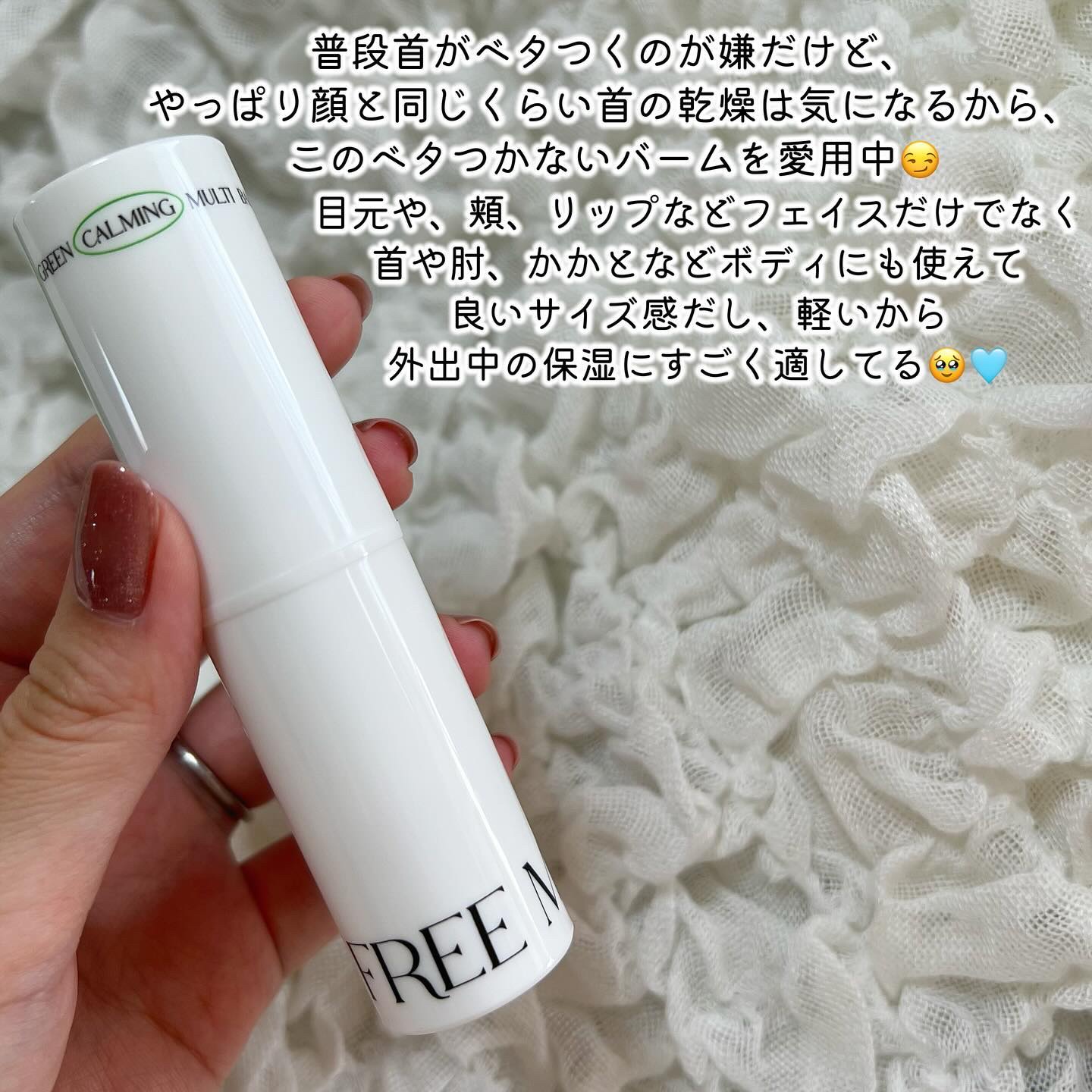 たった3秒で水分チャージ! 持ち歩く水分バーム🫧 バッグにもすっぽり入るサイズなので外出先での保湿ケアにぴったり! なめらかなつけ心地でベタつき感なく肌にやさしく伸びてくれるよ🙌 スティックタイプなので目元や唇にもササっと塗りやすい! 首や肘、かかとなどのカサつきやすい部分に使うのもおすすめだよ🫶🏻