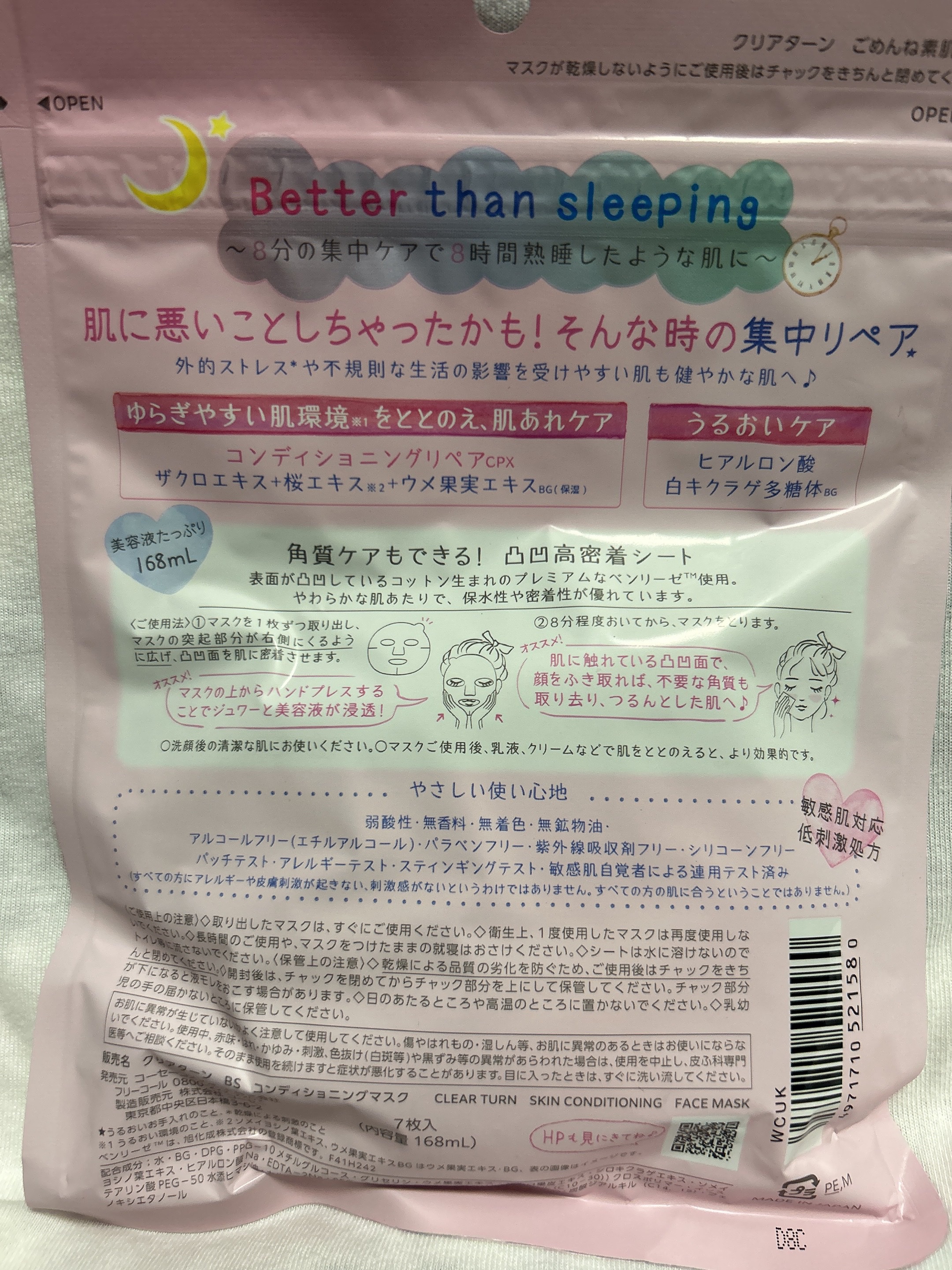 - 【クリアターン ごめんね素肌マスク】 負担をかけて、あれてしまった肌の素肌環境※1をととのえる“速攻集中リペア※2マスク”です。 ① あれがちな肌を素早くコンディションケア! ザクロエキス、桜エキス※3、ウメ果実エキスBG配合し、ゆらぎやすい肌環境をととのえ、肌あれをケアします。また、うるおいケア成分として、ヒアルロン酸、白キクラゲ多糖体BGを配合。外的ストレス※4や不規則な生活の影響を受けやすい肌も健やかでゆらぎにくい肌へみちびきます。 ②敏感肌も使える、弱酸性・低刺激処方 無香料・無着色・無鉱物油・アルコールフリー(エチルアルコール)・パラベンフリー・紫外線吸収剤フリー・シリコーンフリー・パッチテスト済み・アレルギーテスト済み・スティンギングテスト済み・敏感肌自覚者による連用テスト済み(すべての方にアレルギーや皮膚刺激が起きない、刺激感がないというわけではありません。すべての方の肌に合うということではありません。) ③角質ケアもできる!凸凹高密着シート コットン生まれのやわらかな肌触りのベンリーゼを使用。 表面に凸凹のエンボス加工を施しているため、密着性が高く、はがしたマスクでやさしく顔をふきとることで角質ケアもできます。 ※1 うるおい環境のこと ※2 うるおいお手入れのこと ※3 ソメイヨシノ葉エキス、ウメ果実エキスBGはウメ果実エキス・BG(保湿) ※4 乾燥による刺激のこと