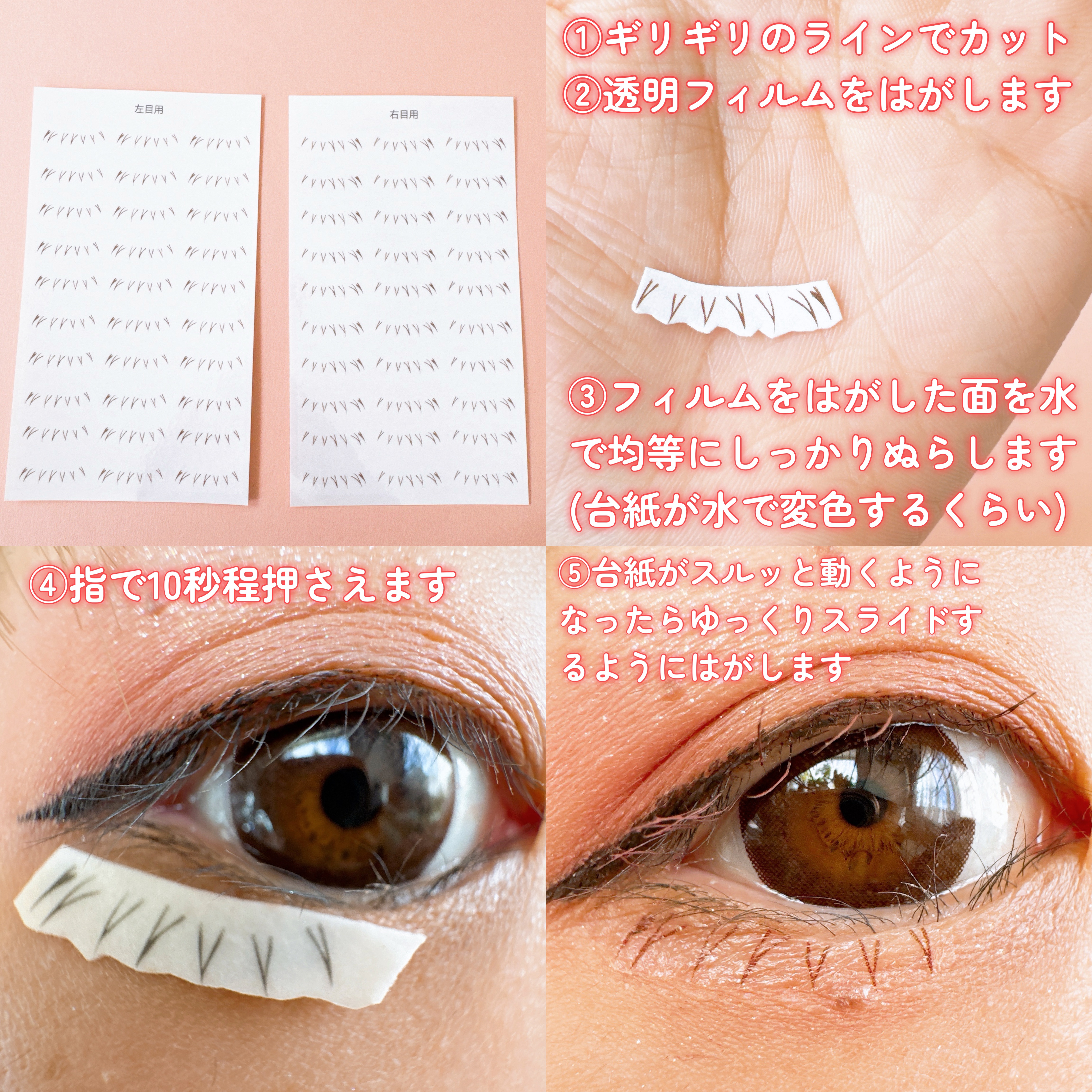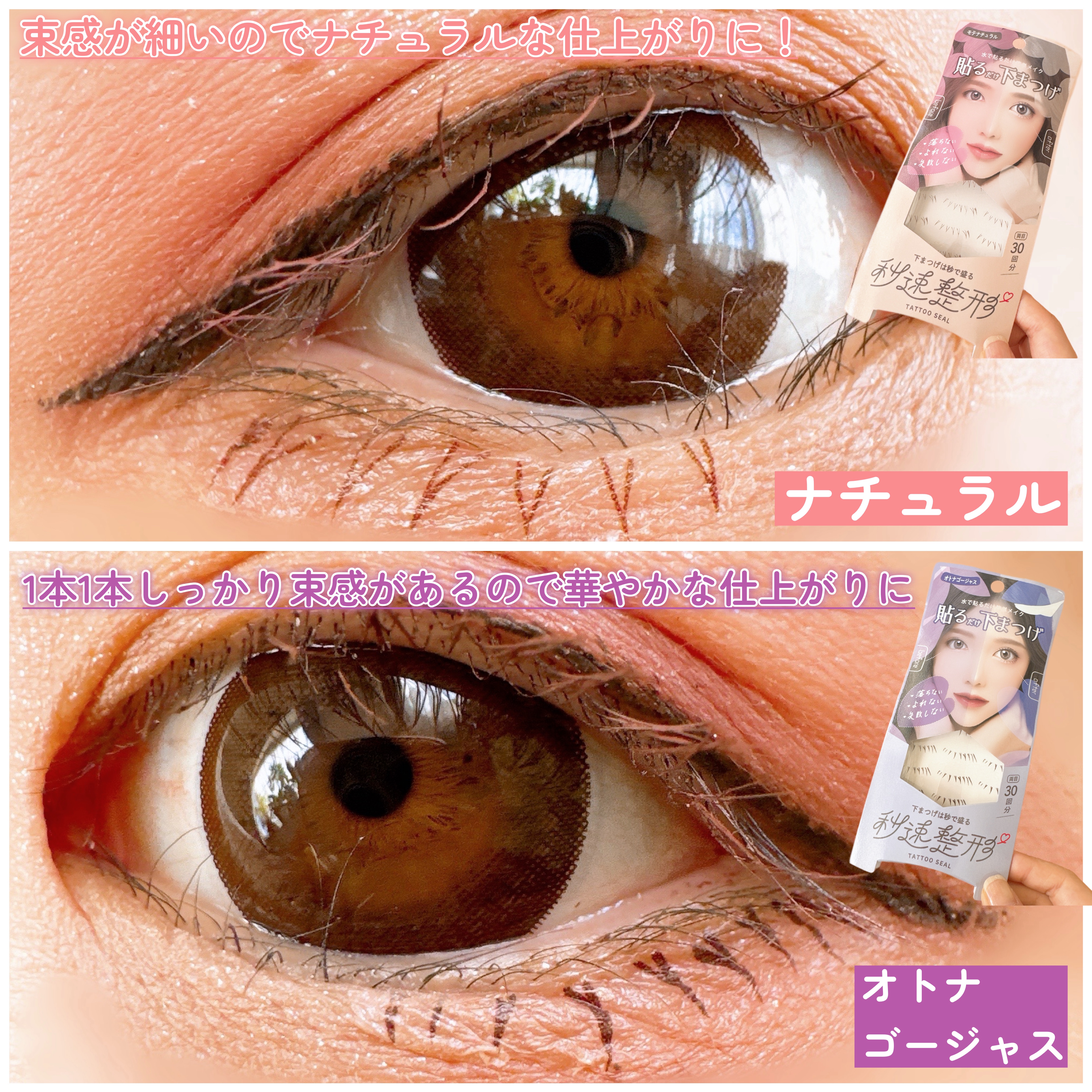 モテナチュラルは束感が細いので自然な仕上がり。 オトナゴージャスは1本1本しっかり束感があるため華やかな仕上がり。 使用方法は簡単! カットして水に濡らして貼るだけ。 アイラインで下まつ毛描くよりもヨレにくくて持ちがいいよ。 少しテカリが気になるけど上からアイシャドウ載せたらカバーできる◎