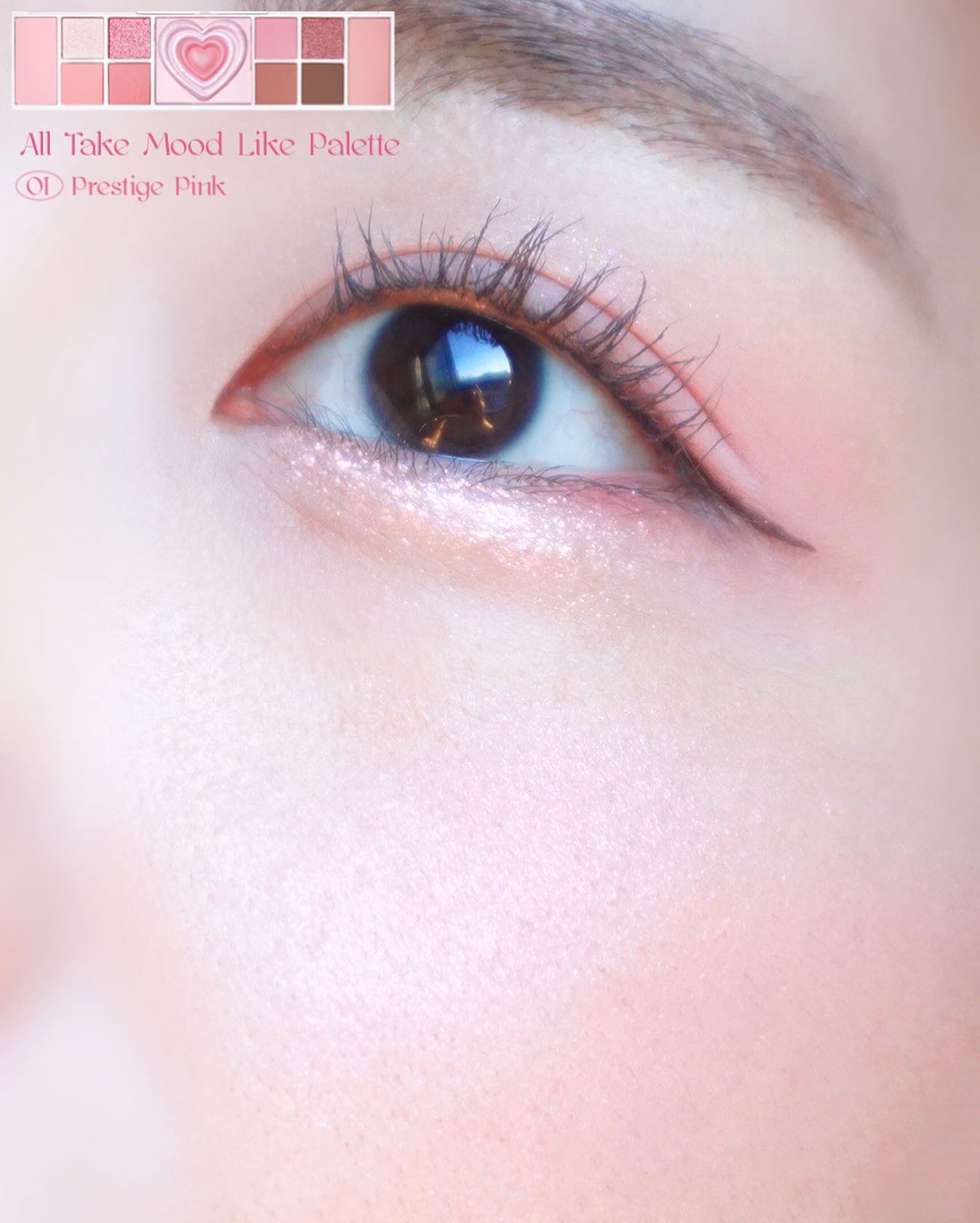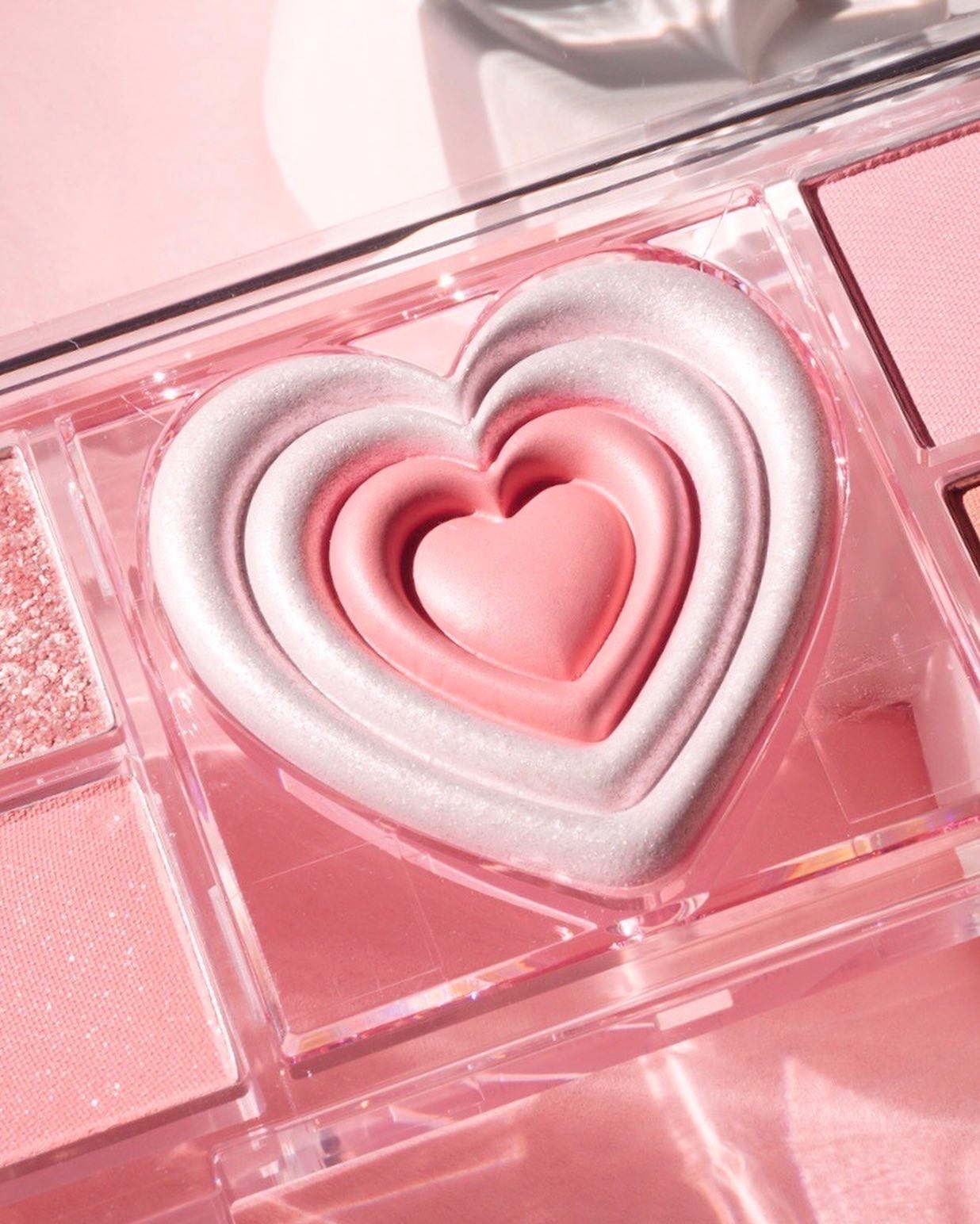 キュートでかわいらしい雰囲気のピンクアイメイクが叶うパレット💗🎀 マットシャドウは粉質がサラッとしていて軽く、ふわっと境目なく色づいてくれます🙏 真ん中のハート型ベイクドチークは、やや透け感が感じられるかわいいピンク発色でほんのりパールのような輝きがありサラッとしたハイライターのようなテクスチャーに感じられました🙌 マットシャドウは一塗りでふわっと透け感がありながらも見たままの色がきちんと色づいてくれます👍 時間が経っても肌に馴染みながら塗りたての仕上がりを維持してくれます✨