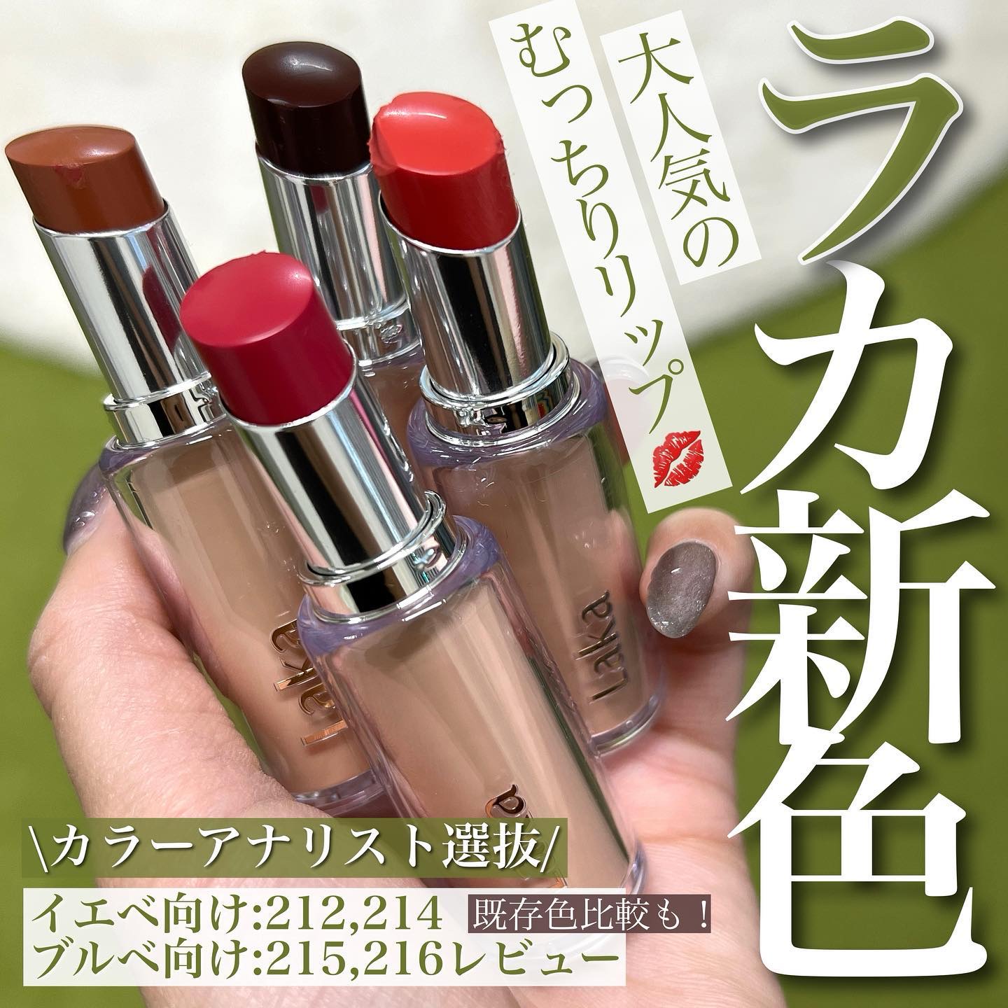 - Point1 透き通った気品が感じられるカラー ユニークなヌードカラーから自然なニュートラルカラー、深くて密度のあるポイントカラーまで、さまざまな好みに合わせた幅広いカラーバリエーション。それぞれのカラーが持つ明度や彩度に合わせて透明感を細かく調整しているため、グラデーションリップやオーバリップなど、プロが施したようなさまざまなリップメイクが楽しめます。また、夕方の暗い空間や、室内の光の下でも、唇本来の色にリップスティックのカラーが馴染み、水彩画のようなナチュラルな発色で、自然な血色感のある唇に演出します。 Point2 光に包まれたガラス玉のようなきらめき Lakaならではの「ボンディンググロウ」フォーミュラで、唇に触れた瞬間、体温でやさしく溶けていくようなテクスチャー。しっとりと馴染んで密着しながら唇をコーティングしてくれます。高い屈折率で光を強く反射させるハイシャインオイルコンプレックスを配合し、光沢感のある生き生きとしたリップカラーを実現しました。