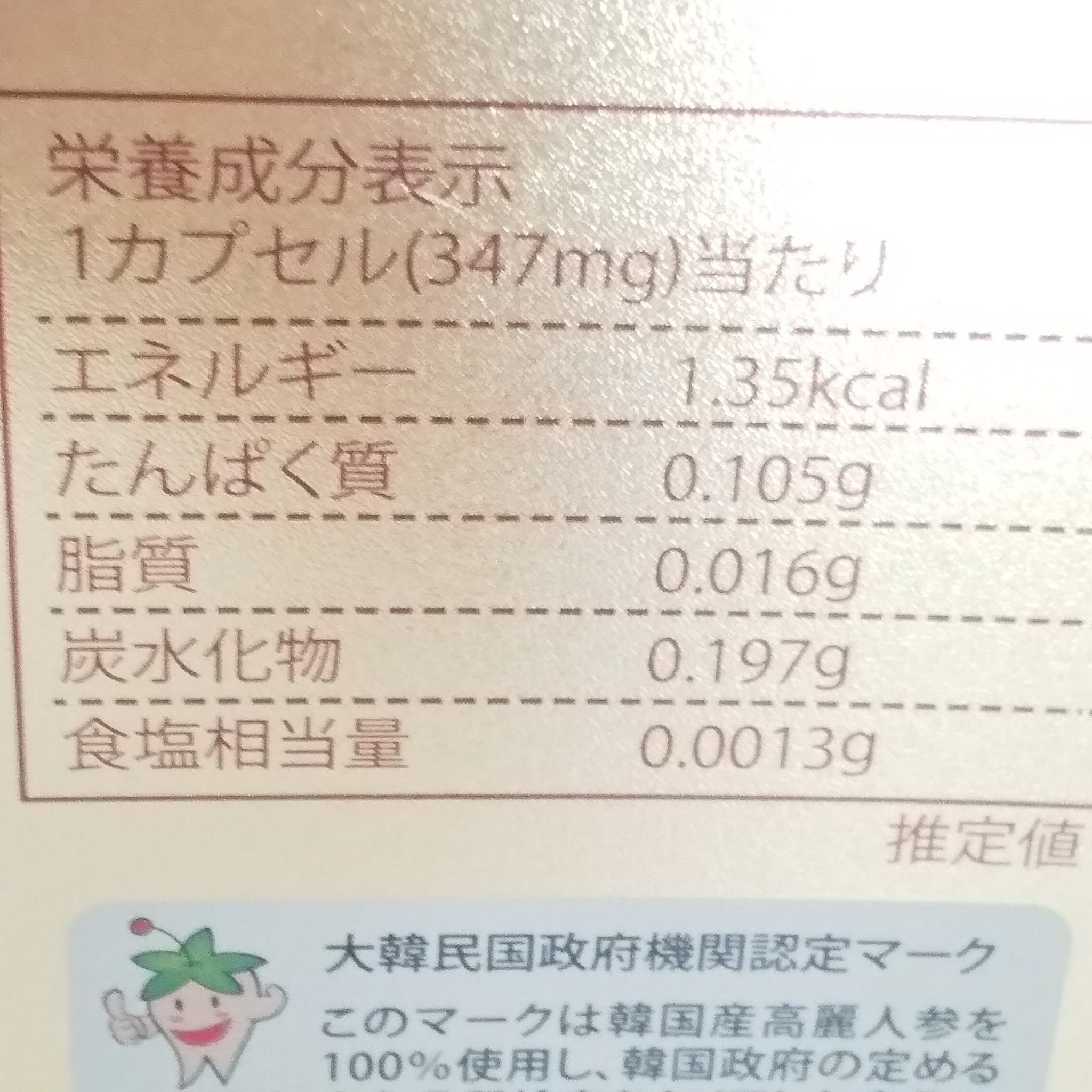 - ■高麗人参特有成分「ジンセノサイド」を含有 韓国産6年根高麗人参を水洗いし、約60℃以上の蒸気で蒸して乾燥したプレミアム高麗人参*3)を産地(プンギ)から購入し、その後、原料(紅参)を40℃以下の温度で抽出して一番搾りの紅参エキスを作ります。6倍濃縮した後に、品質検査及び原料規格書に適合しているかどうかを確認し適合と判定された原料のみを使用し、高麗人参特有の成分『ジンセノサイド』が1粒に31mgも入ったサプリメントです。*3)6年根の紅参をメーカーではプレミアム高麗人参としています ■高麗人参エキスを6倍濃縮し作られた100%の高濃度粉末 配合している高麗人参エキス粉末は紅参エキスを6倍濃縮して、更に、凍結乾燥で水分を飛ばして100%の高濃度*4)粉末にしました。*4)高濃縮・高濃度はメーカー比(ドリンクタイプの原料との比較) ■飲みやすいカプセル仕様 高麗人参特有の味(苦味)と匂い(土臭さ)を敬遠する多くの日本のお客様のために、ハードカプセルに詰めました ■現代人のライフスタイルに合わせたサプリメント 健康食材「高麗人参」を健康と美容の維持に興味のある方、いつまでも活き活きと、美しく毎日を過ごして頂きたいとの思いを込め、手軽に高麗人参パワーを取り入れられるようにしました。