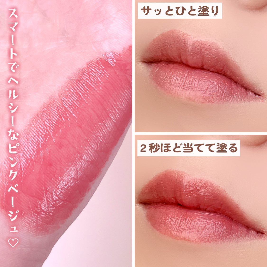 塗って時間が経つと唇の凹凸をなめらかにして密着し、ぷるんとしたボリューム感のある唇に♡♡ サラッとしたなめらかなテクスチャーで軽いつけ心地でベタつきもないため、塗っても不快感がなく使いやすいです😊 今回の新色は穏やかな春風のようにより一層柔らかくなった果実をイメージしたレイジーベージュカラー!!