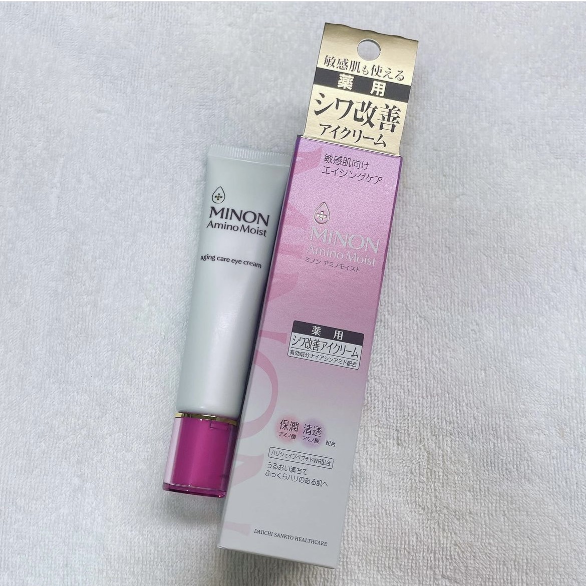 - 【敏感肌も使える薬用シワ改善アイクリーム】 ダブルの有効成分配合。気になるシワを改善し、しみ・そばかす*1、肌あれを防ぎます。 ●ナイアシンアミド:シワ改善&しみ予防 ●グリチルリチン酸2K:肌あれ予防 ハリを与えつや肌に導く「ハリシェイプペプチドWR*2」配合。 使い続けるたび、シワを改善し、うるおってハリのある明るい印象の目元へ。 エイジングケア:年齢に応じたお手入れケア *1メラニンの生成を抑え、しみ・そばかすを防ぐ *2ヤシ油脂肪酸水解コラーゲンK (販売名:ミノンアミノモイストAE)【医薬部外品】