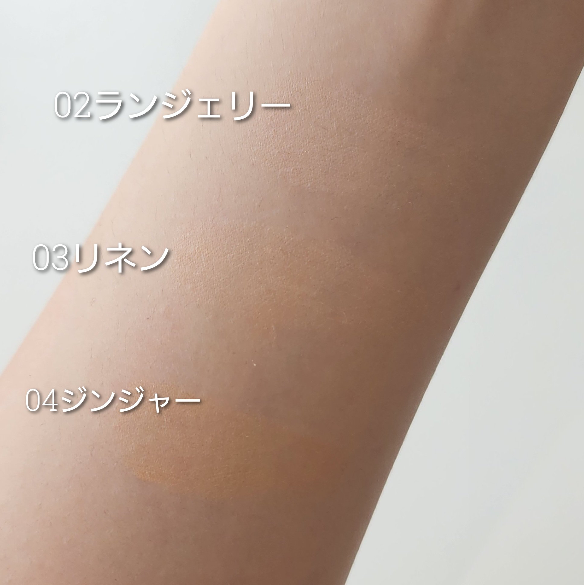 - <02 ランジェリー(LINGERIE)> 水、ジフェニルシロキシフェニルトリメチコン、メトキシケイヒ酸エチルヘキシル、ジ安息香酸PG、シクロペンタシロキサン、サリチル酸エチルヘキシル、セチルPEG/PPG-10/1ジメチコン、グリセリン、(ジイソステアリン酸/ポリヒドロキシステアリン酸/セバシン酸)ポリグリセリル-4、水添ロジン酸メチル、ナイアシンアミド、トリメリト酸トリトリデシル、イソドデカン、オクチルドデカノール、1,2-ヘキサンジオール、ペンタイソステアリン酸ジペンタエリスリチル、水添ポリイソブテン、ステアラルコニウムヘクトライト、硫酸Mg、合成フルオロフロゴパイト、イソステアリン酸ポリグリセリル-4、ステアリン酸、アルミナ、トリイソステアリン酸イソプロピルチタン、水酸化Al、香料、アデノシン、エチレンジアミンジコハク酸3Na、トリエトキシカプリリルシラン、加水分解ヒアルロン酸、フィトステロールズ、コラーゲンエキス、酸化チタン、酸化鉄 <03 リネン(LINEN)> 水、ジフェニルシロキシフェニルトリメチコン、メトキシケイヒ酸エチルヘキシル、ジ安息香酸PG、シクロペンタシロキサン、サリチル酸エチルヘキシル、セチルPEG/PPG-10/1ジメチコン、グリセリン、(ジイソステアリン酸/ポリヒドロキシステアリン酸/セバシン酸)ポリグリセリル-4、水添ロジン酸メチル、ナイアシンアミド、トリメリト酸トリトリデシル、イソドデカン、オクチルドデカノール、1,2-ヘキサンジオール、ペンタイソステアリン酸ジペンタエリスリチル、水添ポリイソブテン、ステアラルコニウムヘクトライト、硫酸Mg、合成フルオロフロゴパイト、イソステアリン酸ポリグリセリル-4、ステアリン酸、アルミナ、トリイソステアリン酸イソプロピルチタン、水酸化Al、香料、アデノシン、エチレンジアミンジコハク酸3Na、トリエトキシカプリリルシラン、加水分解ヒアルロン酸、フィトステロールズ、コラーゲンエキス、酸化チタン、酸化鉄 <04 ジンジャー(GINGER)> 水、ジフェニルシロキシフェニルトリメチコン、メトキシケイヒ酸エチルヘキシル、ジ安息香酸PG、シクロペンタシロキサン、サリチル酸エチルヘキシル、セチルPEG/PPG-10/1ジメチコン、グリセリン、(ジイソステアリン酸/ポリヒドロキシステアリン酸/セバシン酸)ポリグリセリル-4、イソドデカン、オクチルドデカノール、水添ロジン酸メチル、ナイアシンアミド、トリメリト酸トリトリデシル、1,2-ヘキサンジオール、ペンタイソステアリン酸ジペンタエリスリチル、水添ポリイソブテン、ステアラルコニウムヘクトライト、硫酸Mg、イソステアリン酸ポリグリセリル-4、合成フルオロフロゴパイト、ステアリン酸、トリイソステアリン酸イソプロピルチタン、アルミナ、水酸化Al、香料、アデノシン、エチレンジアミンジコハク酸3Na、トリエトキシカプリリルシラン、加水分解ヒアルロン酸、フィトステロールズ、コラーゲンエキス、酸化チタン、酸化鉄
