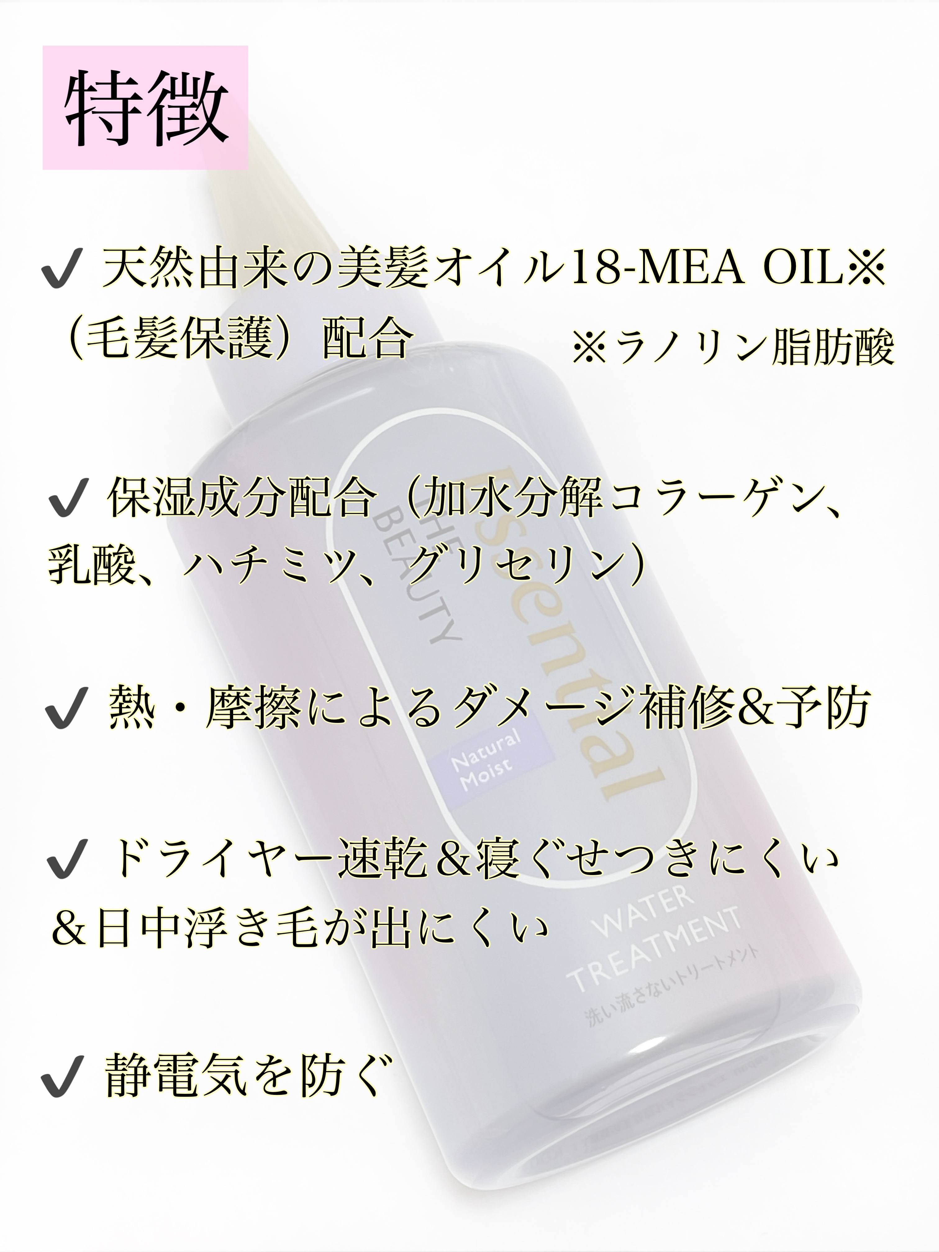 - ※2025年9月06日〜順次パッケージリニューアル。尚、リニューアルにかかる返品交換等は承っておりません。 広がる、パサつく髪に。 洗い流さないウォータートリートメント。 美容ウォーターが浸透。 持続型ウォーターヴェールで、ちゅるんとまとまり髪、1日続く。 〇熱・摩擦によるダメージ補修&予防 〇ドライヤー速乾&寝ぐせがつきにくい 〇厳選した補修美容成分配合<天然由来の美髪オイル18-MEA OIL(ラノリン脂肪酸)・加水分解コラーゲン・乳酸・ハチミツ・グリセリン> 〇静電気を防ぐ 〇ときめくホワイトピーチ&ムスクの香り