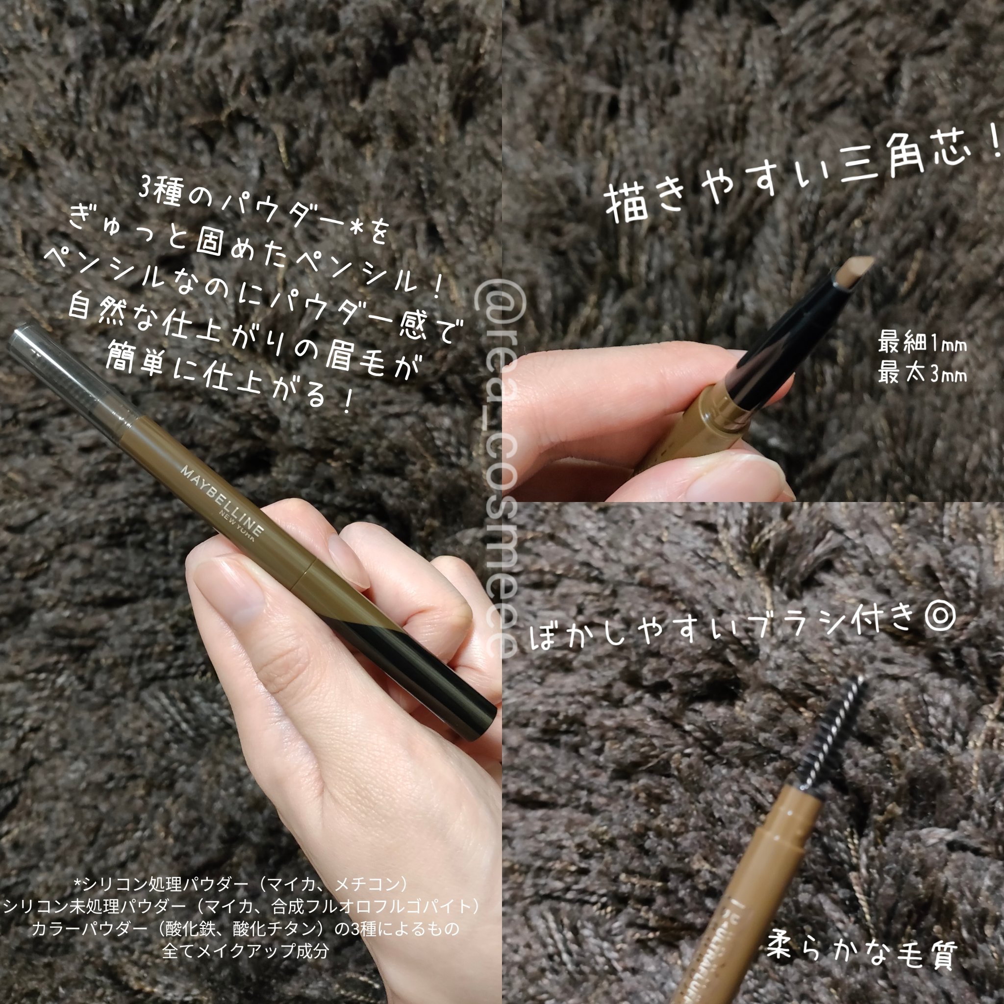 - <2020年3月14日「ファッションブロウ パウダーインペンシル」から「ファッションブロウ パウダーインペンシル N」に名称変更> パウダーのようなふんわり自然な仕上がりなのに、眉毛にしっかり密着、落ちにくい。長時間*²、自然な仕上がりをキープしてくれます。汗・水にも強いウォータープルーフタイプ。 ■1本で様々なラインが自由自在に描ける三角カット芯 角:眉尻もラクラク描き足せる。 表面:眉頭や眉全体に自然な立体感を。 ■・密着パウダー成分配合 描くだけでパウダーのようなふんわりぼかした印象に。しかも眉毛に密着するから長時間*² 仕上がりキープ。 *2 メイベリン ニューヨーク調べ(個人差があります)。