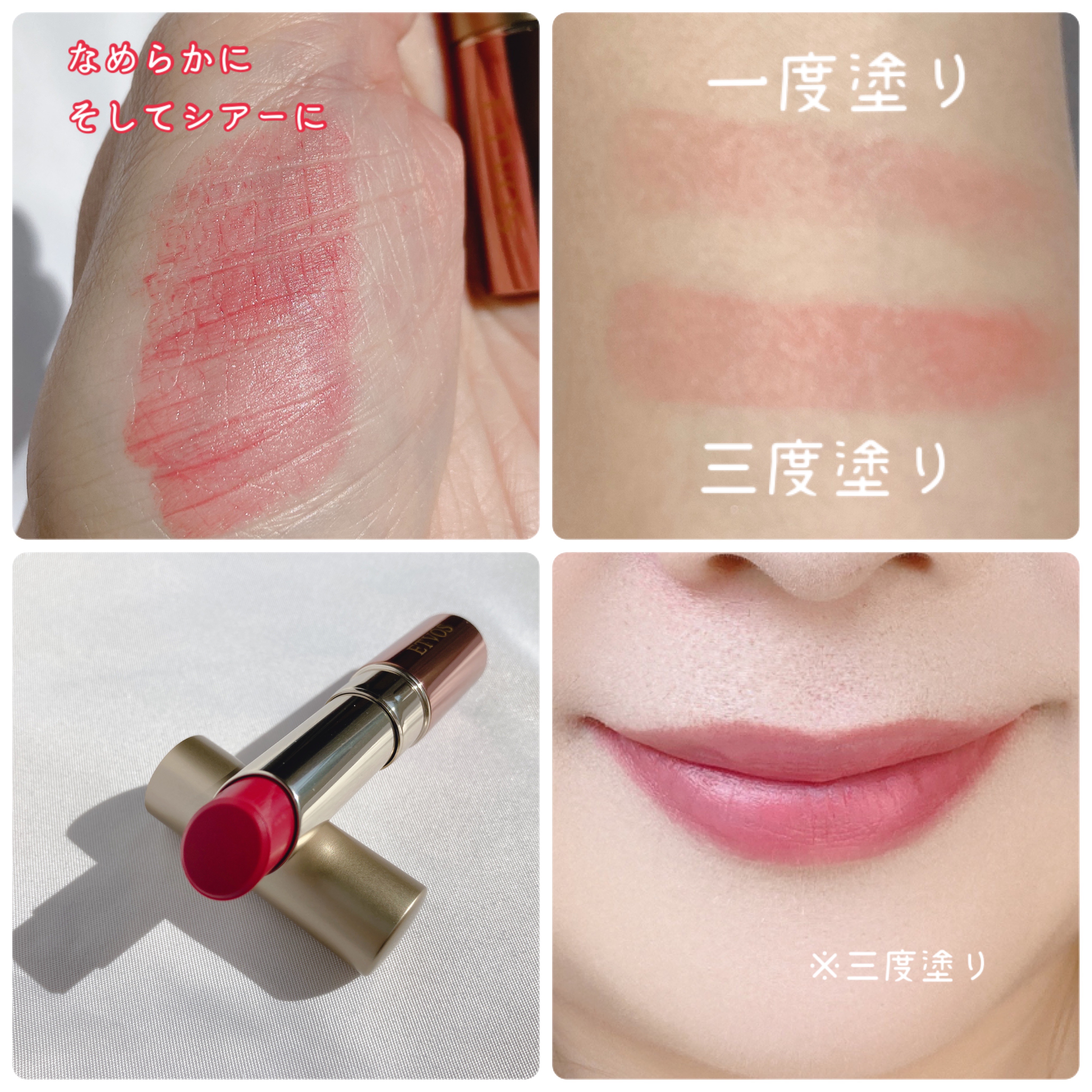 タッチプルーフ成分配合で、動きに強い膜を形成するため、こすれに強く、化粧もちが良いです。 ツヤっと見えるのに少し経つとサラサラの質感になり、マスクにつきにくいのが嬉しいポイント! スティックは体温でとろけるような感覚でスルスルぬれて、肌負担はありません。