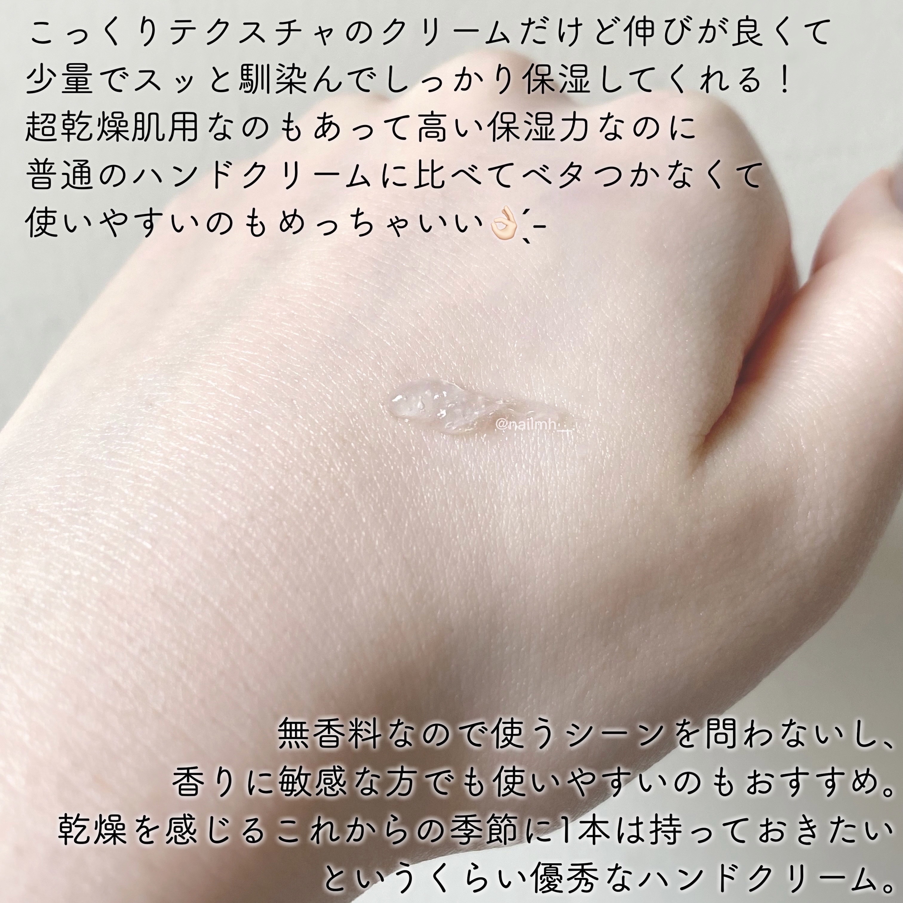 - 角層のすみずみまで、すばやく浸透*濃厚な保湿力で乾燥をケア 超高保湿 しっとりクリームタイプ 無香料 ガサガサに荒れた超乾燥肌をヴェールのように包み込み、うるおいに満ちた柔らかな手肌へ。 毎日のうるおいケアで、1日中しっとり感が続きます。肌なじみが良く、ベタつきのないテクスチャー。 1回の使用量は真珠粒大で十分なので、1本で約200回使えます。 *角層まで フランス製