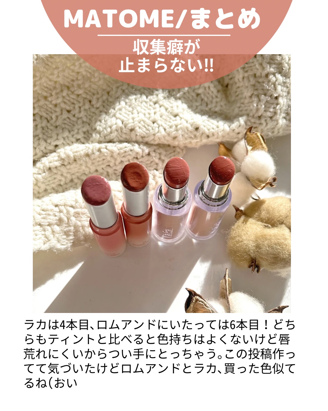 やっぱりいちばん好きなロムアンド🥰 好みが分かれるテクスチャーだけどこのもっちゃりした粘度の高さがあるからこそバームリップなのに落ちにくい👏 透明感のあるカラーからしっかり濃い目のカラーまで PCごとに豊富なバリエーションがあるのも良し♡ バームなので唇に優しいのもいいよね☺️