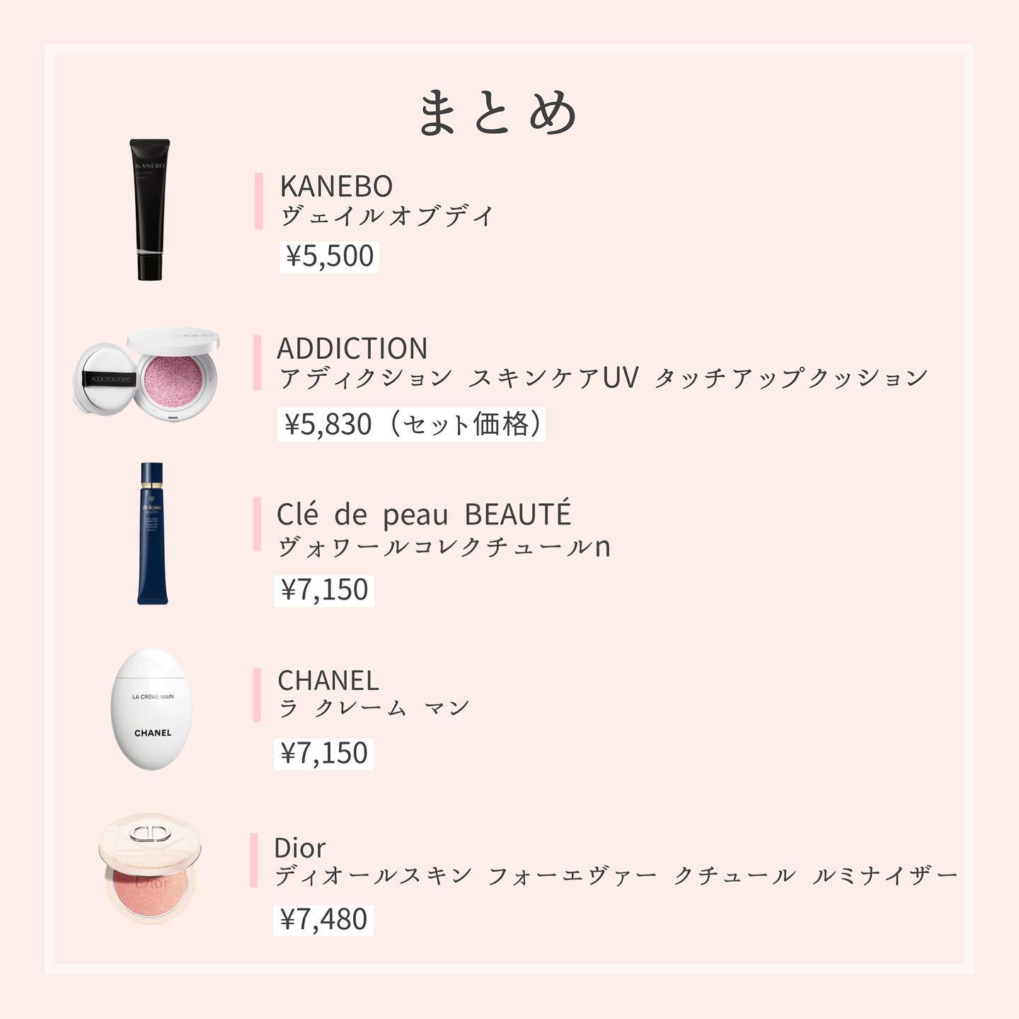 使用コスメはこちら↓ 1.エリクシール ルフレ おしろいミルクc 35g ¥1,980 2.Dr G トーンアップサンプラス 50ml ¥2,140 3.ラ ロッシュ ポゼUVイデアXLプロテクショントーンアップローズ30ml ¥3,960 4.espoir ピーチスキンフィッティングベースAll NEW 30ml ¥3,300 5.LANCOME UVエクスペールBB n 30ml ¥6,930 6.Dior ディオール プレステージ ホワイト ル プロテクターUV ミネラルBB 00 30ml ¥15,180 7.KANEBO ヴェイルオブデイ 40g ¥5,500 8.ORBIS リンクルブライトUVプロテクター 50g ¥3,850 9.ナンバーズイン 3番ノーファンデ陶器肌トーンアップクリーム 50ml ¥2,310 10.Paul&Joe プロテクティング ファンデーションプライマー 01 30ml ¥3,850