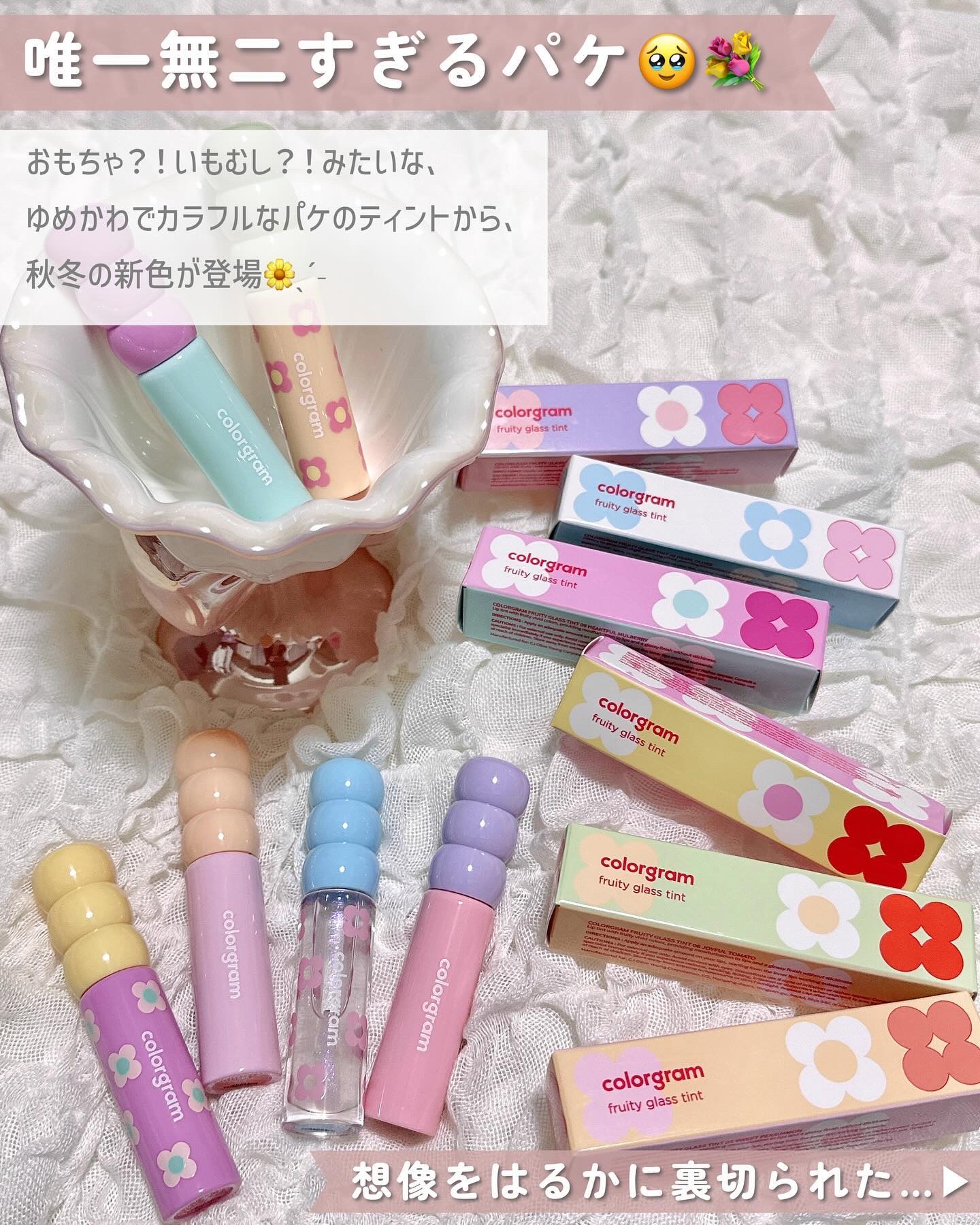 パッケージが可愛すぎると話題の colorgram(カラーグラム)のタンフルグラスティント💄 塗った感じはツヤっと潤い感、なじませるとぷるぷるつやつや💋 この仕上りがこのティントの最大の魅力❤ 重ねて塗れば塗るほどカラーも鮮明になりツヤ感もUP❢