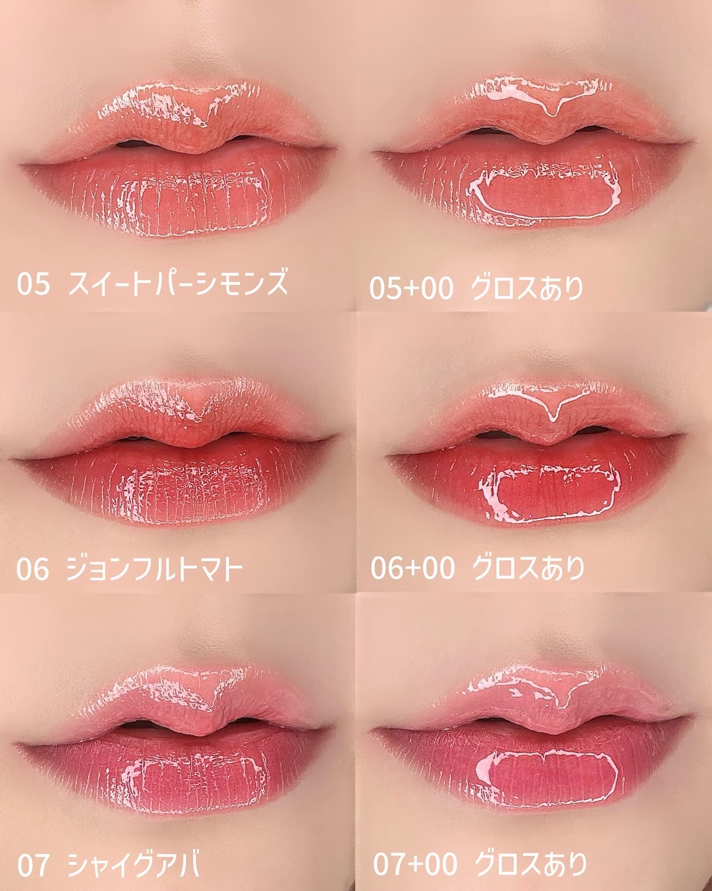 - <00.PEARL GLOSS> 水添ポリイソブテン、カプリル酸/カプリン酸トリグリセリド、リンゴ酸ジイソステアリル、パルミチン酸デキストリン、乳酸メンチル、1,2-ヘキサンジオール、ホウケイ酸アルミニウムカルシウム、香料、二酸化チタン。、酸化スズ <01.FLASHING APRICOT> 精製水、アジピン酸ビス-ジグリセリルポリアクリル-2、マレイン酸ジイソステアリル、ジフェニルジメチコン、オクチルドデカノール、グリセリン、セチルPEG/PPG-10/1ジメチコン、ジプロピレングリコール、エチルセルロース、イソステアリン酸ソルビタン、ペンチレングリコール、アクリル酸ヒドロキシエチル/アクリロイルジメチルタウリン酸ナトリウム共重合体、スクワラン、セテアレス-20、ステアロイルグルタミン酸ナトリウム、二酸化チタン、エタノール、フェノキシエタノール、ポリソルベート60、香料、カプリル酸グリセリル、黄色4号5、イエローNO. 227、エチルヘキシルグリセリン、赤色NO. 104、レッドNO. 1 (XNUMX)、水酸化アルミニウム、ポリアクリル酸アンモニウム、ブチレングリコール、テトラ-ジ-T-ブチルヒドロキシヒドロ桂皮酸ペンタエリスリチル <02.DEWY GRAPEFRUIT> 精製水、アジピン酸ビス-ジグリセリルポリアクリル-2、マレイン酸ジイソステアリル、ジフェニルジメチコン、オクチルドデカノール、グリセリン、セチルPEG/PPG-10/1ジメチコン、ジプロピレングリコール、エチルセルロース、イソステアリン酸ソルビタン、ペンチレングリコール、アクリル酸ヒドロキシエチル/アクリロイルジメチルタウリン酸Na、スクワラン、セテアレス-20、ステアロイルグルタミン酸Na、エタノール、二酸化チタン、フェノキシエタノール、ポリソルベート60、香料、カプリル酸グリセリル、黄色5号227、レッドNO. 4、イエローNO. 104、エチルヘキシルグリセリン、赤色NO. 1 (XNUMX)、水酸化アルミニウム、ポリアクリル酸アンモニウム、ブチレングリコール、テトラ-ジ-T-ブチルヒドロキシヒドロ桂皮酸ペンタエリスリチル <03.SODA COOL PEACH> 精製水、アジピン酸ビスジグリセリルポリアクリル酸-2、マレイン酸ジイソステアリル、ジフェニルジメチコン、オクチルドデカノール、グリセリン、セチルPEG/PPG-10/1ジメチコン、ジプロピレングリコール、エチルセルロース、イソステアリン酸ソルビタン、ペンティレングリコール、アクリル酸ヒドロキシエチル/アクリロイルジメチルタウリン酸Na、スクワラン、セテアレス-20、ステアロイルグルタミン酸Na、エタノール、フェノキシエタノール、二酸化チタン、ポリソルベート60、香料、カプリル酸グリセリル、赤色NO. 104 (1)、エチルヘキシルグリセリン、黄色No. 5、レッドNO. 227、イエローNO. 4、水酸化アルミニウム、ポリアクリル酸アンモニウム、青色NO. 1、ブチレングリコール、ペンタエリスリチルテトラ-ジ-T-ブチルヒドロキシヒドロシンナメート <04.ADORABLE BERRY> 精製水、アジピン酸ビス-ジグリセリルポリアクリル-2、マレイン酸ジイソステアリル、ジフェニルジメチコン、オクチルドデカノール、グリセリン、セチルPEG/PPG-10/1ジメチコン、ジプロピレングリコール、エチルセルロース、イソステアリン酸ソルビタン、Pエチレングリコール、アクリル酸ヒドロキシエチル/アクリロイルジメチルタウリン酸Na、スクワラン、セテアレス-20、ステアロイルグルタミン酸Na、エタノール、フェノキシエタノール、ポリソルベート60、香料、カプリル酸グリセリル、赤色NO. 104 (1)、二酸化チタン、エチルヘキシルグリセリン、赤色 NO. 227、イエローNO. 5、イエローNO. 4、水酸化アルミニウム、ポリアクリル酸アンモニウム、ブチレングリコール、テトラ-ジ-T-ブチルヒドロキシヒドロケイ皮酸ペンタエリスリチル、青色NO. 1 <05.SWEET PERSIMMON> 精製水、ポリアシルアジピン酸ビスジグリセリル-2、マレイン酸ジイソステアリル、ジフェニルジメチコン、オクチルドデカノール、グリセリン、セチルPEG/PPG-10/1ジメチコン、ジプロピレングリコール、エチルセルロース、イソステアリン酸ソルビタン、ペンチレングリコール、アクリル酸ヒドロキシエチル/ナトリウムアクリロイルジメチルタウリン共重合体、スクワラン、セテアレス-20、ステアロイルグルタミン酸Na、エタノール、二酸化チタン、フェノキシエタノール、ポリソルベート60、香料、黄色5号、カプリル酸グリセリル、赤色227号、エチルヘキシルグリセリン、水酸化アルミニウム、ポリアクリル酸アンモニウム、黄色4号、赤色104号(1)、青色1号、ブチレングリコール、ペンタエリスリチルテトラ-ジ-t-ブチルヒドロキシヒドロシンナメート <07.SHY GUAVA> 精製水、ポリアシルアジピン酸ビスジグリセリル-2、マレイン酸ジイソステアリル、ジフェニルジメチコン、オクチルドデカノール、グリセリン、セチルPEG/PPG-10/1ジメチコン、ジプロピレングリコール、エチルセルロース、イソステアリン酸ソルビタン、ペンチレングリコール、アクリル酸ヒドロキシエチル/ナトリウムアクリロイルジメチルタウリン共重合体、ス