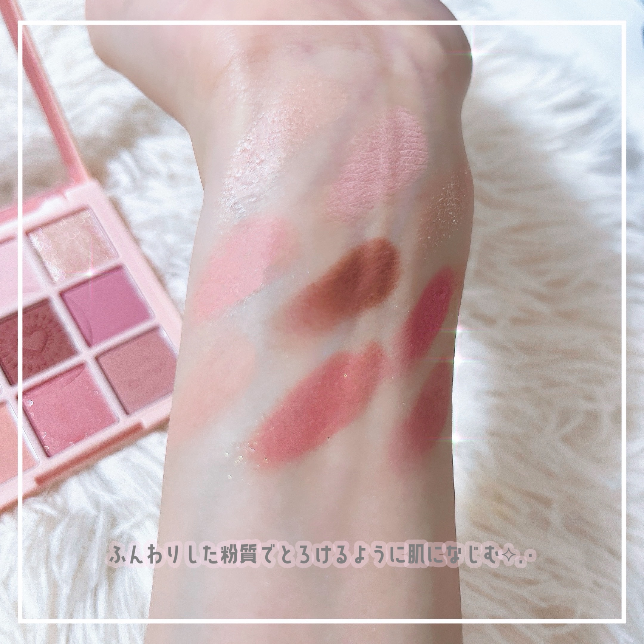 箱も中身もかわいいアイシャドウで 箱も大事に保管中です。 発色が良いので、ブラシでのせて調整。 粉質がふんわりサラサラで好き。 ラメがザクザク! 指でポンポンと少しずつのせました。 ほんの少しのせるのが可愛い◎ 涙袋もこのパレットで。 ライトピンクカラーが大活躍。 ぷっくりした涙袋が簡単に作れちゃいます。 発色、粉質も好きなのですが、 色持ちが良い!! アイシャドウベース無しでも きれいなまま1日過ごすことができました。 ぜひ動画で、スウォッチも見てください。 ラメがキラキラ〜