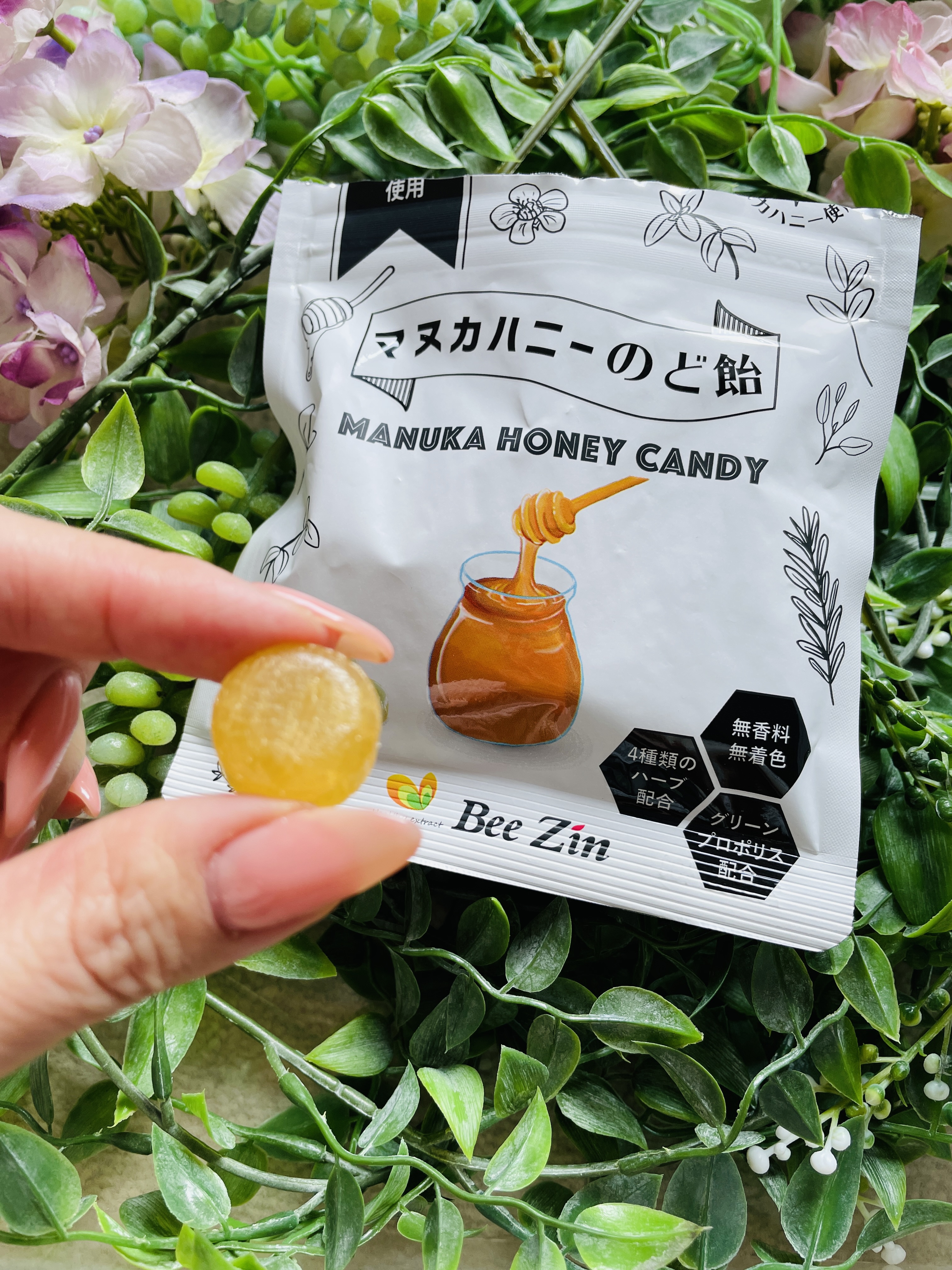 - ■「Bee Zin マヌカハニーのど飴」4つの特徴 1. ニュージーランド産MGO550+品質のマヌカハニーを使用。 2. グリーンプロポリス配合 3. のどに嬉しい4種のハーブ(ローズマリー、オレガノ、タイム、セージ)配合 4. 持ち運びしやすいチャック付きアルミパック入り