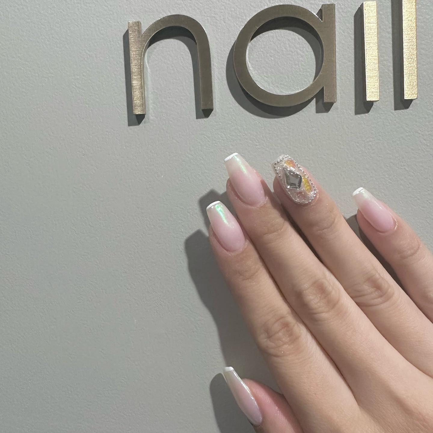 ふんわり優しいシアーなミルクホワイトで おまかせストーンネイル✧·˚⌖. ꙳ 指によって並べ方も色々変えて可愛い……👼🏻💘✨ 冬っぽさも満点ෆ🎧❄ 「ネイルめっちゃかわいいし、 KPOPトークできるネイリストさん 初めて出会いました🥺💝」 って喜んでくださって嬉し(⸝⸝´꒳`⸝⸝)💋