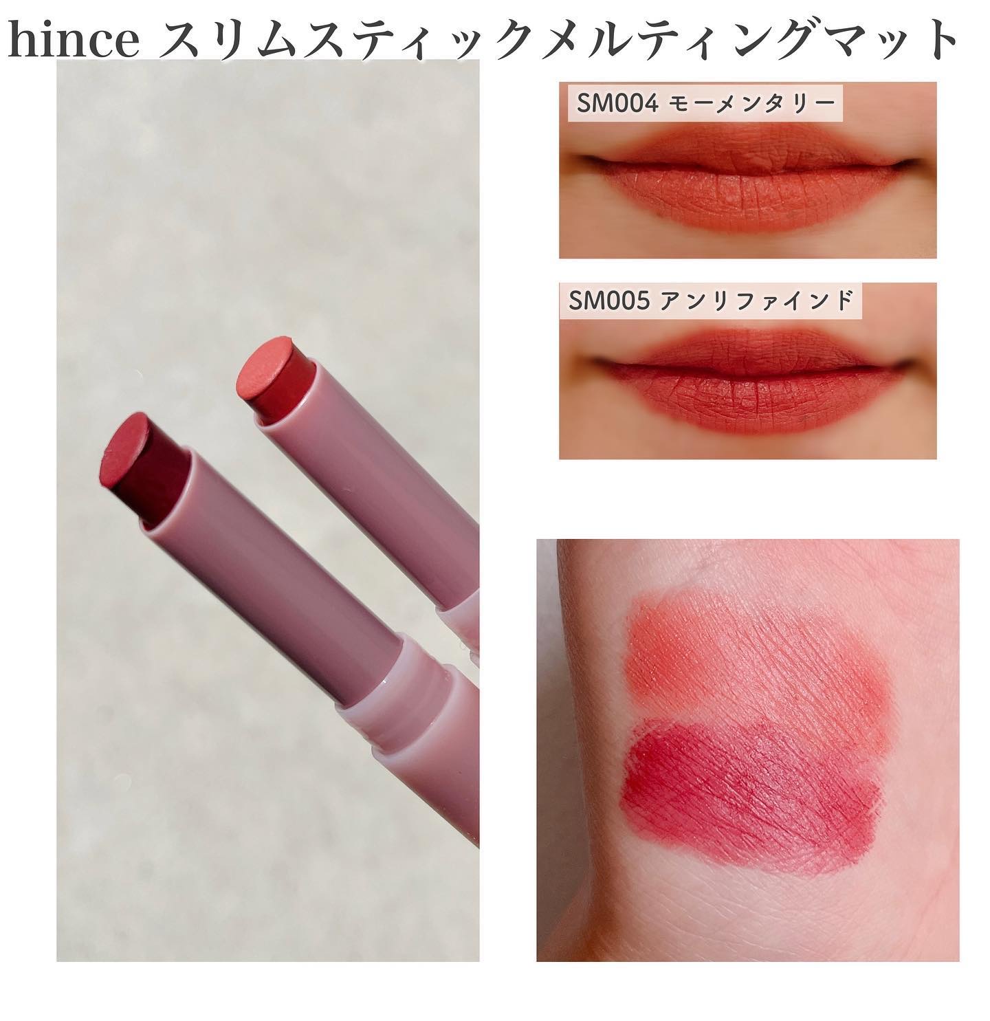 - ◇マットでありながらも唇を滑らすようななめらかな塗り心地 唇にやさしく溶け込み、心地よいスライディング感と軽い密着感を実現。ブラー効果機能でグラデーションカラーを簡単に作ることができます。 ◇角質の浮き上がりや乾燥を防ぐ高保湿テクスチャー 保湿オイル成分を12%配合。一日中唇に快適な使用感を与える安心ヴィーガンフォーミュラ(韓国ヴィーガン認証院)。 ◇薄く軽やかに塗ることができレイヤリングしても鮮やかな発色 落ち着きつつも鮮やかなソフトミューテッドカラー。薄く重ねれば重ねるほど鮮やかに発色し、仕上がりを自由に調整できます。 2023年9月1日(金)より公式オンラインストア、楽天、Qoo10にて先行発売、9月14日(木)よりhince AOYAMA、hinceルミネエスト新宿店、hinceルクアイーレ店にて発売