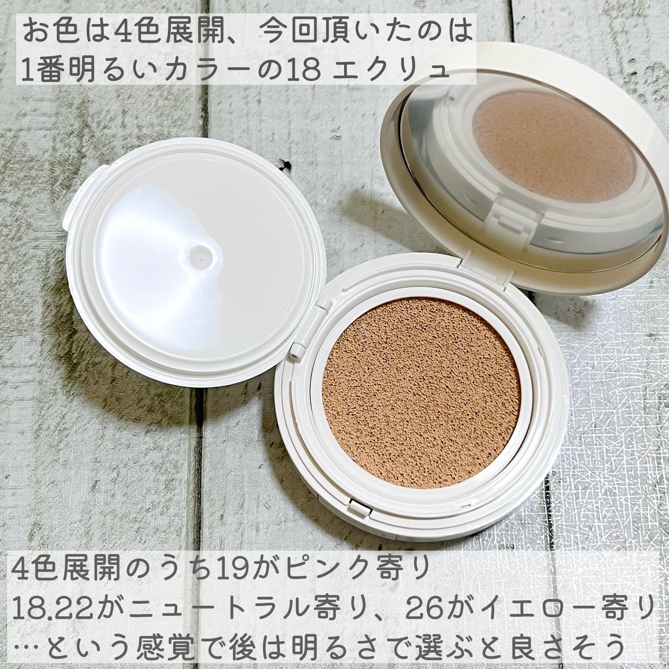 - <18 ecru> 水、シクロペンタシロキサン、酸化チタン、メトキシケイヒ酸エチルヘキシル、メタクリル酸メチルクロスポリマー、酸化亜鉛、サリチル酸エチルヘキシル、ジメチコン、プロパンジオール、セチルPEG/PPG-10/1ジメチコン、グリセリン、ペンチレングリコール、メチルトリメチコン、ナイアシンアミド、カプリリルメチコン、黄酸化鉄、BG、シリカ、ラウリルPEG-10トリス(トリメチルシロキシ)シリルエチルジメチコン、フェノキシエタノール、硫酸Mg、水酸化Al、イソステアリン酸ソルビタン、(ジメチコン/ビニルジメチコン)クロスポリマー、ジステアルジモニウムヘクトライト、ステアリン酸、ベンガラ、黒酸化鉄、トリエトキシカプリリルシラン、香料、エチルヘキシルグリセリン、アデノシン、エチレンジアミンジコハク酸3Na、テトラ(ジ-t-ブチルヒドロキシヒドロケイヒ酸)ペンタエリスリチル、トコフェロール、パルミチン酸スクロース、水添レシチン、マカデミア種子油、オリーブ果実油、ホホバ種子油、ブドウ種子油 <19 cream> 水、シクロペンタシロキサン、酸化チタン、メタクリル酸メチルクロスポリマー、メトキシケイヒ酸エチルヘキシル、酸化亜鉛、サリチル酸エチルヘキシル、ジメチコン、プロパンジオール、セチルPEG/PPG-10/1ジメチコン、グリセリン、ペンチレングリコール、メチルトリメチコン、ナイアシンアミド、カプリリルメチコン、マカデミア種子油、オリーブ果実油、ホホバ種子油、ブドウ種子油、ジ(カプリル/カプリン酸)BG、シリカ、ラウリルPEG-10トリス(トリメチルシロキシ)シリルエチルジメチコン、硫酸Mg、水酸化Al、イソステアリン酸ソルビタン、(ジメチコン/ビニルジメチコン)クロスポリマー、ジステアルジモニウムヘクトライト、ステアリン酸、トリエトキシカプリリルシラン、エチルヘキシルグリセリン、アデノシン、エチレンジアミンジコハク酸3Na、テトラ(ジ-t-ブチルヒドロキシヒドロケイヒ酸)ペンタエリスリチル、トコフェロール、パルミチン酸スクロース、水添レシチン、フェノキシエタノール、香料、黄酸化鉄、ベンガラ、黒酸化鉄 <22 sand> 水、シクロペンタシロキサン、酸化チタン、メトキシケイヒ酸エチルヘキシル、メタクリル酸メチルクロスポリマー、酸化亜鉛、サリチル酸エチルヘキシル、ジメチコン、プロパンジオール、セチルPEG/PPG-10/1ジメチコン、グリセリン、ペンチレングリコール、メチルトリメチコン、ナイアシンアミド、カプリリルメチコン、黄酸化鉄、BG、シリカ、ラウリルPEG-10トリス(トリメチルシロキシ)シリルエチルジメチコン、フェノキシエタノール、硫酸Mg、水酸化Al、イソステアリン酸ソルビタン、(ジメチコン/ビニルジメチコン)クロスポリマー、ジステアルジモニウムヘクトライト、ステアリン酸、ベンガラ、黒酸化鉄、トリエトキシカプリリルシラン、香料、エチルヘキシルグリセリン、アデノシン、エチレンジアミンジコハク酸3Na、テトラ(ジ-t-ブチルヒドロキシヒドロケイヒ酸)ペンタエリスリチル、トコフェロール、パルミチン酸スクロース、水添レシチン、マカデミア種子油、オリーブ果実油、ホホバ種子油、ブドウ種子油 <26 warm> 水、シクロペンタシロキサン、酸化チタン、メトキシケイヒ酸エチルヘキシル、メタクリル酸メチルクロスポリマー、酸化亜鉛、サリチル酸エチルヘキシル、ジメチコン、プロパンジオール、セチルPEG/PPG-10/1ジメチコン、グリセリン、ペンチレングリコール、メチルトリメチコン、ナイアシンアミド、カプリリルメチコン、黄酸化鉄、BG、シリカ、ラウリルPEG-10トリス(トリメチルシロキシ)シリルエチルジメチコン、フェノキシエタノール、硫酸Mg、水酸化Al、イソステアリン酸ソルビタン、(ジメチコン/ビニルジメチコン)クロスポリマー、ジステアルジモニウムヘクトライト、ベンガラ、黒酸化鉄、ステアリン酸、トリエトキシカプリリルシラン、香料、エチルヘキシルグリセリン、アデノシン、エチレンジアミンジコハク酸3Na、テトラ(ジ-t-ブチルヒドロキシヒドロケイヒ酸)ペンタエリスリチル、トコフェロール、パルミチン酸スクロース、水添レシチン、マカデミア種子油、オリーブ果実油、ホホバ種子油、ブドウ種子油