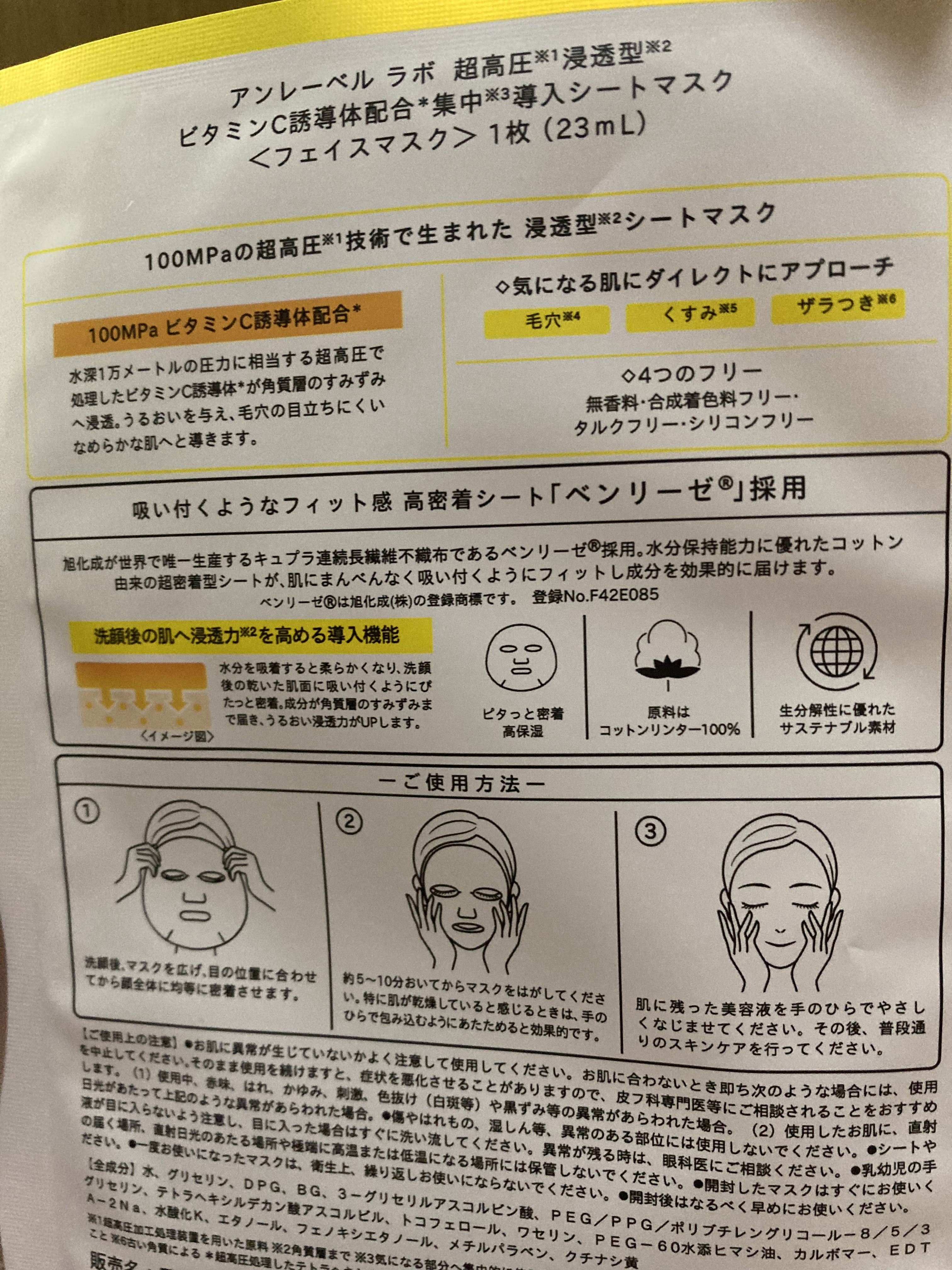 超高圧浸透型美容液成分配合。高密着シートマスクで肌にぐんぐん浸透。 美容液たっぷりでシャバシャバ系。シートマスクはやや厚みのあるタイプで密着感もあります♡ でも次の日のお肌は、水分たっぷりな感じで良かったです💛