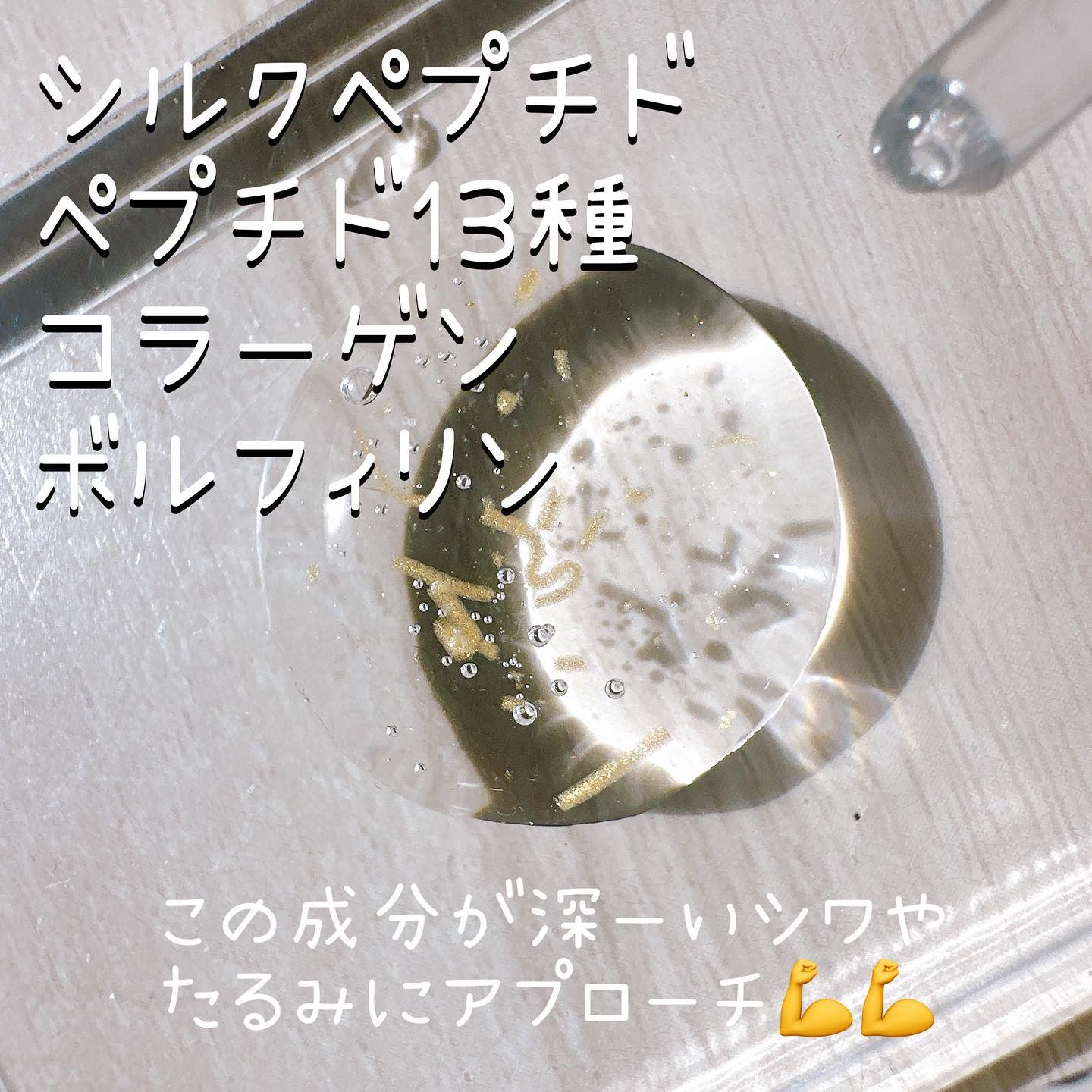 - <35mL> 水、BG、グリセリン、メチルプロパンジオール、1,2-ヘキサンジオール、ナイアシンアミド、カルボマー、トロメタン、PPG-13デシルテトラデセス-24、ヒドロキシエチルセルロース、シルクエキス、アデノシン、トチャカ、カンテン、エチルヘキシルグリセリン、EDTA-2Na、(アクリルレート/アクリル酸アルキル(C10-30))クロスポリマー、合成フルオトフロゴバイト、ベタイン、パンテノール、加水分解エラスチン、酸化チタン、赤色酸化鉄、マイカ、ジェランガム、加水分解コラーゲンエキス、ツボクサエキス、プロパンジオール、リン酸アスコルビルMg、ドクダミエキス、レシチン、アセチルグルタミン、フェノキシエタノール、カワラヨモギエキス、ヒアルロン酸Na、カプリリルグリコール、酸化スズ、金、スクワラン、水添ポリイソブテン、ベンジルグリコール、合成ヒト遺伝子組換オリゴペプチド-1、合成ヒト遺伝子組換ポリペプチド-1、合成ヒト遺伝子組換オリゴペプチド-2、合成ヒト遺伝子組換ポリペプチド-11、合成ヒト遺伝子組換オリゴペプチド-9、加水分解ムコ多糖、コラーゲン、トコフェロール、ヒアルロン酸クロスポリマーNa、加水分解ヒアルロン酸、合成ヒト遺伝子組換デカペプチド-7、合成ヒトオクタペプチド-4、合成ヒトペンタペプチド-19、ヒアルロン酸ヒドロキシプロピルトリモニウム、バルミトイルペンタペプチド-4、アセチルヘキサペプチド-8、トリペプチド-1、銅、ヒアルロン酸、ハナスゲ根エキス、アセチルヒアルロン酸Na、ラズベリーケトン