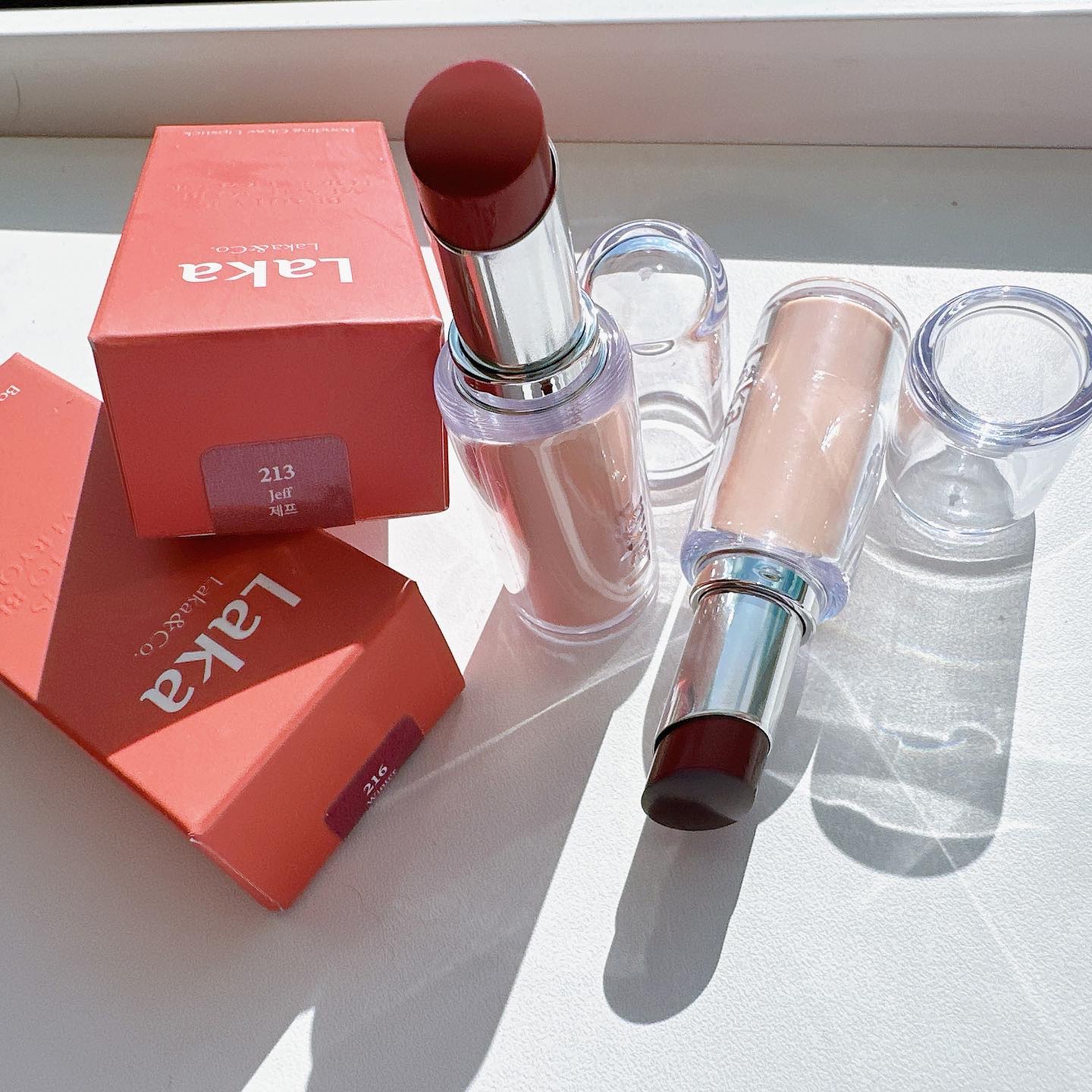 ティントのようにティッシュオフしても色味が残ってくれるところがいい🙆♀️ すべるように伸びるテクスチャーで、ガラス玉みたいにちゅるちゅる感あり✨ ティントのように色味が残ってくれるのがいい◎ スルスル塗れて滑らかなテクスチャー、ナチュラルにちゅるちゅる感がでていい! LaKaのいいところはイメージ通りの発色なところ✨🤍 新しいカラーのJeffは落ち着いたナチュラルな発色で普段使いしやすいと思います!! 個人的にローズ味を感じられる色でブルベもイエベも使いやすいと思いました‼️
