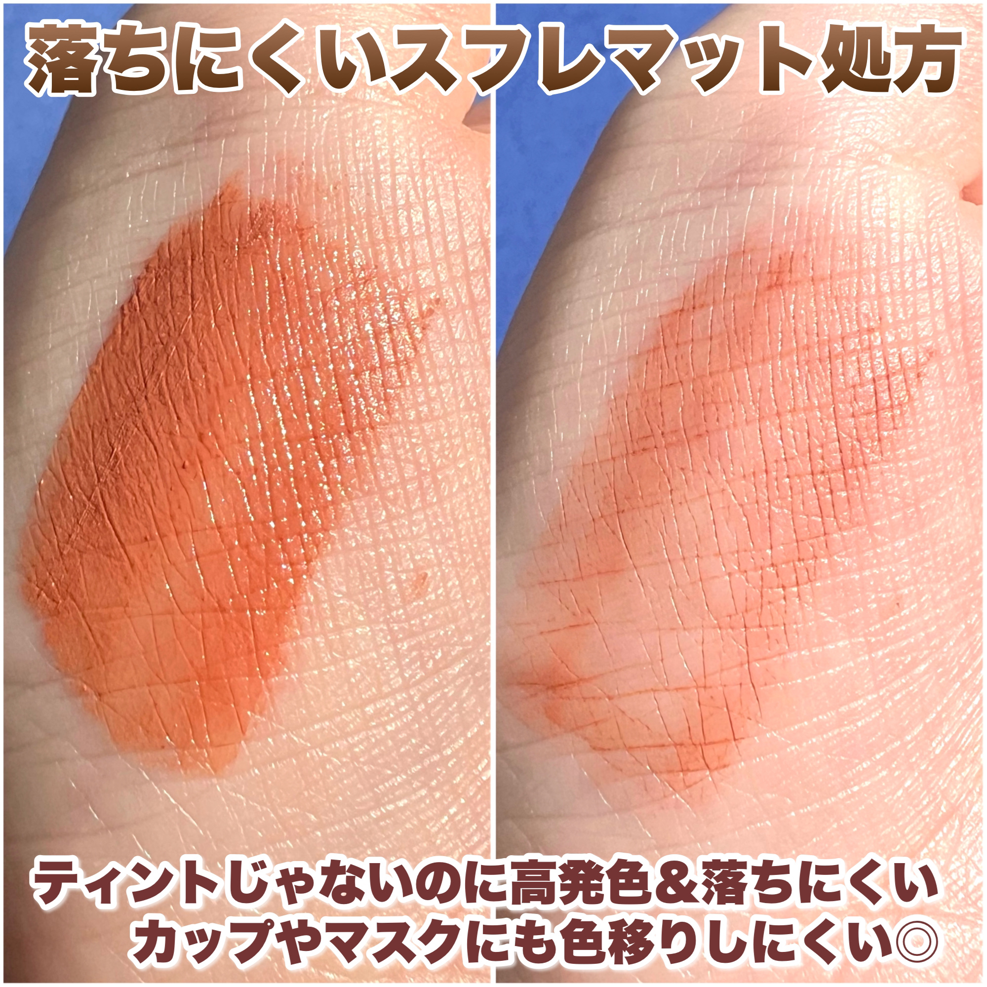 - つけたての色が長時間持続 ふんわりマット質感に変化 落ちにくい液状リップ ■高発色スフレ処方:唇から蒸発する水分を活用してしっとりジェル膜へ変化 液状リップの油分が揮発してふんわりマット質感に変化 ■リップモンスターの機能を踏襲 つけたそのままの色が長時間持続 マスクをしても色落ちしにくい 飲み物を飲んでもカップにつきにくい