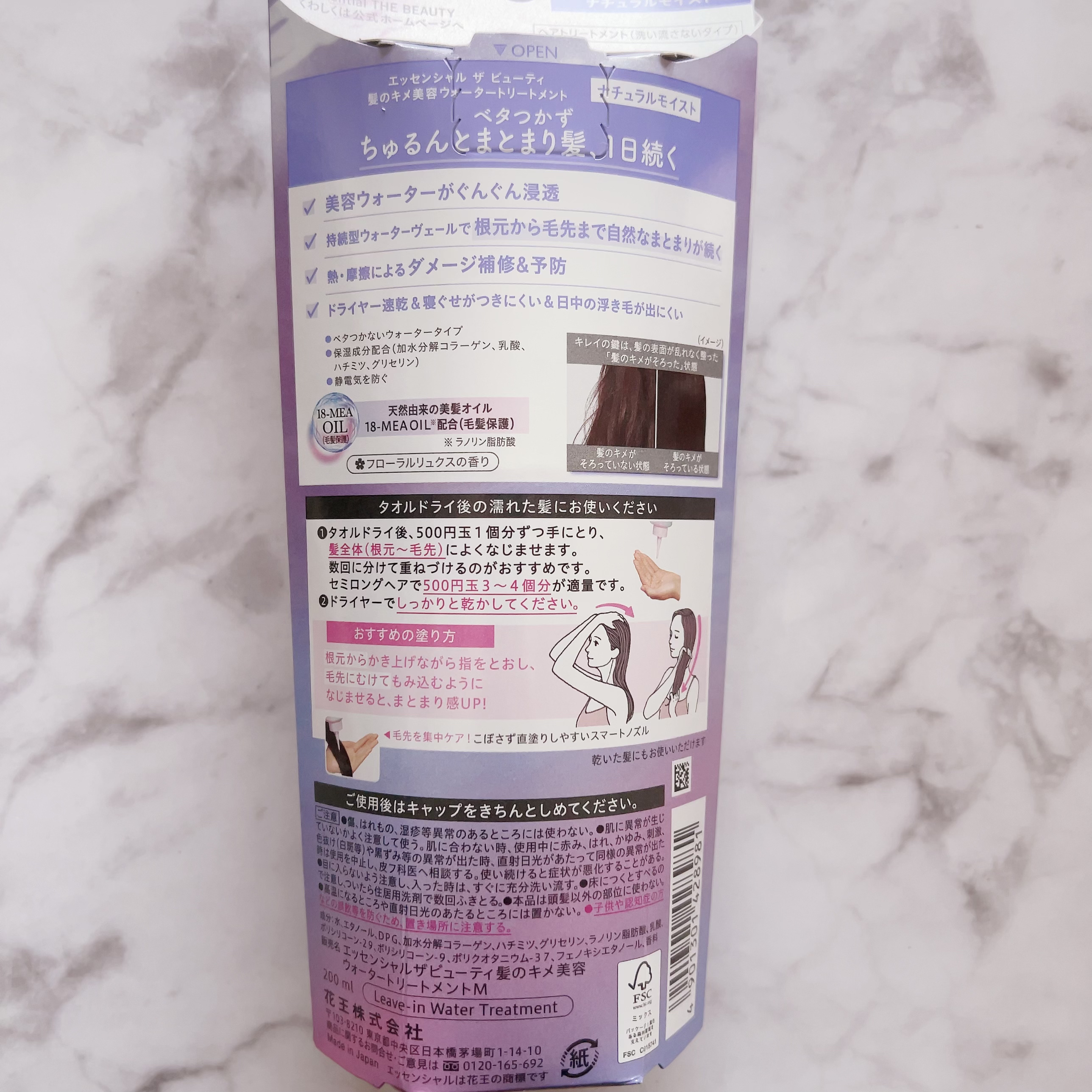 - ※2025年9月06日〜順次パッケージリニューアル。尚、リニューアルにかかる返品交換等は承っておりません。 広がる、パサつく髪に。 洗い流さないウォータートリートメント。 美容ウォーターが浸透。 持続型ウォーターヴェールで、ちゅるんとまとまり髪、1日続く。 〇熱・摩擦によるダメージ補修&予防 〇ドライヤー速乾&寝ぐせがつきにくい 〇厳選した補修美容成分配合<天然由来の美髪オイル18-MEA OIL(ラノリン脂肪酸)・加水分解コラーゲン・乳酸・ハチミツ・グリセリン> 〇静電気を防ぐ 〇ときめくホワイトピーチ&ムスクの香り