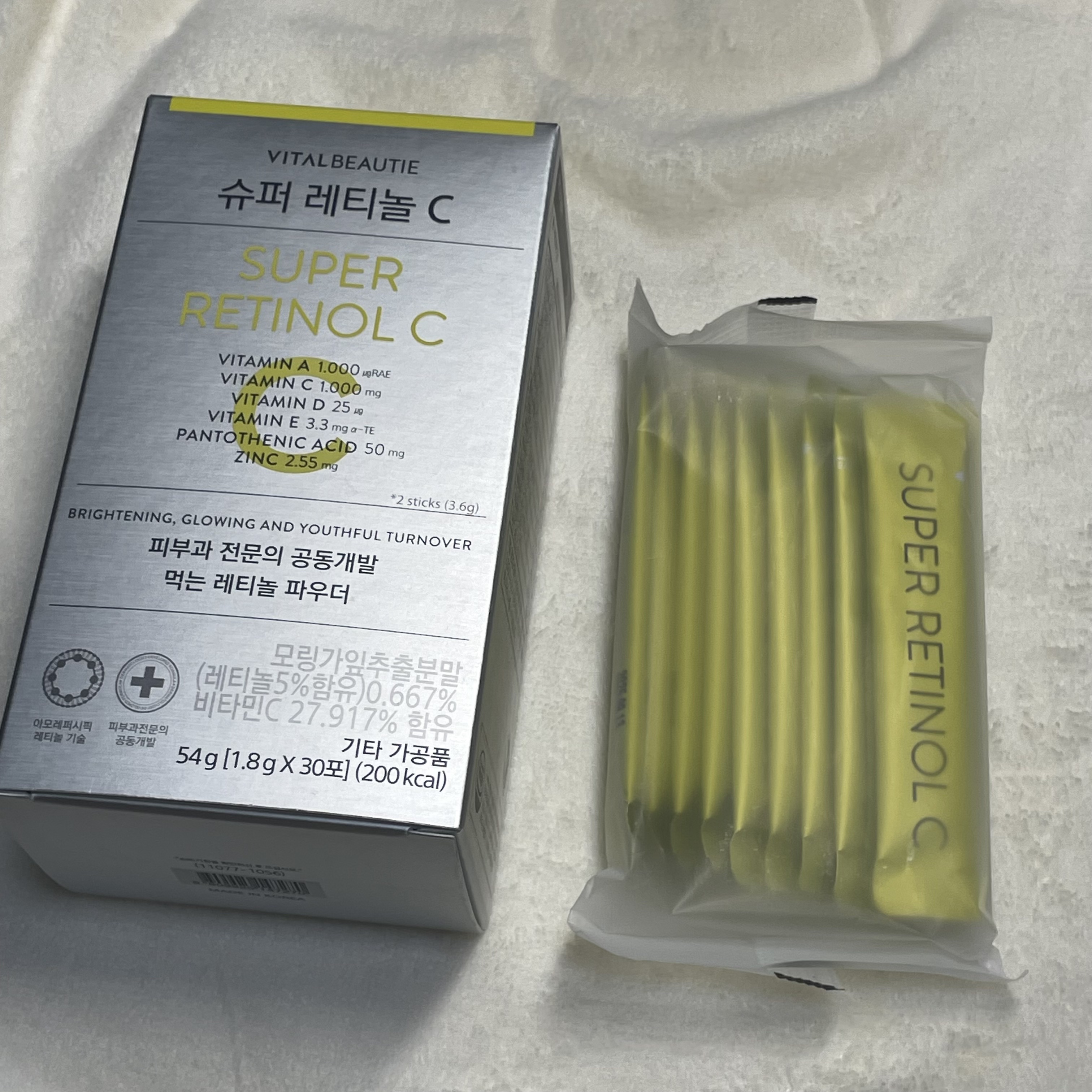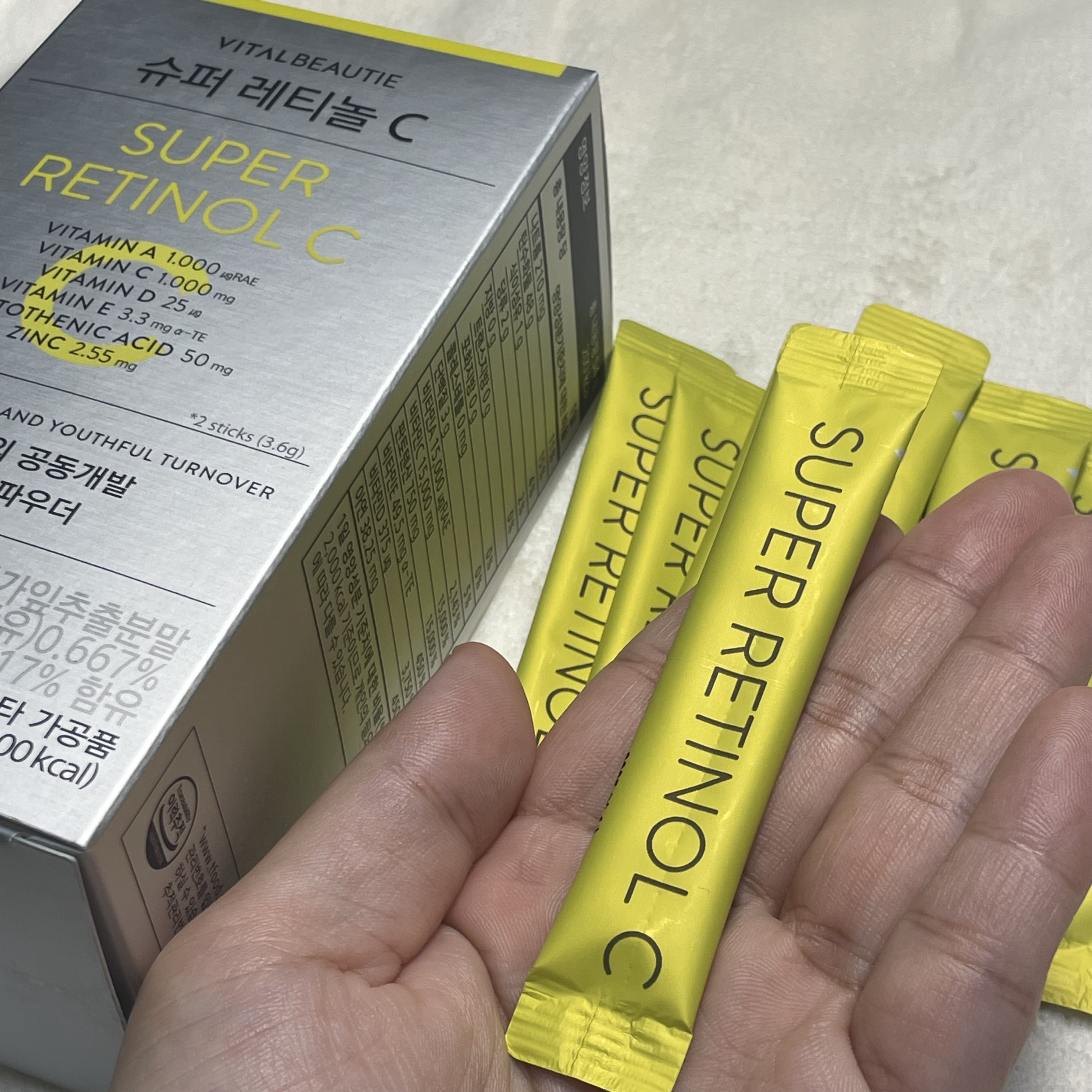 - 食べるタイプのレチノール 1) 専門家のフォーミュラ Flex! - 皮膚科専門医とアモーレパシフィックが共同開発 29年間蓄積したレチノール技術で完成! 食べるレチノールプロテクション技術を適用 (ビタミンA、1000ugRAE配合*) 2) 明るく輝く! - 豊富に含むビタミンC1,000mg含有* - パントテン酸1日栄養成分基準配合* - ビタミンE、ビタミンD、亜鉛 副成分 L-システインとヘスペリジンを配合 3) さわやかなシトラスの味 「ヴィーガンレチノール」 - ヴィーガン認証を取得した毎日摂取できる美味しいレチノール *上記の栄養成分の数値は、2包摂を基準に作成された含量です *お召し上がり方! 1回1~2包を 直接摂取してください