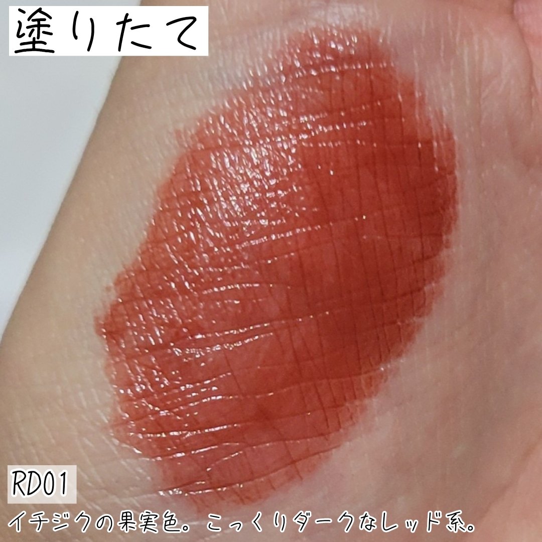 パラドゥのリキッドティントリップ RD01番フィグ レッド系のカラーです。クオリティの高いものが多くてかなりオススメのブランド。 かなりサラッとしたみずみずしいテクスチャーで唇にじんわり馴染んでジュワッとした仕上がりになります。 落ち着いた肌馴染みの良いレッドという感じで2度塗りしても濃すぎないデイリー使いしやすい色味なんです。