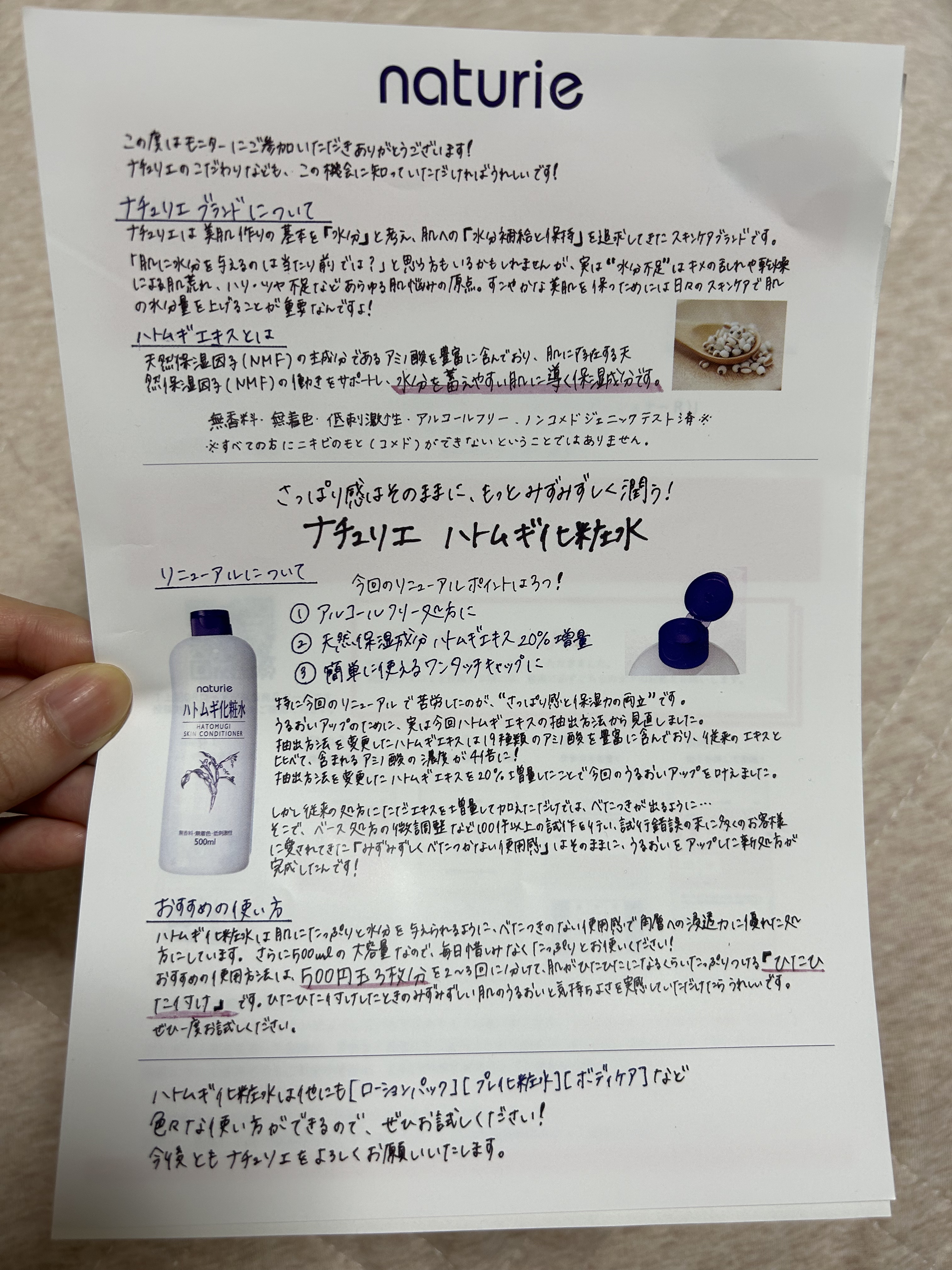 - <通常サイズ 500ml> 水、DPG、BG、グリセリン、ハトムギエキス、グリチルリチン酸2K、(スチレン/VP)コポリマー、クエン酸、クエン酸Na、メチルパラベン <500ml+ 限定ムーミンデザインボトル> 水、DPG、BG、グリセリン、ハトムギエキス、グリチルリチン酸2K、(スチレン/VP)コポリマー、クエン酸、クエン酸Na、メチルパラベン <詰め替えタイプ 480ml> 水、DPG、BG、グリセリン、ハトムギエキス、グリチルリチン酸2K、(スチレン/VP)コポリマー、クエン酸、クエン酸Na、メチルパラベン <旧製品> BG、グリセリン、メチルパラベン、エタノール、グリチルリチン酸2K、ハトムギエキス、DPG、クエン酸Na、プロピルパラベン、クエン酸、(スチレン/アクリレーツ)コポリマー、水 <限定ムーミンデザイン> 水、DPG、BG、グリセリン、ハトムギエキス、グリチルリチン酸2K、(スチレン/VP)コポリマー、クエン酸、クエン酸Na、メチルパラベン
