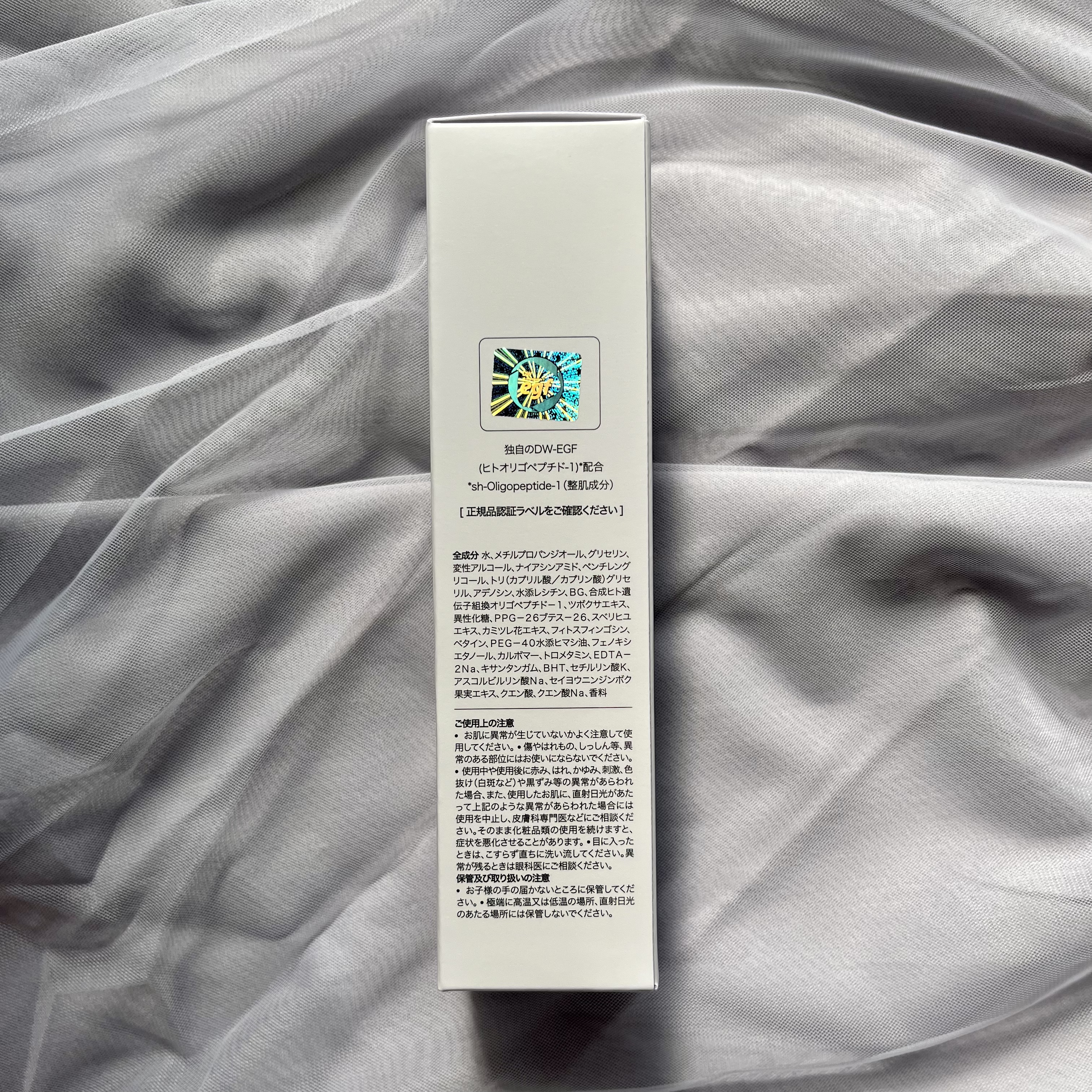 - <本体> 水、メチルプロパンジオール、グリセリン、変性アルコール、ナイアシンアミド、ペンチレングリコール、トリ(カプリル酸/カプリン酸)グリセリル、アデノシン、水添レシチン、BG、合成ヒト遺伝子組換オリゴペプチド-1、ツボクサエキス、異性化糖、PPG-26ブテス-26、スベリヒユエキス、カミツレ花エキス、フィトスフィンゴシン、ベタイン、PEG-40水添ヒマシ油、フェノキシエタノール、カルボマー、トロメタミン、EDTA-2Na、キサンタンガム、BHT、セチルリン酸K、アスコルビルリン酸Na、セイヨウニンジンボク果実エキス、クエン酸、クエン酸Na、香料