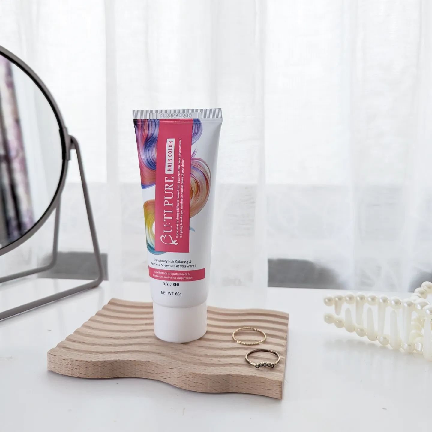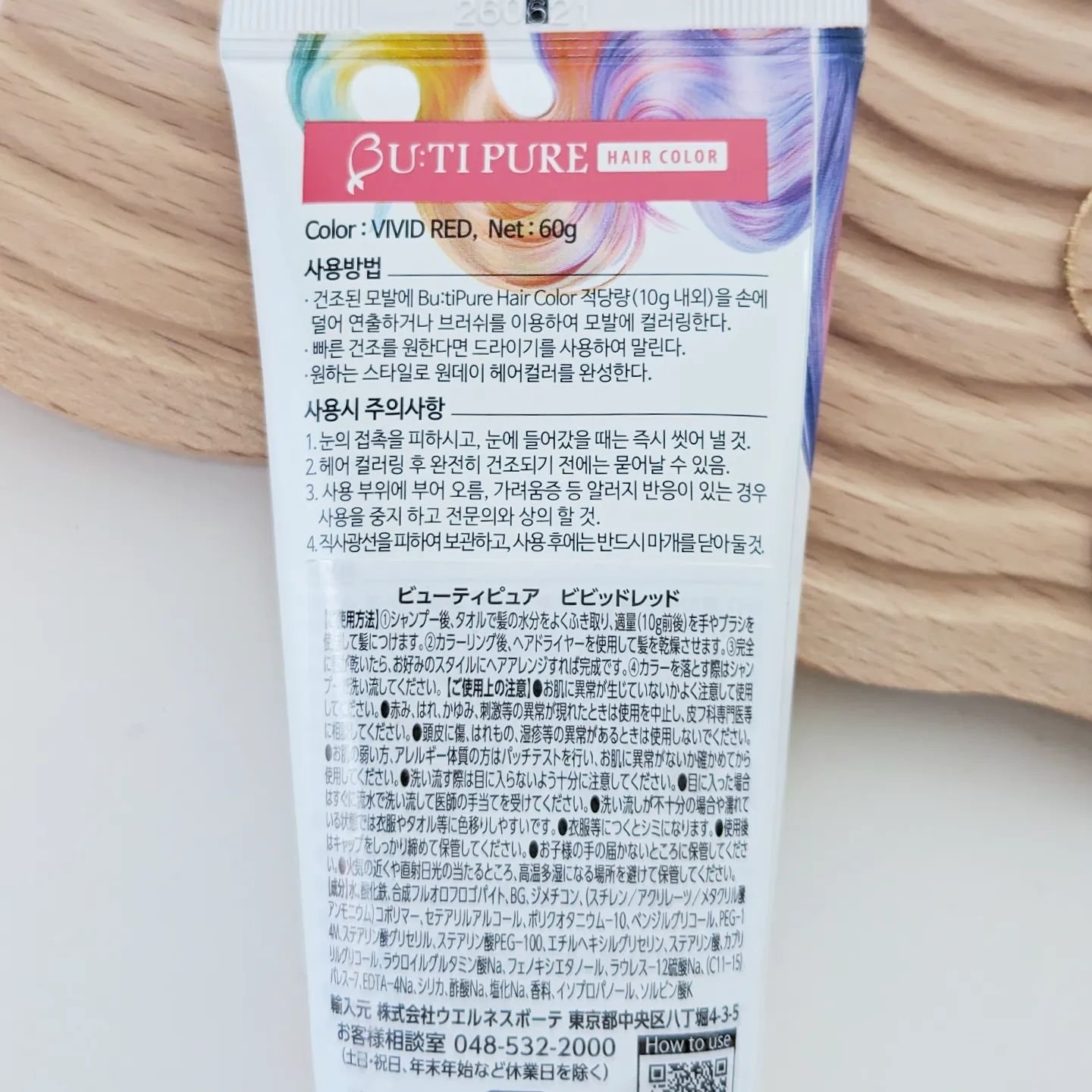 - メイク感覚で日替わりで楽しめる韓国発1dayヘアカラー『BU:TI PURE(ビューティピュア)』 髪に直接塗るだけでいつでも気軽にカラーチェンジを楽しめて、シャンプーで簡単に落とせるヘアカラーエッセンスクリームです。 【商品特徴】 〇ブリーチ要らずで暗い髪色からでもハイトーン&ビビッドカラーに 〇シャンプーで簡単OFF 〇エッセンス成分配合で髪表面に潤いを与えてコーティング・保護し、ダメージから守る 〇こだわりの耐水性&耐熱性 〇インナーカラー、ミストバング、色を組み合わせてグラデーションなど、スタイリング自由自在 〇塗りやすく伸びの良いクリームタイプ