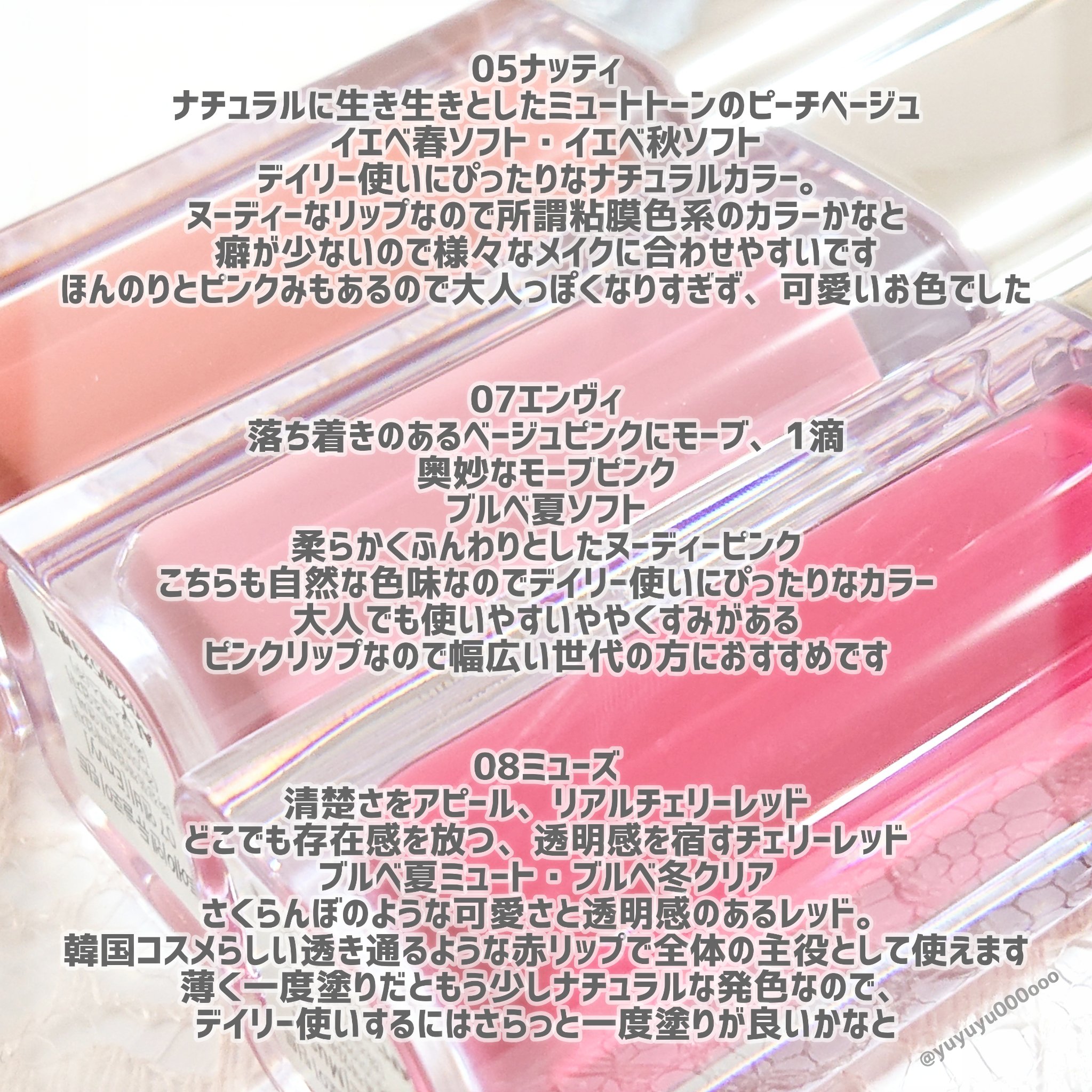 | リップティントランキング第135位 | 透け感のある発色が美しく 塗った後のツヤ感と保湿力も◎ 色展開が天才的で全色可愛すぎる…! | 詳細を見る | |