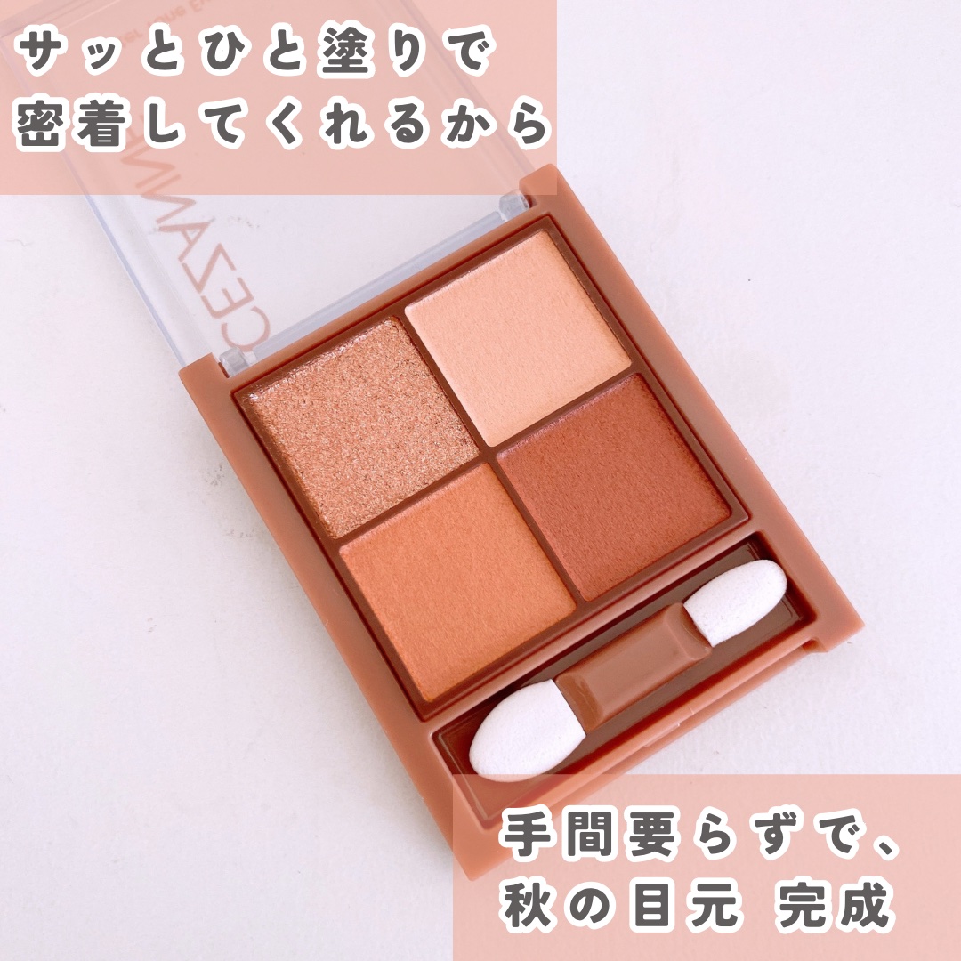 - 透け感マット×濃厚ブラウンの4色アイシャドウ。 しっかり目元を引き締めるビターなブラウンカラー。 透け感のあるブラウンを重ねて、自然な陰影のある目元へ。 ふんわり柔らかなパウダーなので、スルスル伸びてまぶたにピタッと密着。 保湿成分(スクワラン、ホホバ種子油)配合。