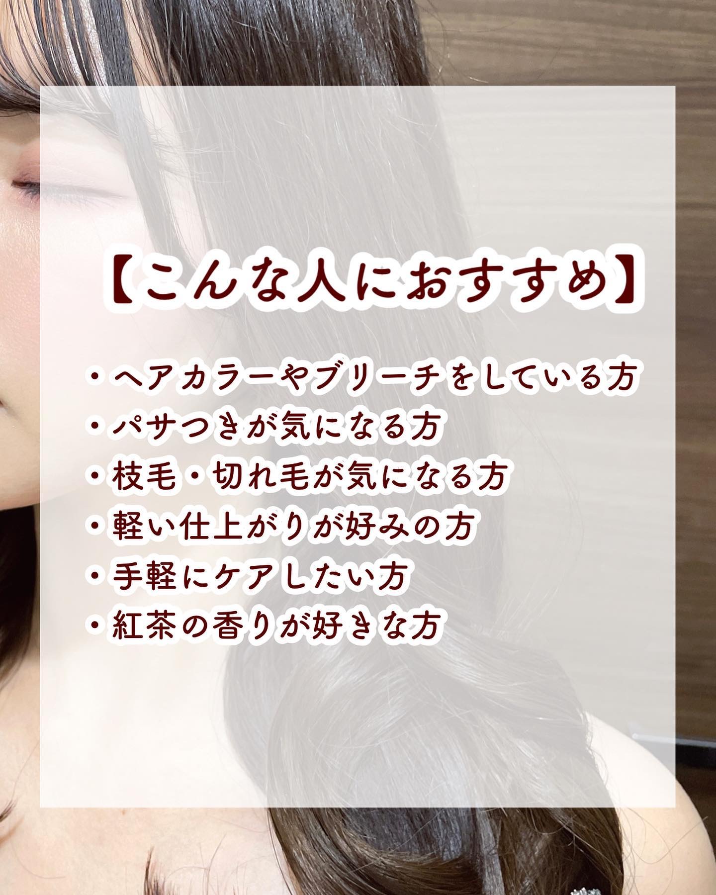 - ■伸びるオイルでハイダメージも集中補修 伸びるオイルが傷んだ部分に密着してダメージを集中補修します。 ヘアカラーやブリーチで傷んだ髪や切れ毛、枝毛等のハイダメージにもおすすめです。 また、厳選した*¹こだわりの補修成分として「3種類のナノ加水分解ケラチン*²」「2種類のナノPPT成分*³」に加え注目の「ジラウロイルグルタミン酸リシンNa」を配合しています。 ■べとつかないさらっとした使用感 密着するオイルなのになじませるとさらっとしていてべとつかず、軽い仕上がりなのが特徴です。 オイルの後にドライヤーで乾かすとサラッサラな指通りに。 ■朝のスタイリングとしても使える 髪にツヤを与えるだけでなく髪にラフな動きをもたせたい時や濡れ感を出したい時のスタイリング用としても使えます。 紫外線などの外的刺激から髪を守る働きもあります。 ■上品なブラックティーの香り 上品で落ち着いたブラックティーの香りを採用。 使うシーンや性別を問わずに香りをお楽しみいただけます。 *¹当社比 *²(ジヒドロキシメチルシリルプロポキシ)ヒドロキシプロピル加水分解ケラチン(羊毛)、ステアルジモニウムヒドロキシプロピル加水分解ケラチン(羊毛)、ヒドロキシプロピルトリモニウム加水分解ケラチン(羊毛) *³加水分解シルク、加水分解コラーゲン(*²、*³は全て補修成分)