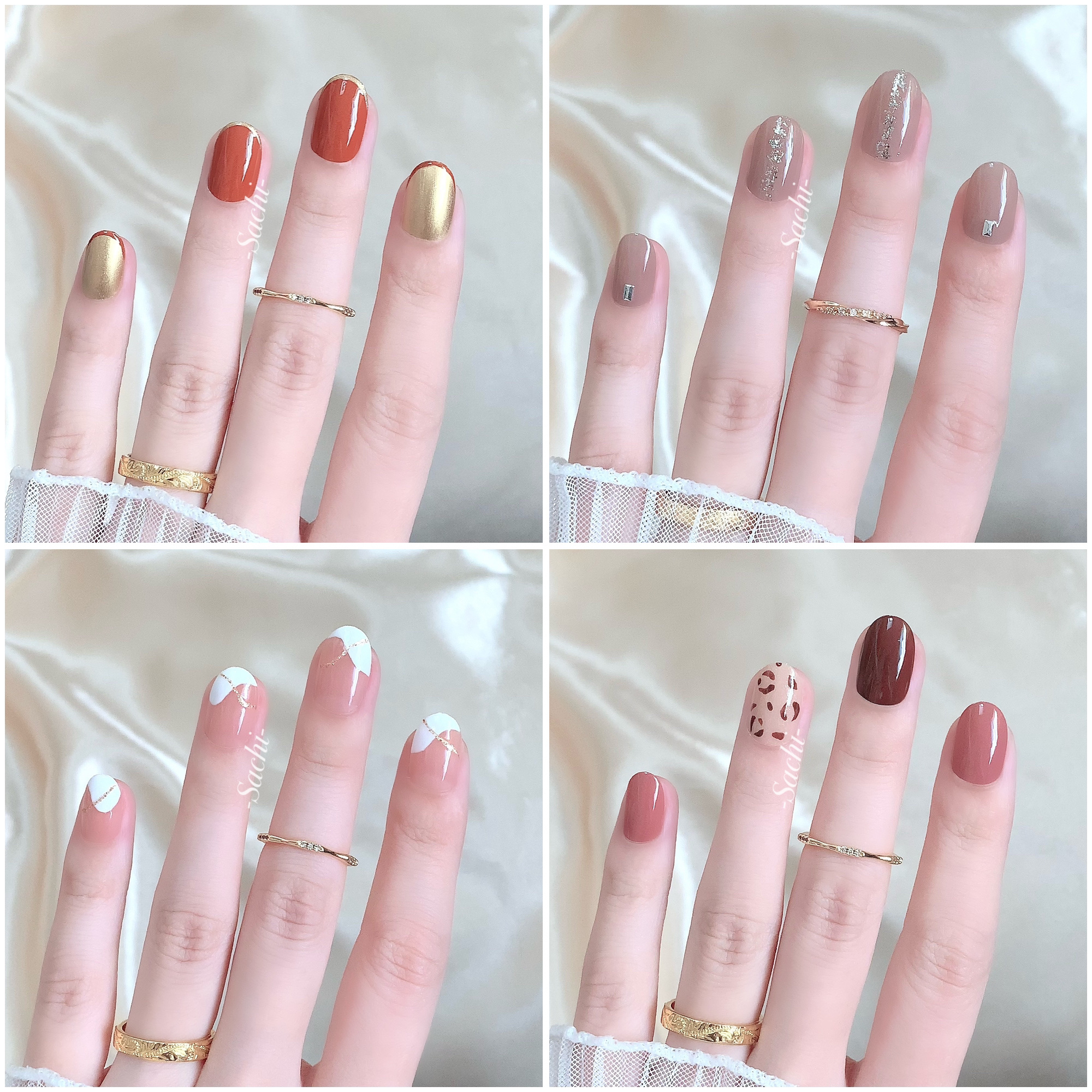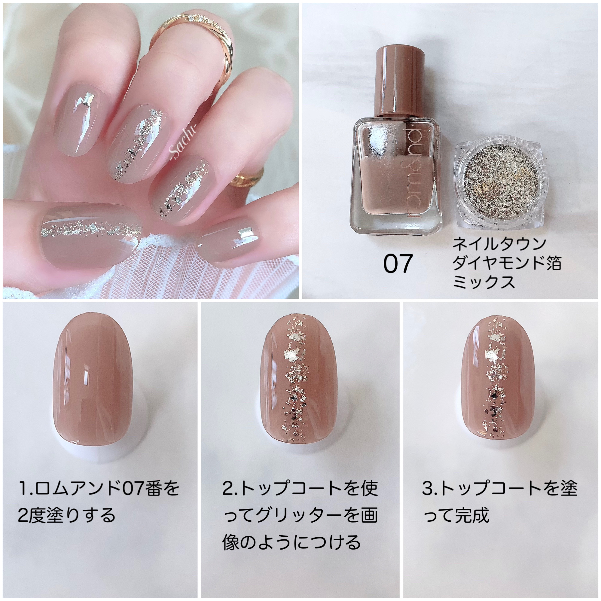 ワンカラーでも指ごとに色を変えるだけでオシャレに見えます💕 画像のようにゴールドラインとストーンを少し足すだけで華やかさがアップ🥰 何度かご紹介したことのあるスポンジで作るグラデーションです✨ スポンジを使うことで境目が綺麗に馴染んでくれます💕 アルミホイルの上でブラウンとトップコートを1:1くらいで混ぜたものを、トップコートのハケに取って3箇所に塗るだけ👌 事前に混ぜたものを塗ることで、爪の上でぼかすより簡単に出来ます💕 ベースカラーが乾く前に点置きしてぼかすことで綺麗にぼかせます✨ スピードが大事なので、使うポリッシュのキャップは全て開けておきましょう😊 天然石のラインはガタガタの方がより天然石っぽく見えるので、ラインを描くのが苦手な方でも大丈夫🙆♀️ 難しそうに見えて、やってみると意外と簡単に出来ます♡
