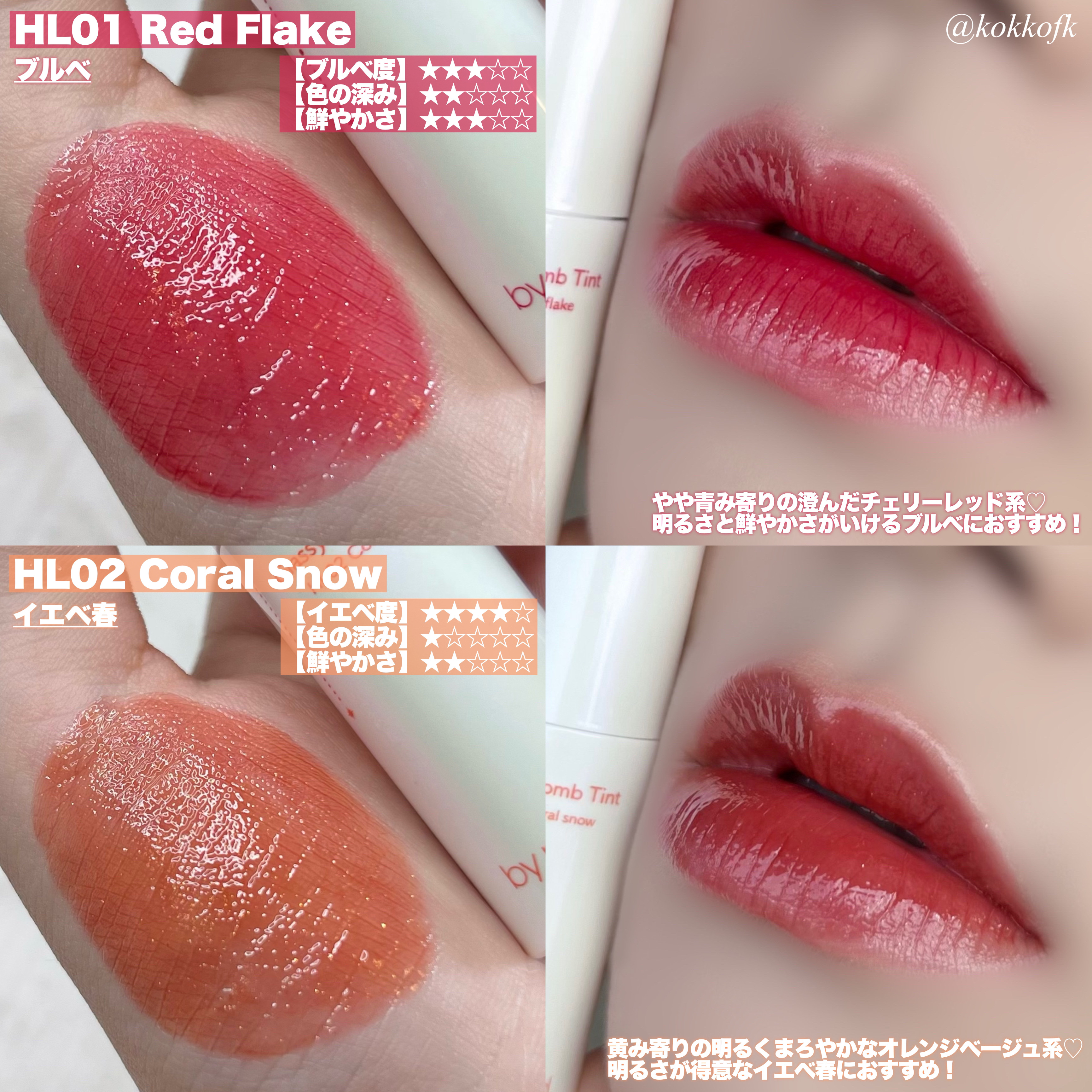 既存のジューシーラスティングティントよりさらに軽いツヤ感が魅力の新作ティント! 色選びの参考にしてね! やや黄みの明るいオレンジコーラル鮮やか得意なイエベ春におすすめ! 黄みの明るくまろやかなオレンジベージュ黄みが得意なイエベ春におすすめ! 青み黄み中間なくすみピンクベージュブルベ夏やイエベ春におすすめ 黄みの深くて鮮やかなオレンジレッド鮮やか得意なイエベ秋におすすめ! 青みの鮮やかで明るいビビッドピンク明るさ得意なブルベ冬やブルベ夏におすすめ! 青みの明るめで柔らかいローズピンクブルベ夏やブルベ冬におすすめ! 青み黄み中間な鮮やかで強いビビッドレッド2ndイエベ春のブルベ冬におすすめ! 青みの強い深くて鮮やかなベリーレッド2nd夏で鮮やか得意なブルベ冬におすすめ!