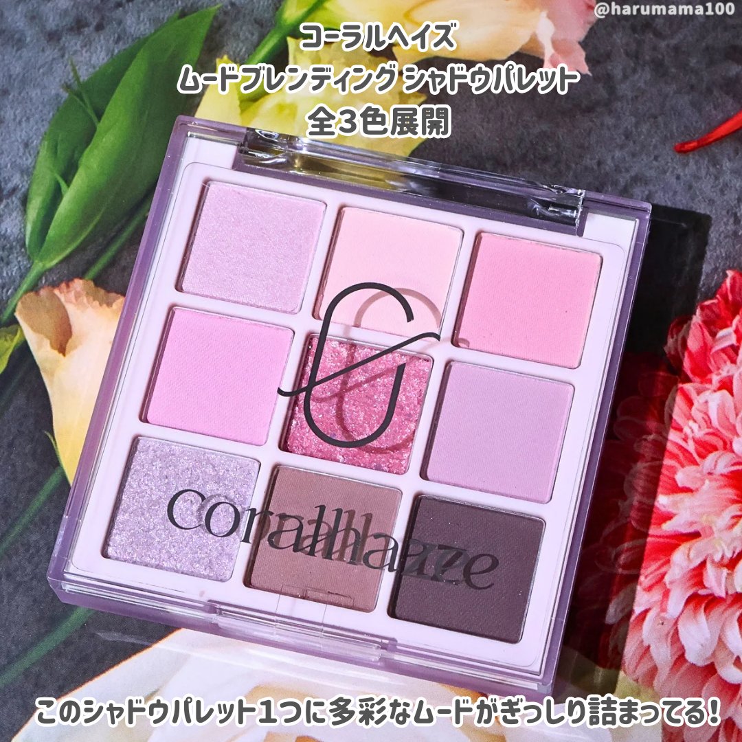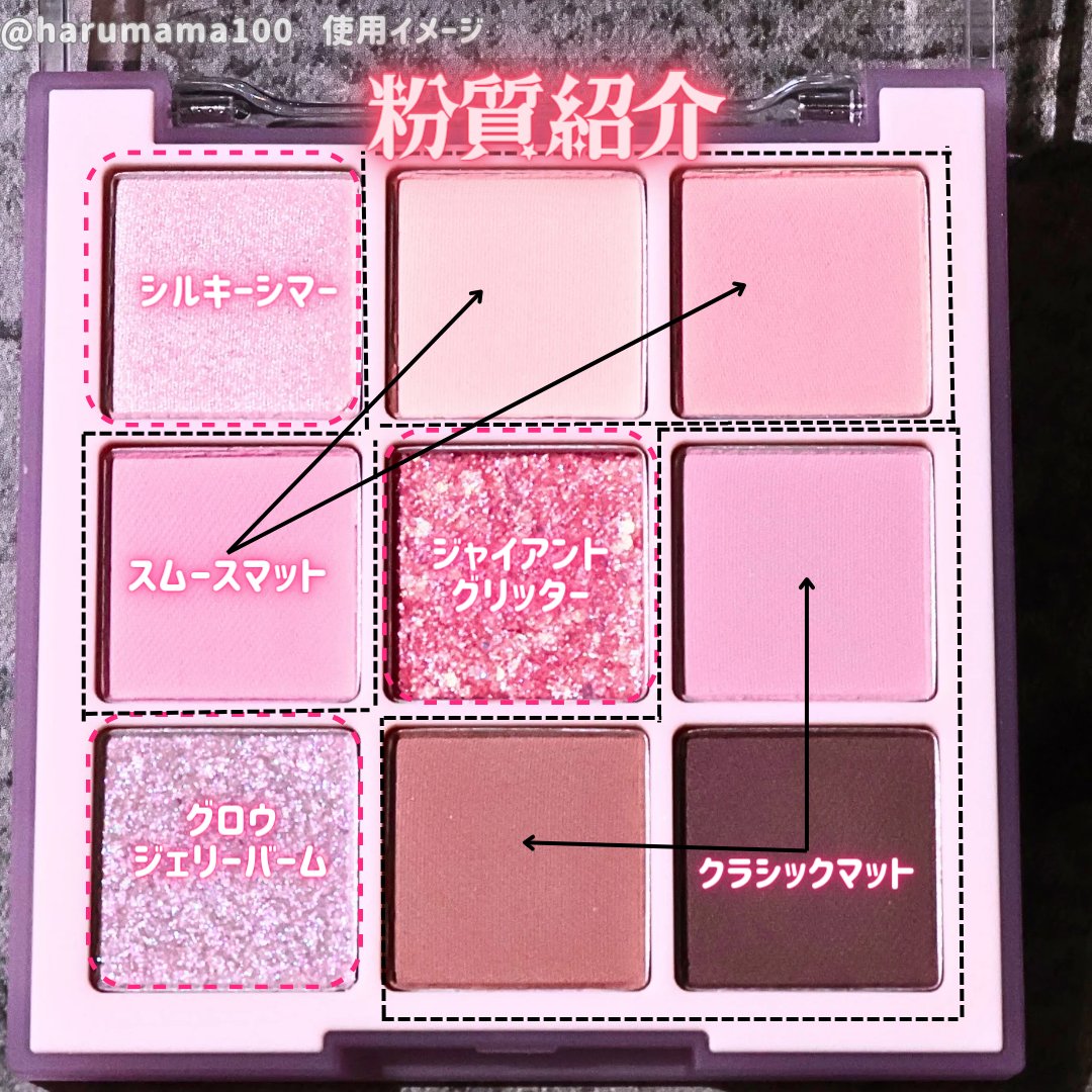 透明感あふれる淡いラベンダーピンク🪻 普段あまり韓国コスメを使わないのでドラッグストアやバラエティショップなどで見たときの完全な偏見になりますが🤣 コーラルヘイズのパレットは9色入りだけどサイズ小さめで持ち運びしやすく、サラッとした粉質で発色も控えめでした。 #03 PINKMOONは青み寄りの淡いピンク系が揃ったカラー💓 特に目を惹くのが真ん中のグリッター🫶🏻