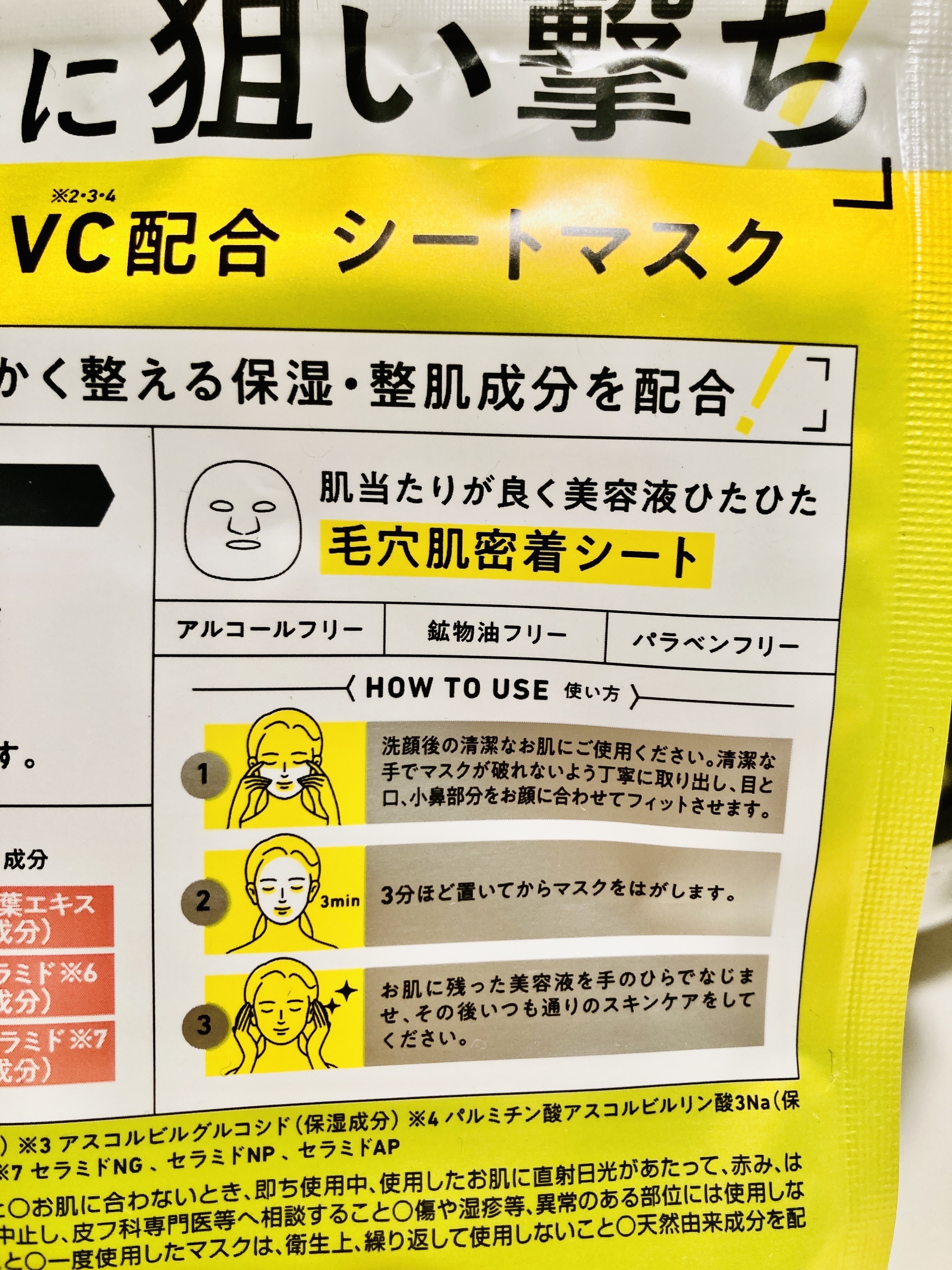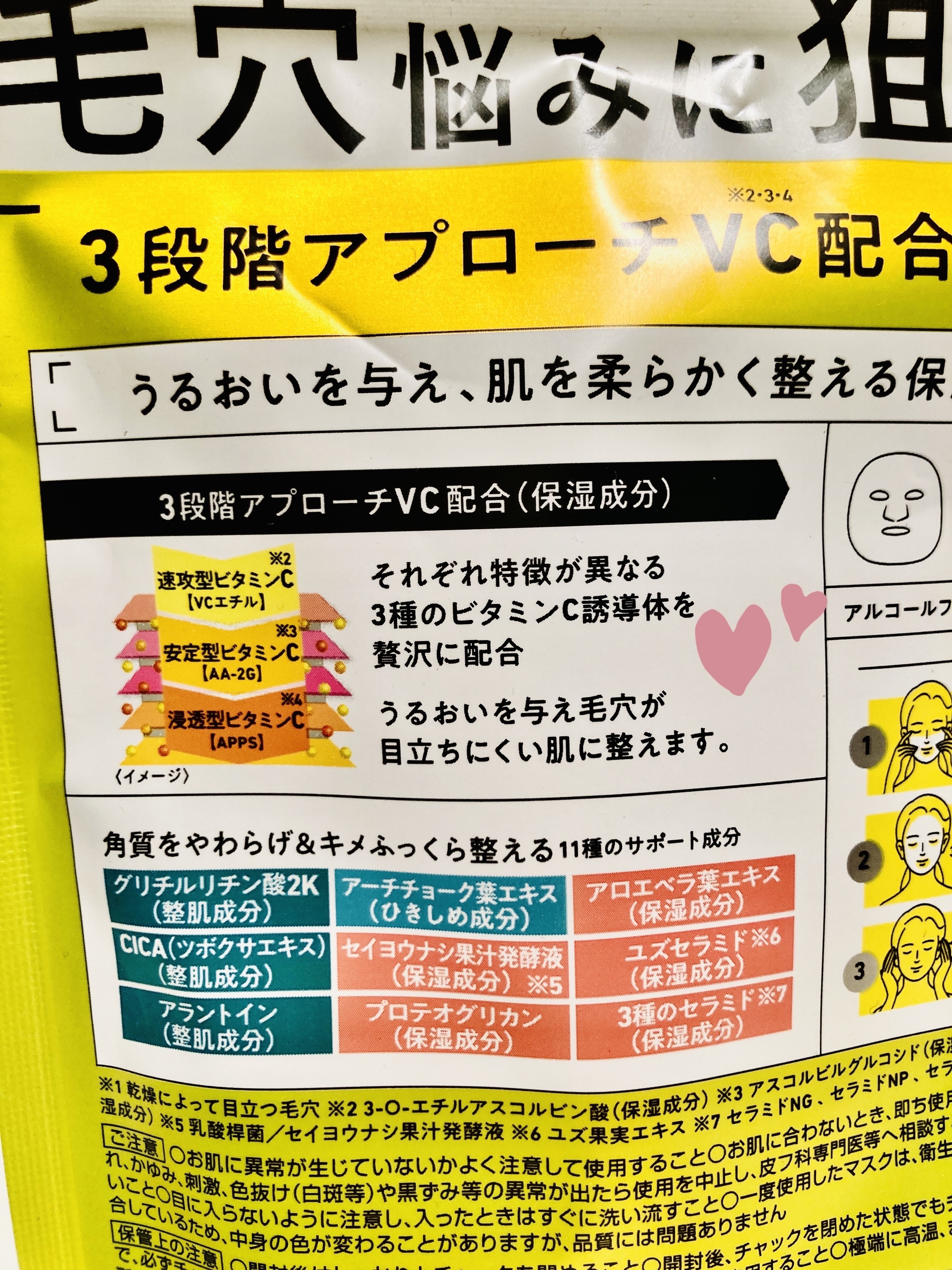 - ※2024年2月15日〜パッケージリニューアル。尚、これにかかる商品の返品・交換等は承っておりません。 3種類のビタミンC誘導体*1配合!角質柔軟美容液inシートマスクで毛穴*2に狙い撃ち。 *13-O-エチルアスコルビン酸,アスコルビルグルコシド,パルミチン酸アスコルビルリン酸3Na(保湿成分) *2乾燥によって目立つ毛穴