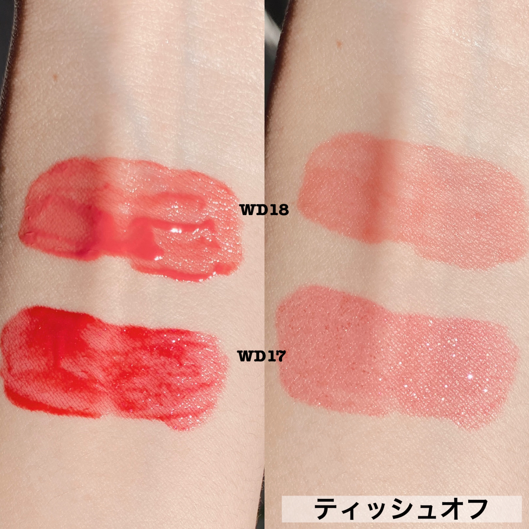 - <WD2 ビトゥン ローズ> 水、ジフェニルジメチコン、リンゴ酸ジイソステアリル、ビスジグリセリルポリアシルアジペート-2、水添ポリイソブテン、ジグリセリン、DPG、セチルPEG/PPG-10/1ジメチコン、イソステアリン酸ソルビタン、ポリソルベート60、ペンチレングリコール、オクチルドデカノール、セテアレス-20、(アクリル酸ヒドロキシエチル/アクリロイルジメチルタウリンNa)コポリマー、スクワラン、フェノキシエタノール、ポリグリセリン-3、ステビオシド、香料、エチルヘキシルグリセリン、グリセリン、シア脂、ツバキ種子油、トリ(カプリル酸/カプリン酸)グリセリル、アルガニアスピノサ核油、ホホバ種子油、アーモンド油、アンズ核油、月見草油、オリーブ果実油、テトラ(ジ-t-ブチルヒドロキシヒドロケイヒ酸)ペンタエリスリチル、カニナバラ果実エキス、マンゴー果実エキス、赤104(1)、赤227、黄5、青1 <WD3 ピンク ヘイズ> 水、ジフェニルジメチコン、リンゴ酸ジイソステアリル、ビスジグリセリルポリアシルアジペート-2、水添ポリイソブテン、ジグリセリン、DPG、セチルPEG/PPG-10/1ジメチコン、イソステアリン酸ソルビタン、ポリソルベート60、ペンチレングリコール、オクチルドデカノール、セテアレス-20、(アクリル酸ヒドロキシエチル/アクリロイルジメチルタウリンNa)コポリマー、スクワラン、フェノキシエタノール、ポリグリセリン-3、ステビオシド、香料、エチルヘキシルグリセリン、グリセリン、水酸化Al、ポリアクリル酸アンモニウム、BG、アルガニアスピノサ核油、シア脂、ツバキ種子油、トリ(カプリル酸/カプリン酸)グリセリル、アーモンド油、アンズ核油、ホホバ種子油、月見草油、オリーブ果実油、テトラ(ジ-t-ブチルヒドロキシヒドロケイヒ酸)ペンタエリスリチル、マンゴー果実エキス、カニナバラ果実エキス、酸化チタン、赤104(1)、赤227、黄5、青1 <WD4 オールウェイズ ヤング> 水、ジフェニルジメチコン、リンゴ酸ジイソステアリル、ビスジグリセリルポリアシルアジペート-2、水添ポリイソブテン、ジグリセリン、DPG、セチルPEG/PPG-10/1ジメチコン、イソステアリン酸ソルビタン、ポリソルベート60、ペンチレングリコール、オクチルドデカノール、セテアレス-20、(アクリル酸ヒドロキシエチル/アクリロイルジメチルタウリンNa)コポリマー、スクワラン、フェノキシエタノール、ポリグリセリン-3、ステビオシド、香料、エチルヘキシルグリセリン、グリセリン、シア脂、ツバキ種子油、トリ(カプリル酸/カプリン酸)グリセリル、アルガニアスピノサ核油、ホホバ種子油、アーモンド油、アンズ核油、月見草油、オリーブ果実油、テトラ(ジ-t-ブチルヒドロキシヒドロケイヒ酸)ペンタエリスリチル、カニナバラ果実エキス、マンゴー果実エキス、赤104(1)、赤227、黄5、青1 <WD6 クラッシュド パンプキン> 水、水添ポリイソブテン、リンゴ酸ジイソステアリル、ビスジグリセリルポリアシルアジペート-2、ジフェニルシロキシフェニルトリメチコン、ジフェニルジメチコン、ポリグリセリン-3、オクチルドデカノール、ポリソルベート60、セチルPEG/PPG-10/1ジメチコン、ラウリン酸ポリグリセリル-10、ペンチレングリコール、1,2-ヘキサンジオール、(アクリル酸ヒドロキシエチル/アクリロイルジメチルタウリンNa)コポリマー、PEG-60水添ヒマシ油、セテアリルアルコール、スクワラン、キシリトール、エチルヘキシルグリセリン、香料、ポリアクリル酸アンモニウム、イソステアリン酸ソルビタン、水酸化Al、フェノキシエタノール、BG、トコフェロール、酸化チタン、酸化鉄、赤227、黄4、黄5、青1 <WD8 ビンテージ カラント> 水、水添ポリイソブテン、リンゴ酸ジイソステアリル、ビスジグリセリルポリアシルアジペート-2、ジフェニルシロキシフェニルトリメチコン、ジフェニルジメチコン、オクチルドデカノール、ポリグリセリン-3、ポリソルベート60、セチルPEG/PPG-10/1ジメチコン、ラウリン酸ポリグリセリル-10、1,2-ヘキサンジオール、ペンチレングリコール、(アクリル酸ヒドロキシエチル/アクリロイルジメチルタウリンNa)コポリマー、PEG-60水添ヒマシ油、セテアリルアルコール、スクワラン、キシリトール、エチルヘキシルグリセリン、香料、イソステアリン酸ソルビタン、トコフェロール、赤104(1)、赤227、黄5、青1 <WD9 ミスター ストレンジャー> 水、水添ポリイソブテン、リンゴ酸ジイソステアリル、ビスジグリセリルポリアシルアジペート-2、ジフェニルシロキシフェニルトリメチコン、ジフェニルジメチコン、オクチルドデカノール、ポリグリセリン-3、ポリソルベート60、セチルPEG/PPG-10/1ジメチコン、ラウリン酸ポリグリセリル-10、1,2-ヘキサンジオール、ペンチレングリコール、(アクリル酸ヒドロキシエチル/アクリロイルジメチルタウリンNa)コポリマー、セテアリルアルコール、PEG-60水添ヒマシ油、スクワラン、キシリトール、エチルヘキシルグリセリン、香料、イソステアリン酸ソルビタン、水酸化Al、ポ