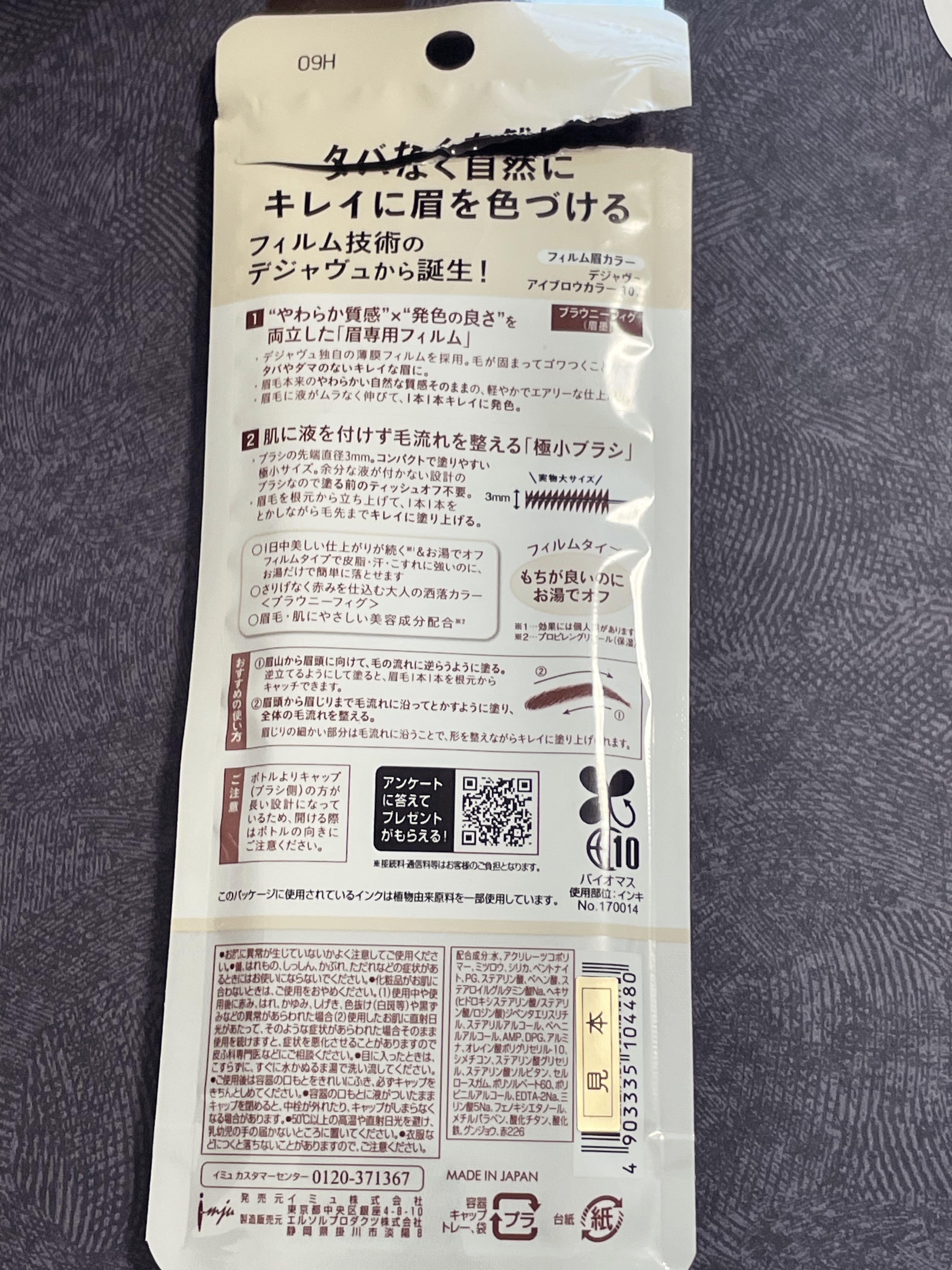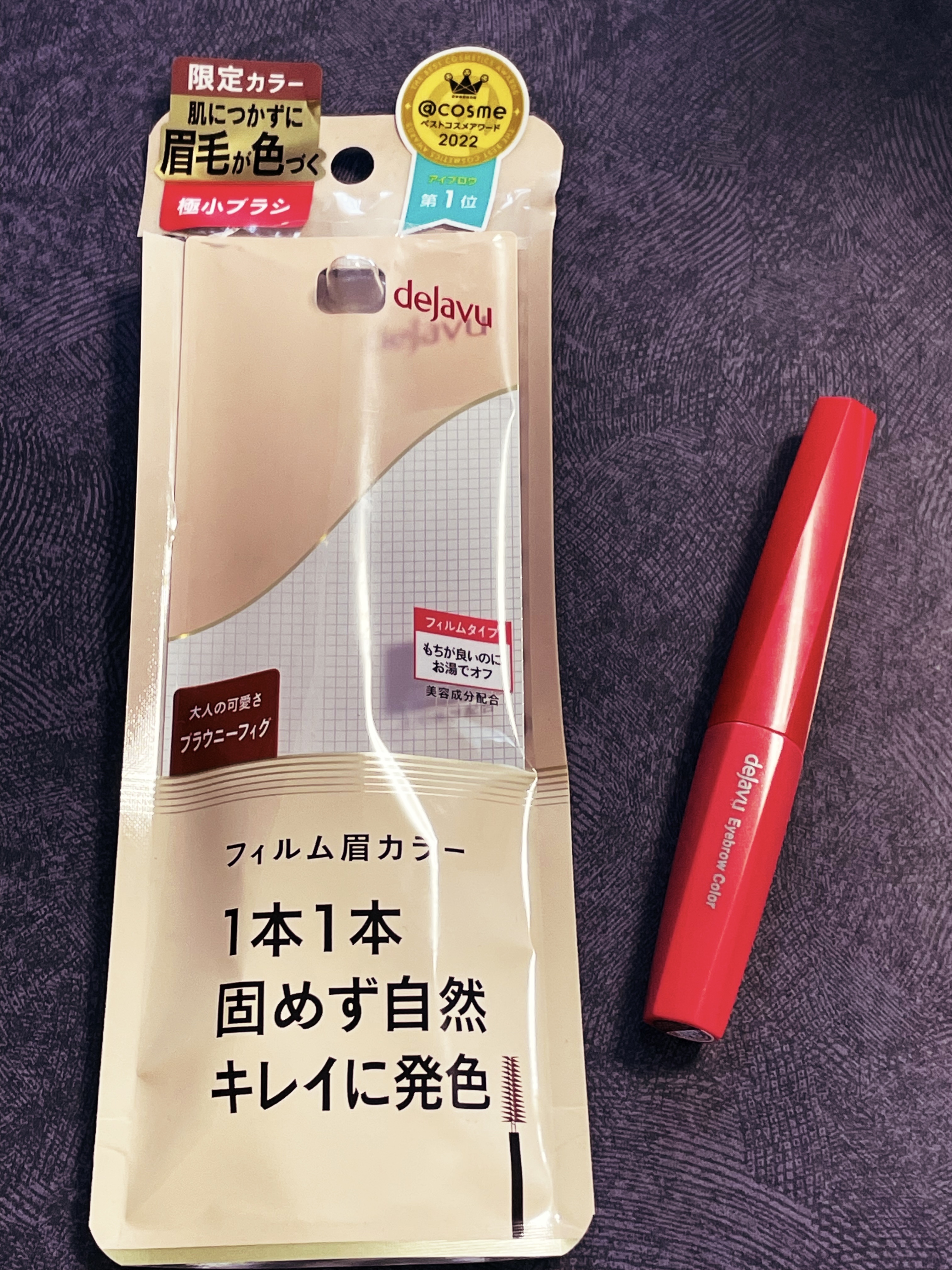 1本1本色づき固まらない「フィルム眉カラー」 塗りやすい極小ブラシで簡単垢抜け✨ デジャヴュ独自の薄膜フィルムを採用。 毛がパリッと固まらず、タバやダマのないふんわり自然な眉に。 フィルムタイプで速乾性が高く、皮脂・汗・こすれに強いのに、お湯だけで簡単に落とせます✨