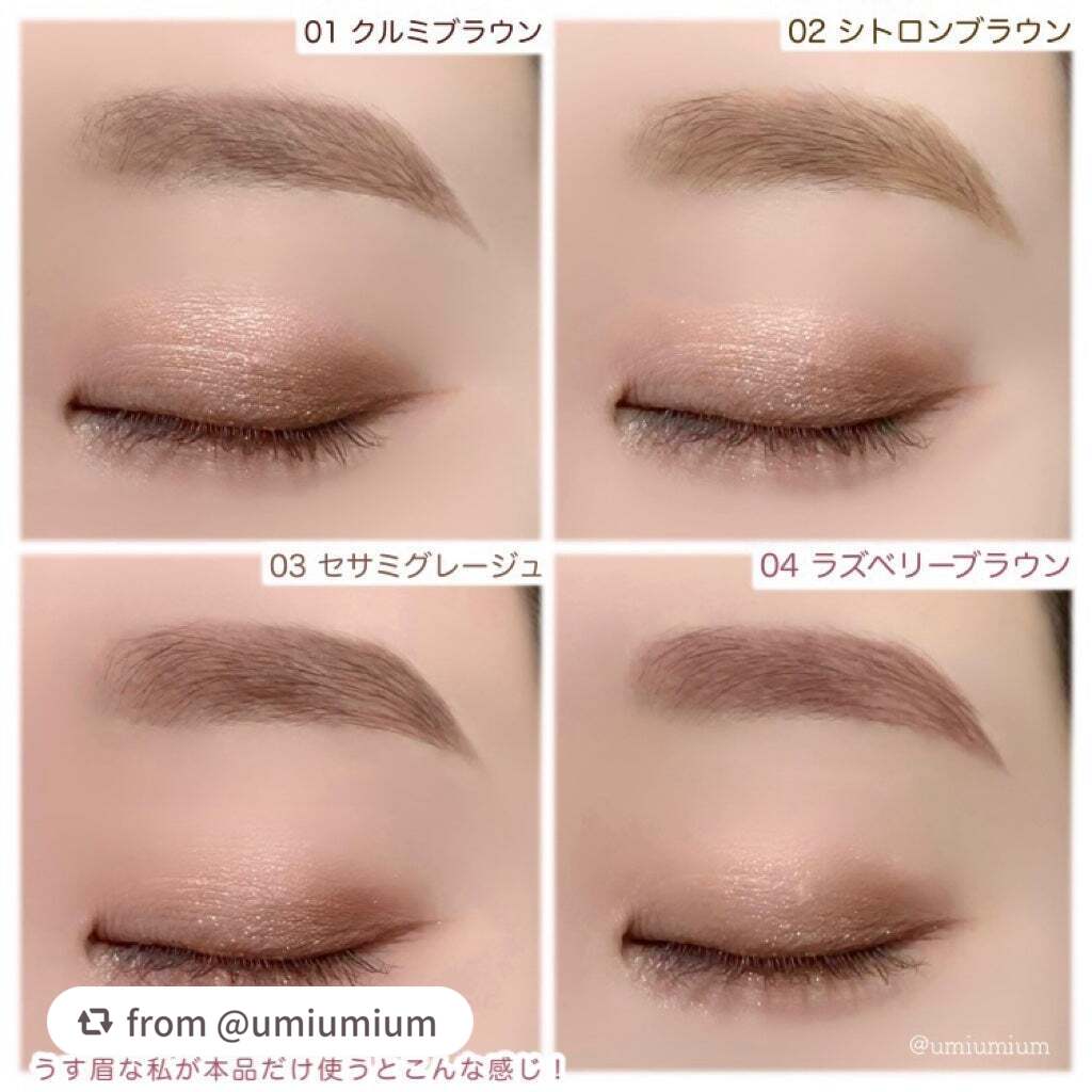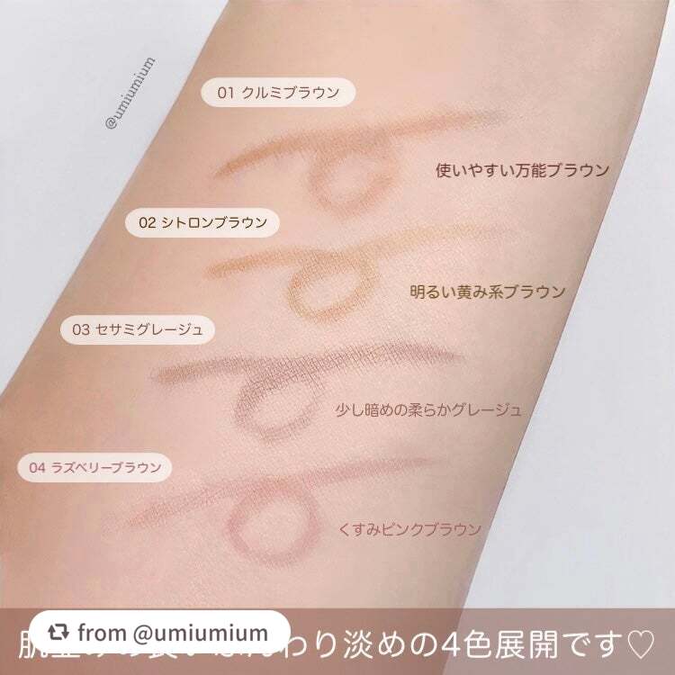 - 炭パウダー配合!ふんわり眉が長時間つづくリキッドアイブロウ! リキッドだけどテカらず、パウダリーな仕上がり。 リキッドだから眉尻まで長時間消えにくい! 本物のまゆげにみせる自然な薄付き発色 01 クルミブラウン…迷ったらこれ!使いやすい人気のブラウン 02 シトロンブラウン…明るめ黄みブラウン 03 セサミグレージュ…少し暗めのやわらかいグレージュ 04 ラズベリーブラウン…可愛い印象になるピンクブラウン