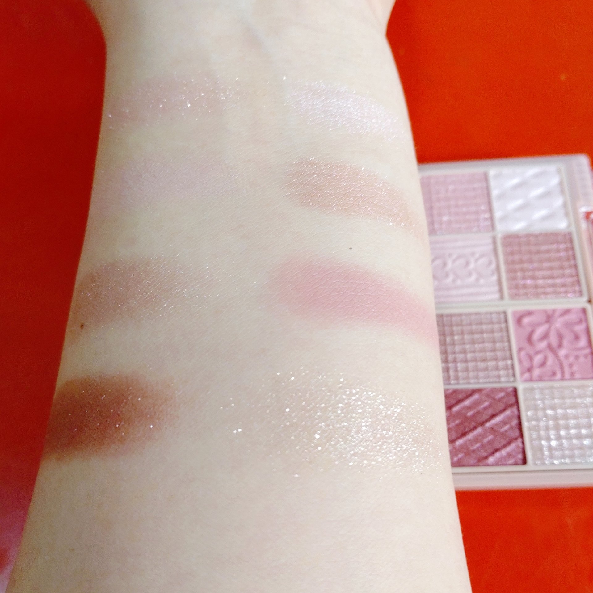 プチプラのクオリティじゃないっ!! 発売前からチェックしていたけれど、ここまで可愛いとは…😆 絶妙カラーで目もとのくすみを飛ばして*明るい印象に🩷 横割りグラデーションでメイクし、立体感をより出したかったので最後に1番左のカラーを上まぶたの真ん中と涙袋にのせています🙆 肌馴染みも良くて粉飛びも感じにくかったです💕 ブラウンの方も店頭に出てたら買おうかな💓