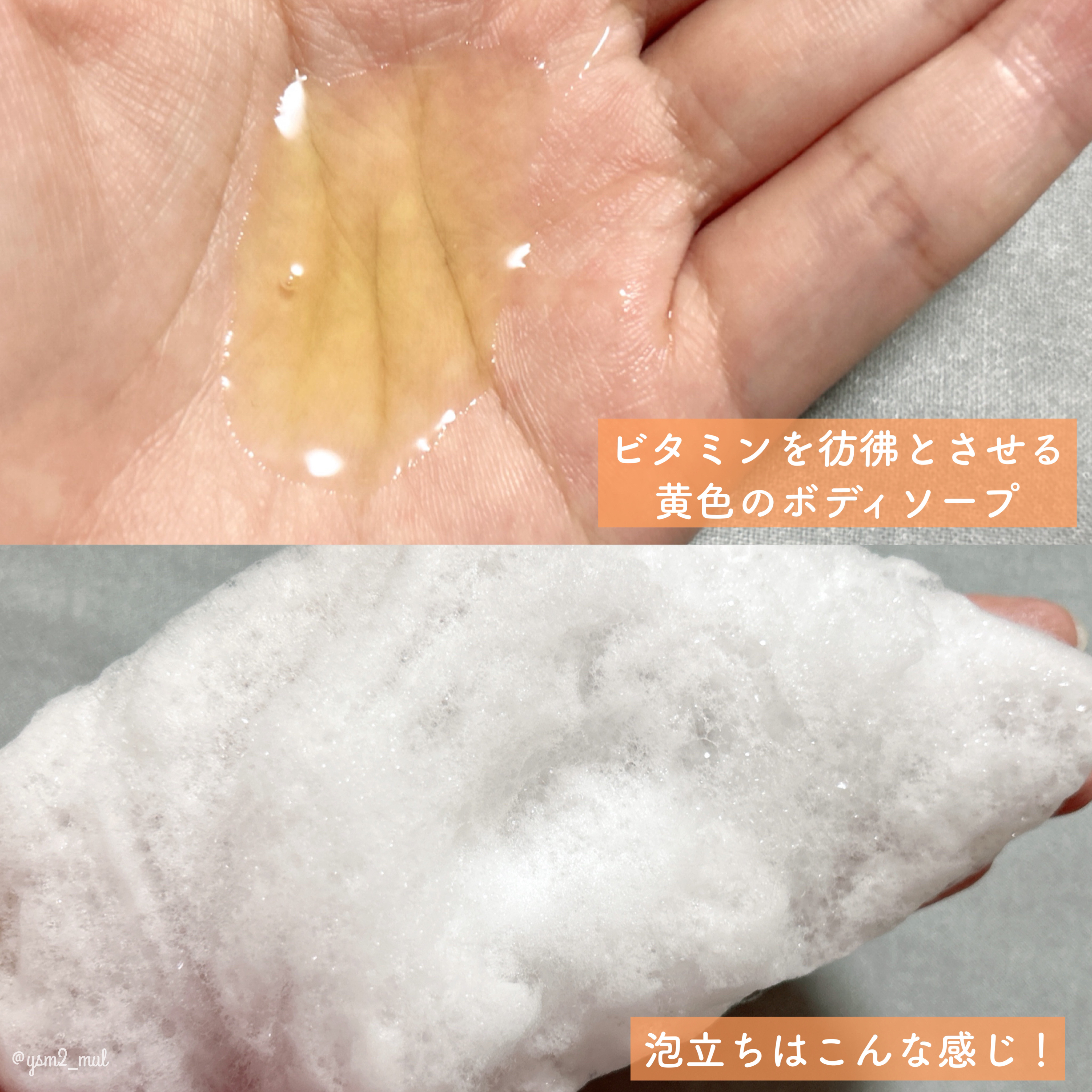 洗い心地スッキリ〜なボディソープ🌿 なんと100%天然由来の洗浄成分 7種類のビタミン、6種の植物エッセンシャルオイルで、ビタミンを効率よく取り入れられるように厳選された成分を配合!! 泡立ち良く、細かいふわふわな泡が全身包み込んでまさに全身ビタミンケア!