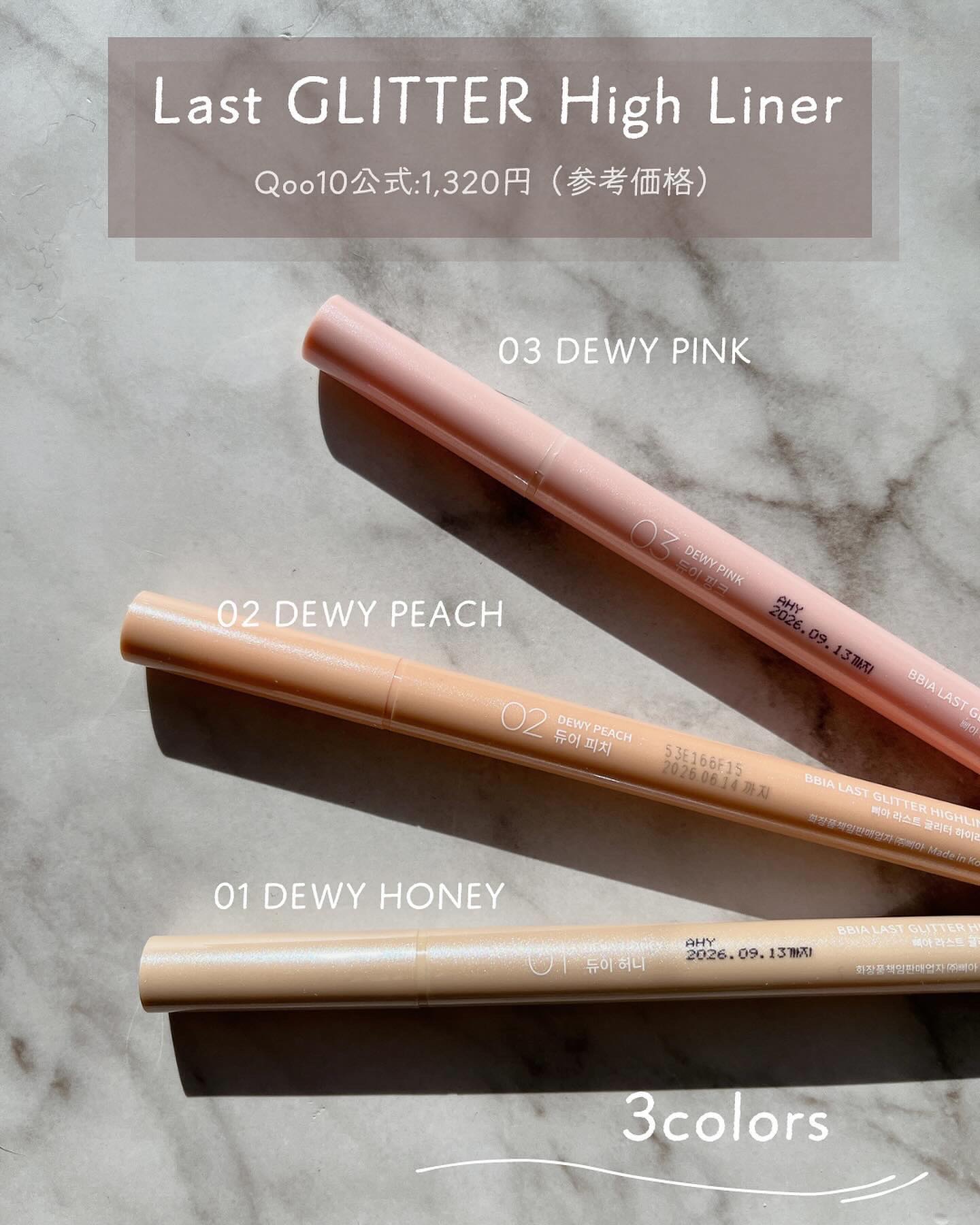 ブランド:BBIAビアー品名:ラストグリッターハイライナー色:01デューイハニー価格(税込み):1,320円・ロングラスティング効果・皮膚刺激性テスト済みペンタイプで使いやすいですし、すごく✨キラキラ✨しているので、私は下まつげの間に描いてま...