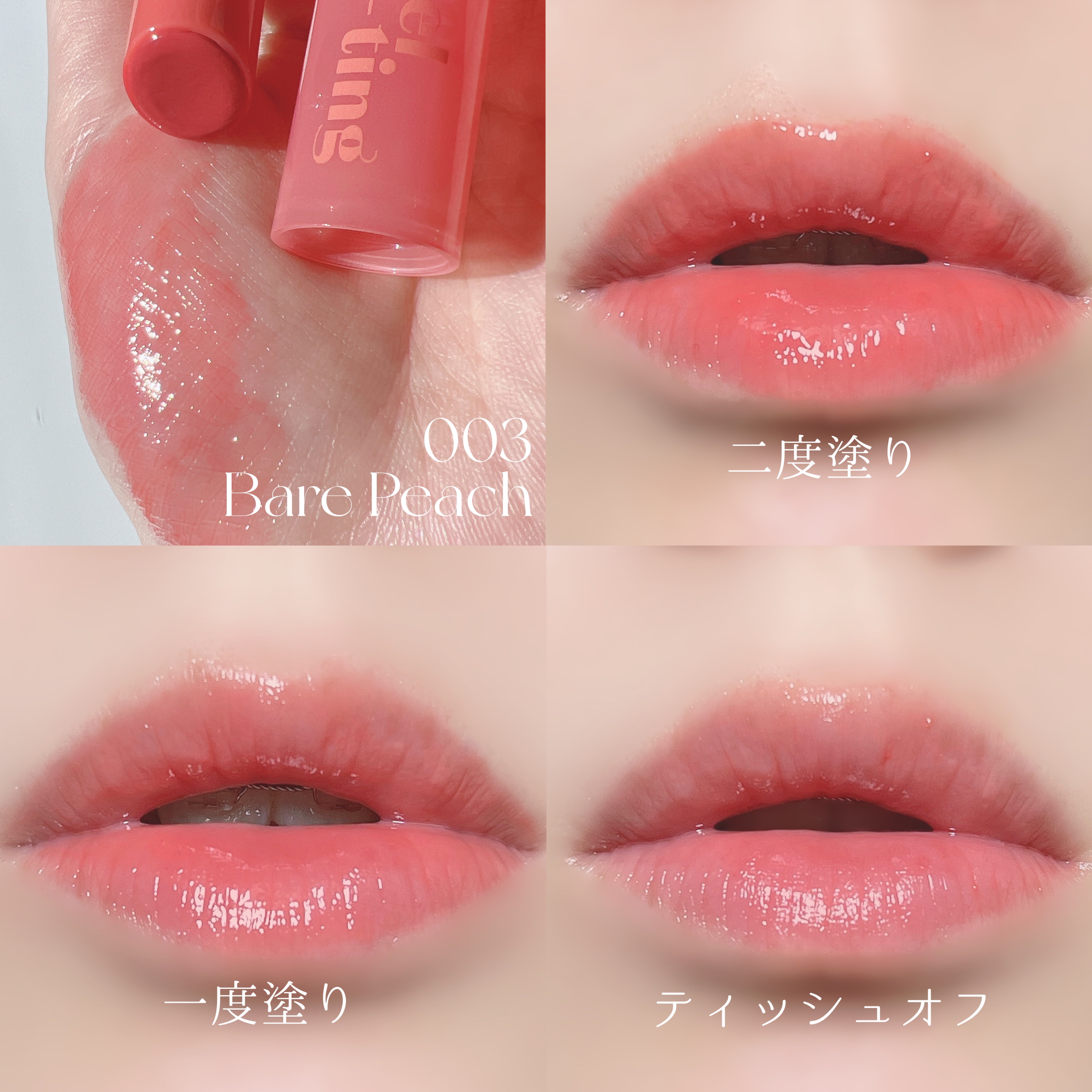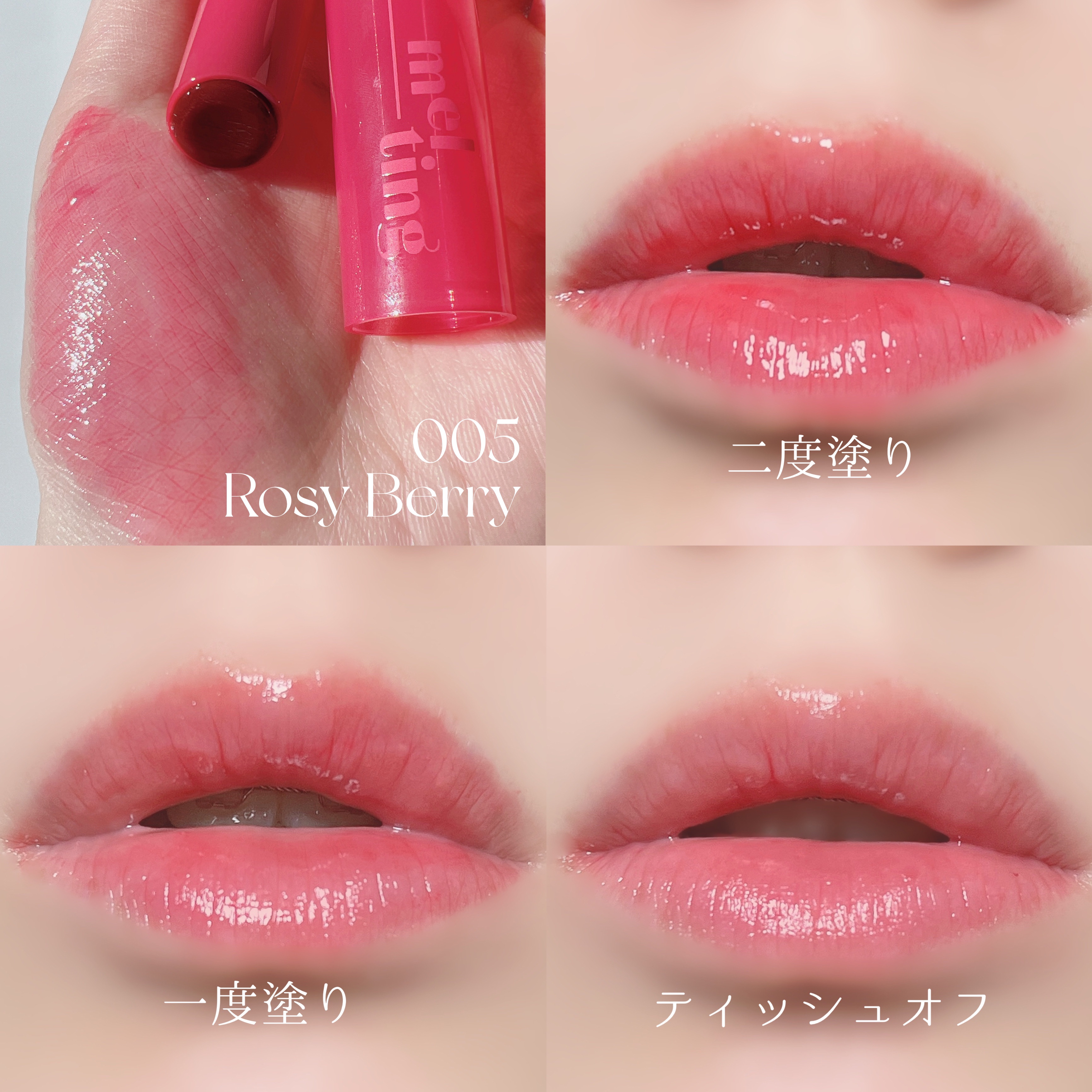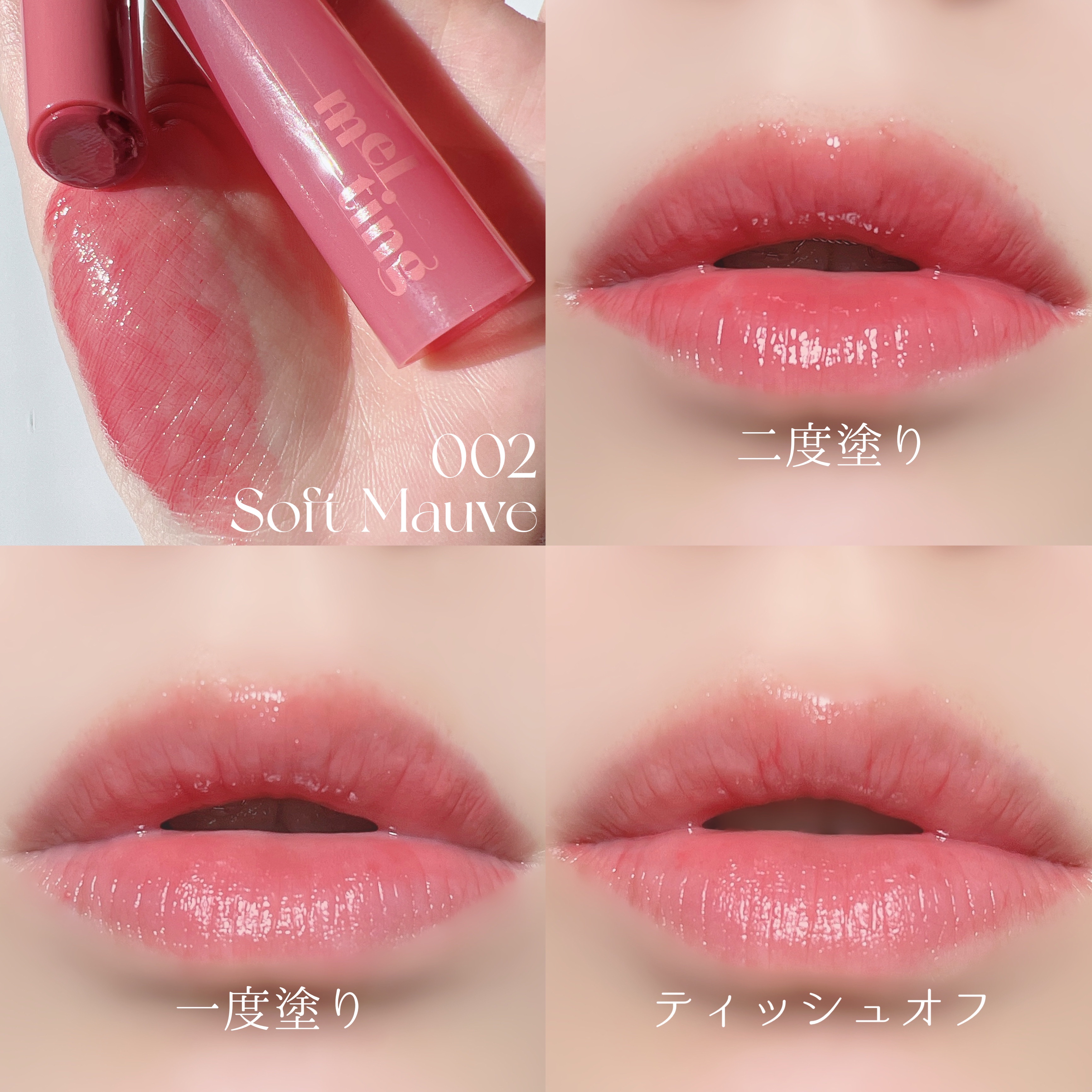 なめらかなつけ心地と落ちにくさすごい✨ ツヤっとしていて透明感もあり☺️ 膜を薄く張ったようなしっとり感で、 塗ってから60秒ほど待ち、 ティッシュオフしてもそのしっとり感は 残っている印象🌼 さらに色移りしにくい仕上がりでした🤍 食べたり飲んだりした時もフチだけ 色残り現象は特になかったです🌱 肌なじみのいいコーラルピンク💕 青みがかわいいモーヴピンクカラー💕 ほどよいテラコッタオレンジ系カラー🧡 青みのあるチェリーレッドカラー🌹 ブラウンレッド系のカラー🤎 ディープレッドカラー🥀