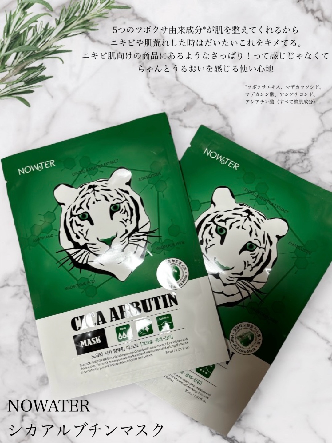 これ実は精製水を使わずにできているんだとか こだわりの成分たっぷりのノーウォーターコスメ トラのパッケージがインパクトある ティーツリー由来成分*3配合 ティーツリー葉油とティーツリー葉水で肌のうるおいバランスを整えてくれるみたい ビタミン&青みかんエキス*1 肌荒れをケアするビタミンとイキイキと肌をいきいきと整える青みかんエキス*1 5つのシカ成分*4と5つのツボクサ由来成分*4配合、お肌を整えてくれるみたい 薄手でぴったりと肌に密着するマスクで美容液たっぷり