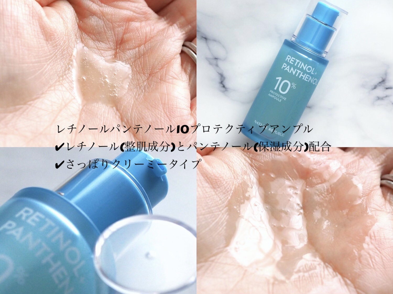 ぷるぷるプリンのような肌を実現! ネイリパ新作の攻守レチパン美容液。攻めのレチノール(整肌成分) ×守りのパンテノール (保湿成分)を効果的に組み合わせたアンプル。 程よいとろみでお肌に馴染ませやすいテクスチャ。フローラルの香りがお気に入り♡ レチノールとパンテノールを合わせることでお肌を守りながら弾力ケア、毛穴ケアができるので、レチノール初心者さんにもおすすめ。