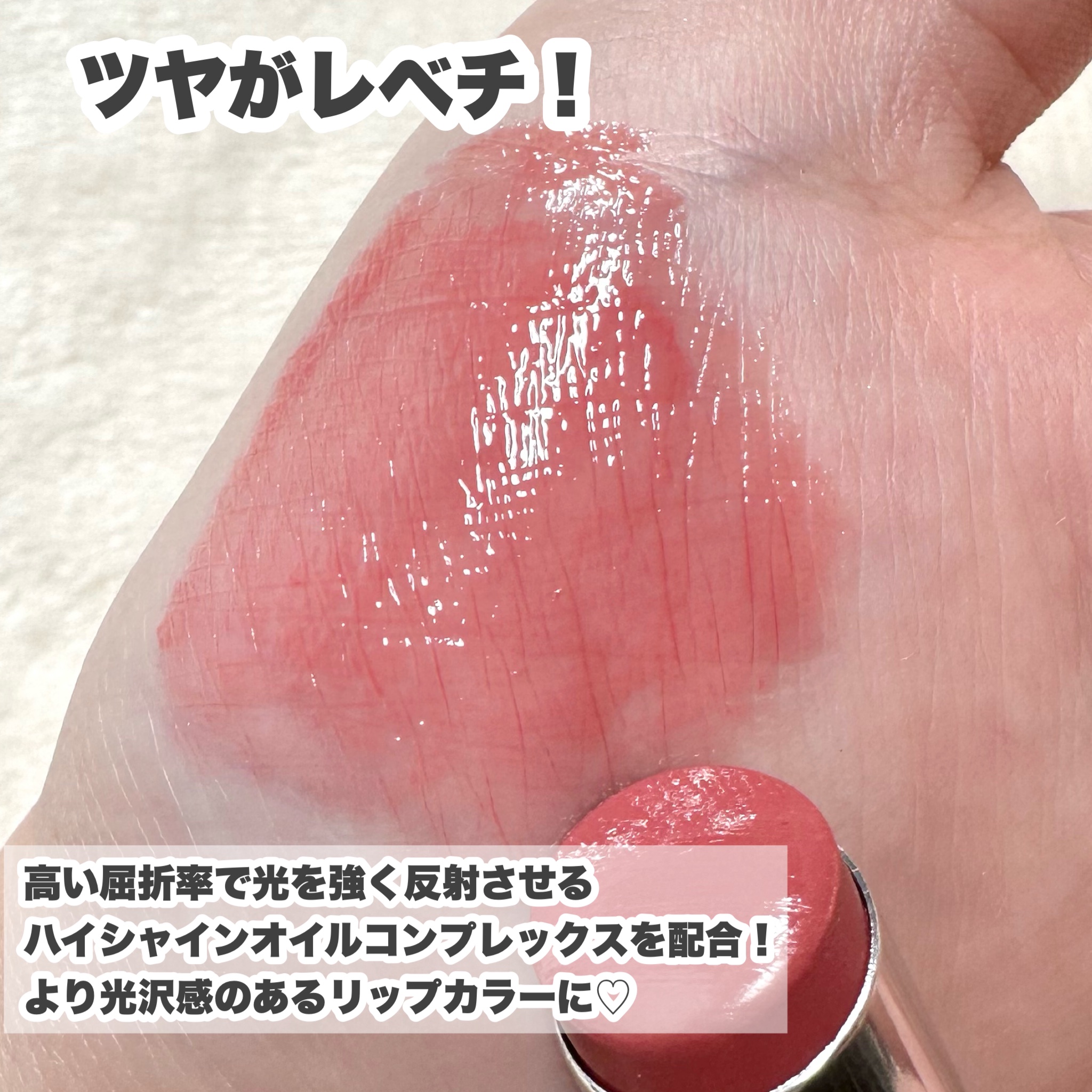 透明?青っぽいキラキラしてるからつけたらちゅるんちゅるんのパール系かな?って思って買ってみた。。。 めっちゃくちゃに可愛いピンクーーー!!これ体温によって変わるヤツやった 自然由来の保湿成分を約57%配合し、長時間しっとり、ガラスが輝くような唇へと導きます。