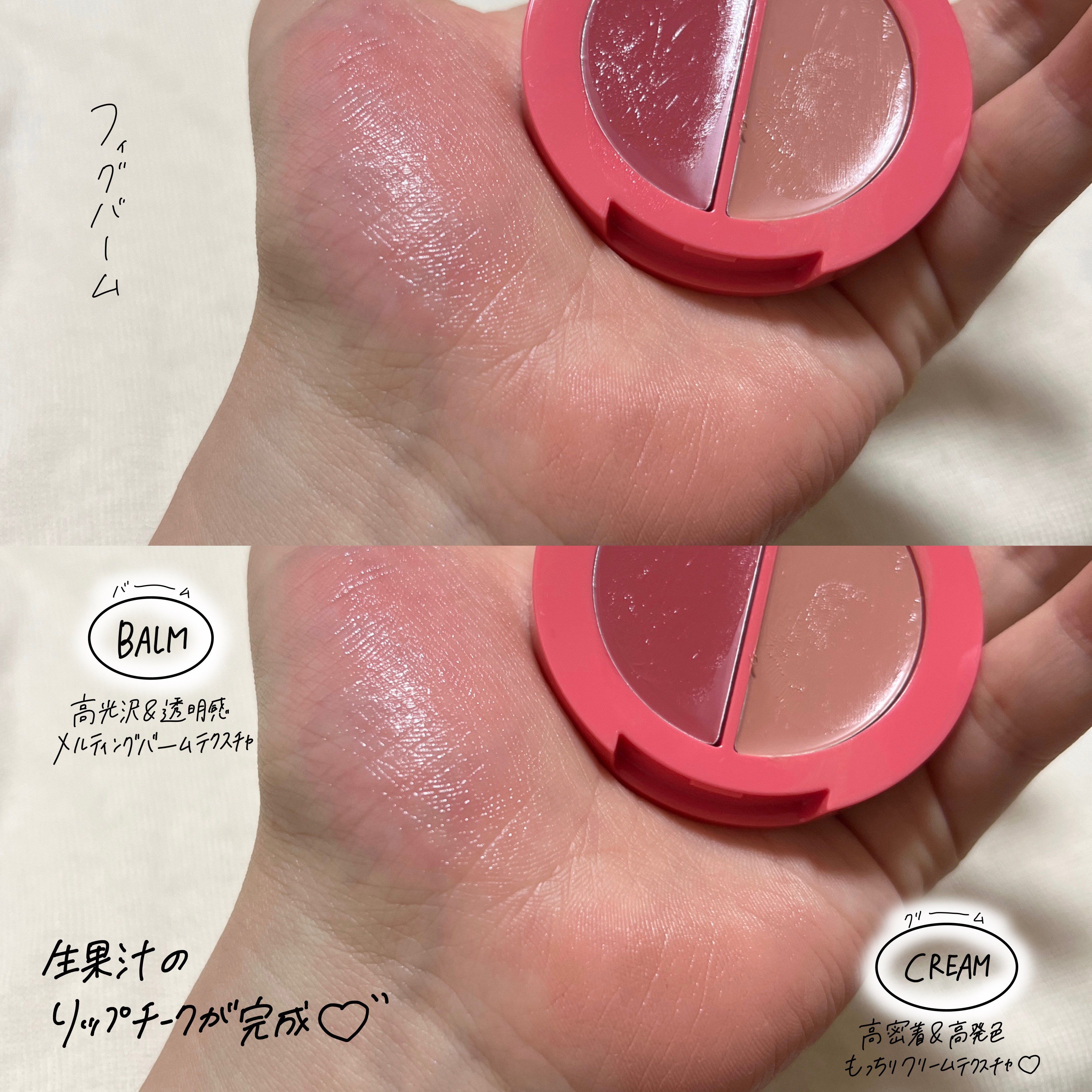 - みずみずしく爽やかな生果実の果汁にダイブ! フレッシュな果実にインスピレーションを受け誕生した みずみずしく爽やかな生果汁ツヤを完成させる リップ&チークヘルシーバーム フィトコラーゲン, モモセラミド配合 70%エッセンスのクリーム&バーム 2つにカラーが透けぷるんと重ね合い 血色感とツヤ感MAX!